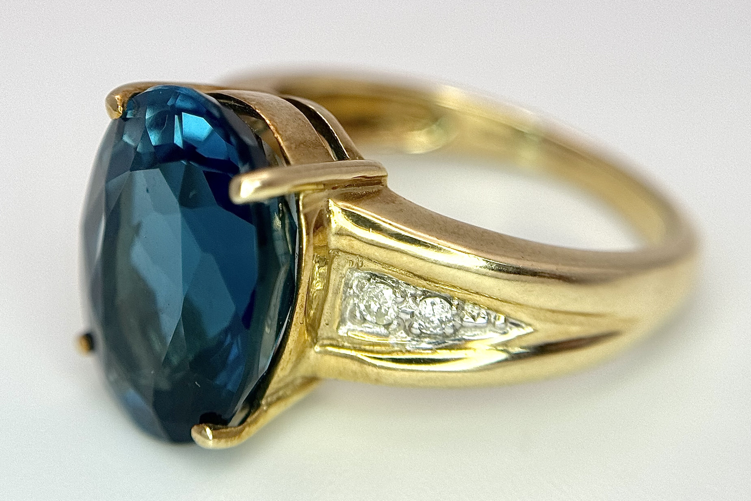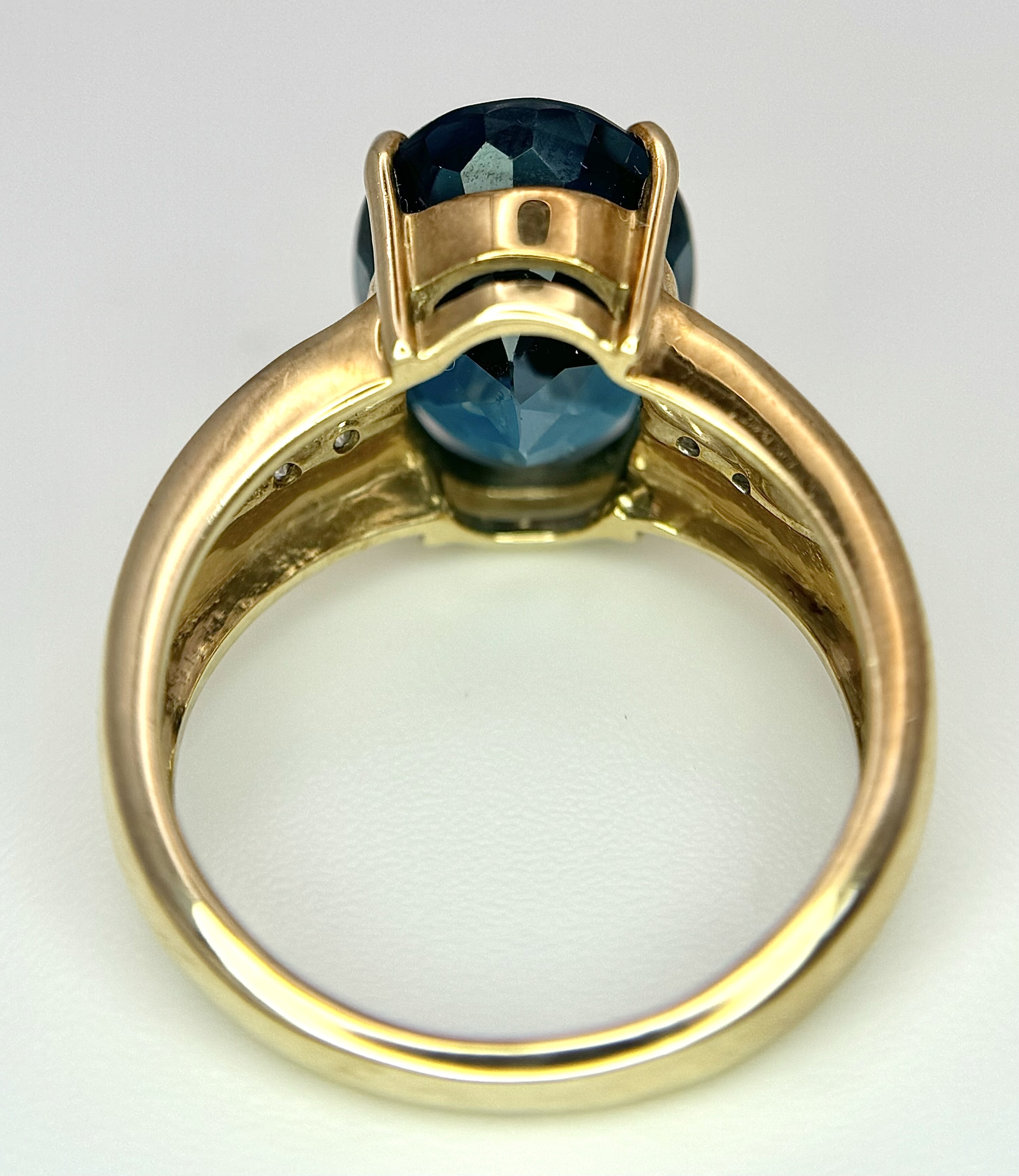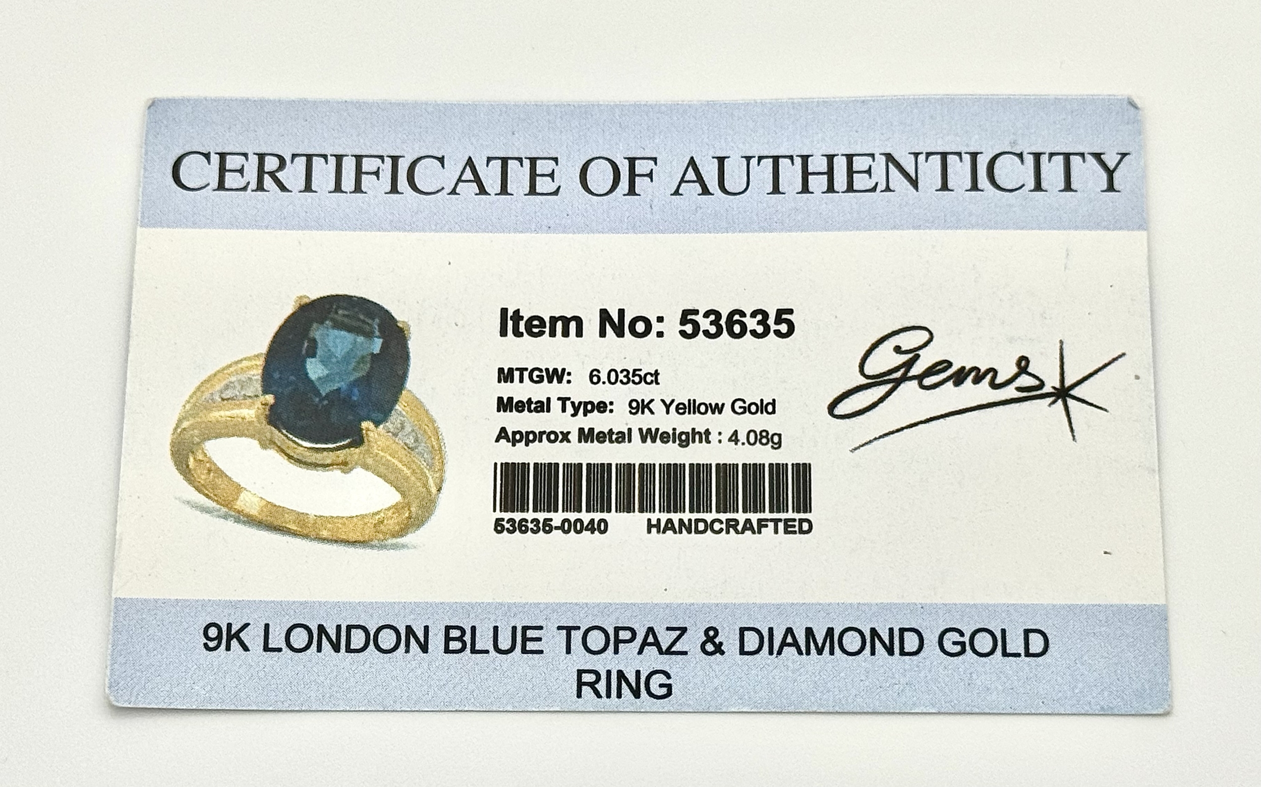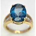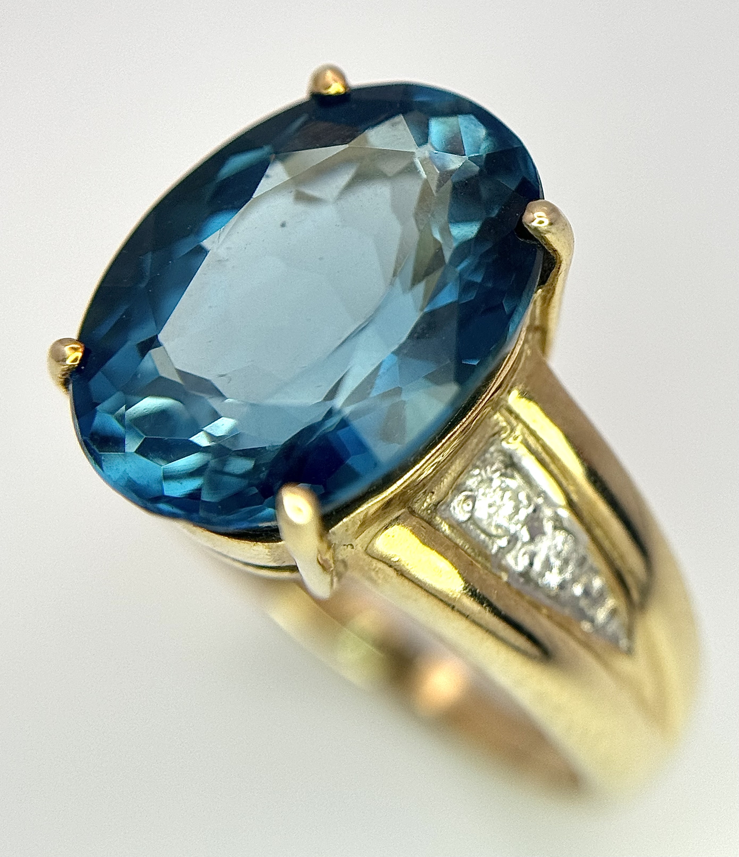 A 9K Yellow Gold, London Blue Topaz and Diamond Ring. A 5.979ct, oval cut topaz with 0.056ct of Diamond Accents. Size N. 5.65g total weight. NL- 0000. Comes with a certificate of authenticity.