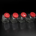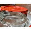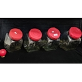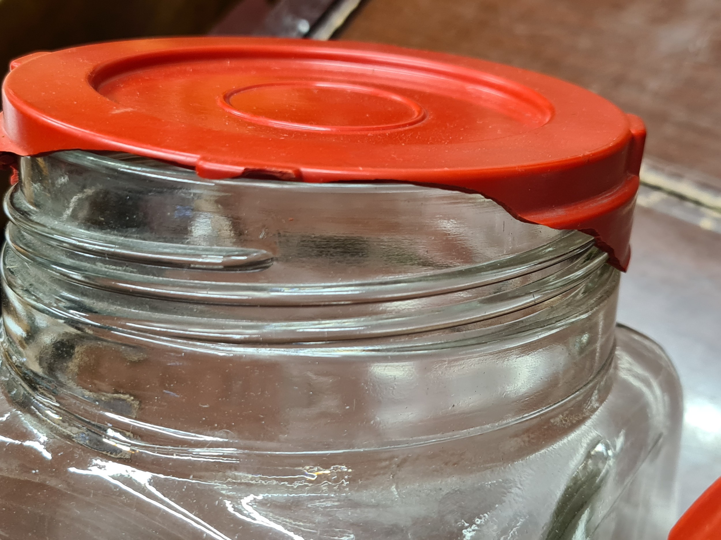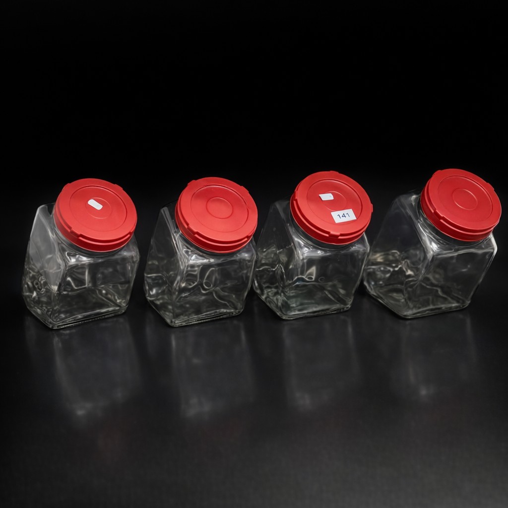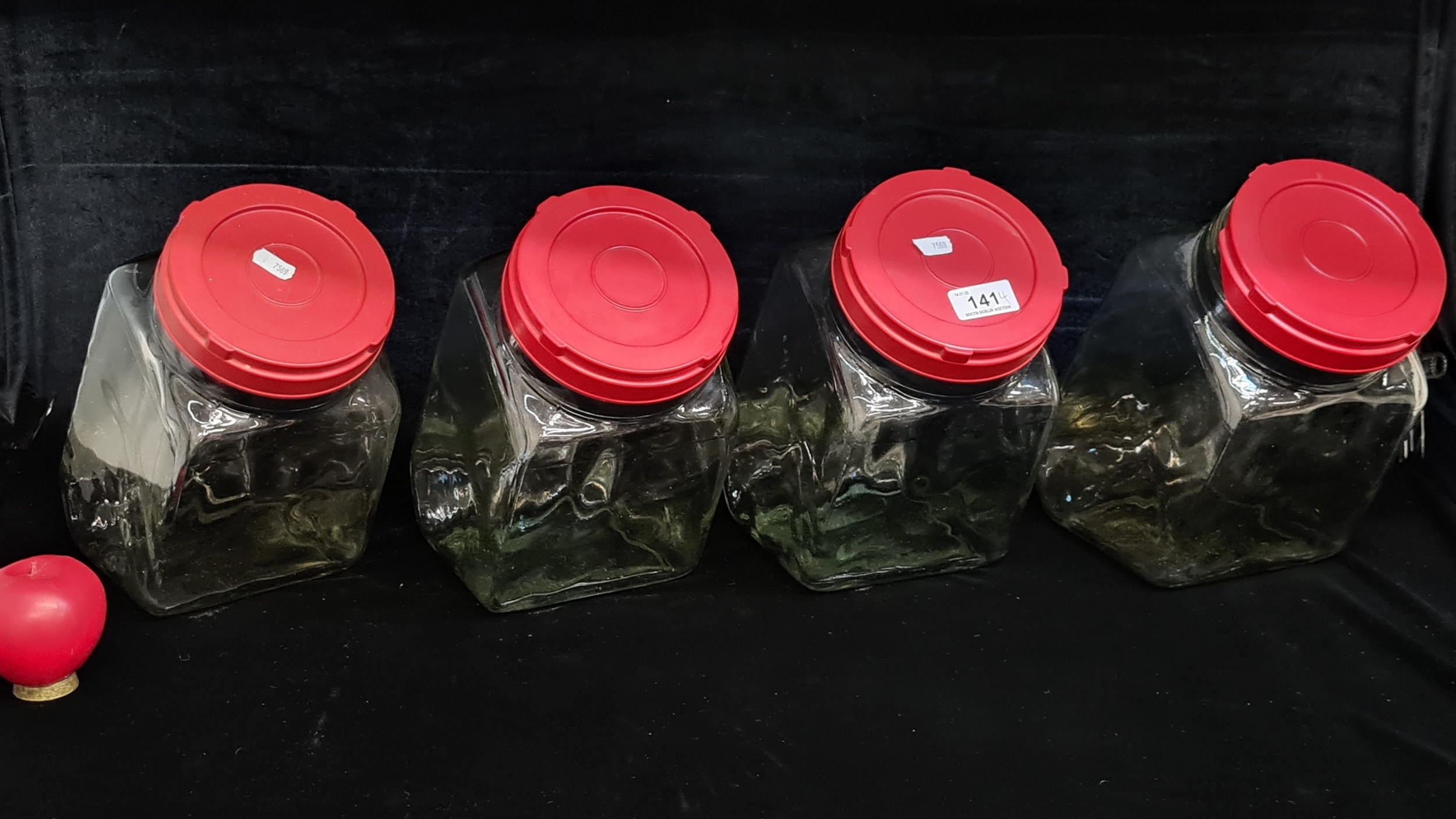 Four vintage handblown thick large lidded sweet storage jars unusual triangular shape . Glass All in good condition one lid has edge loss but still closes properly.