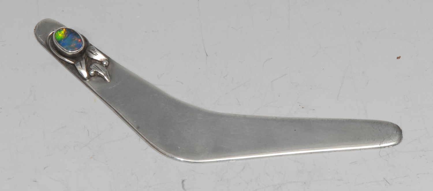 An Australian silver novelty bookmark, as a boomerang, set with an opal, 11.5cm long, retailed by W J Proud, Sydney, c.1925