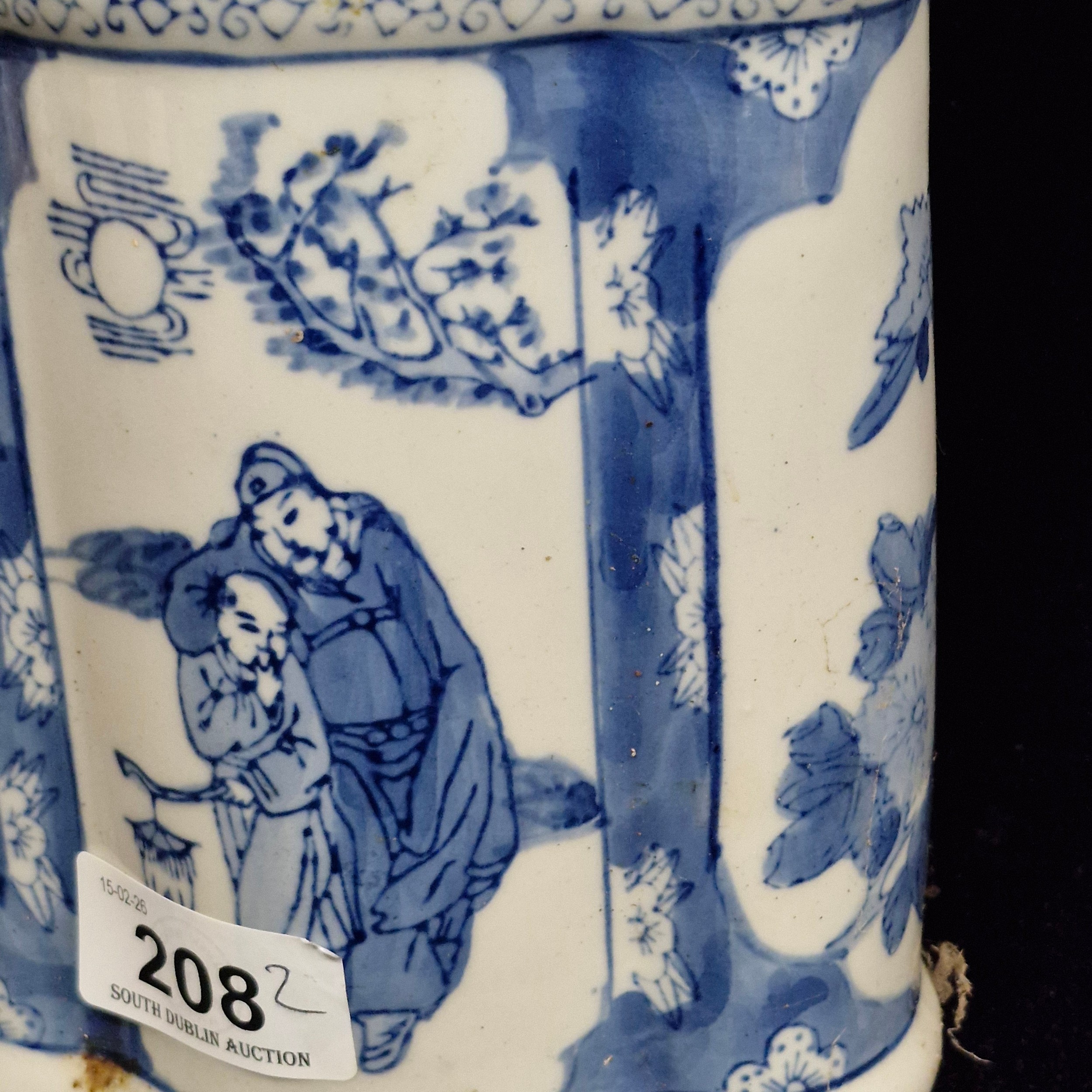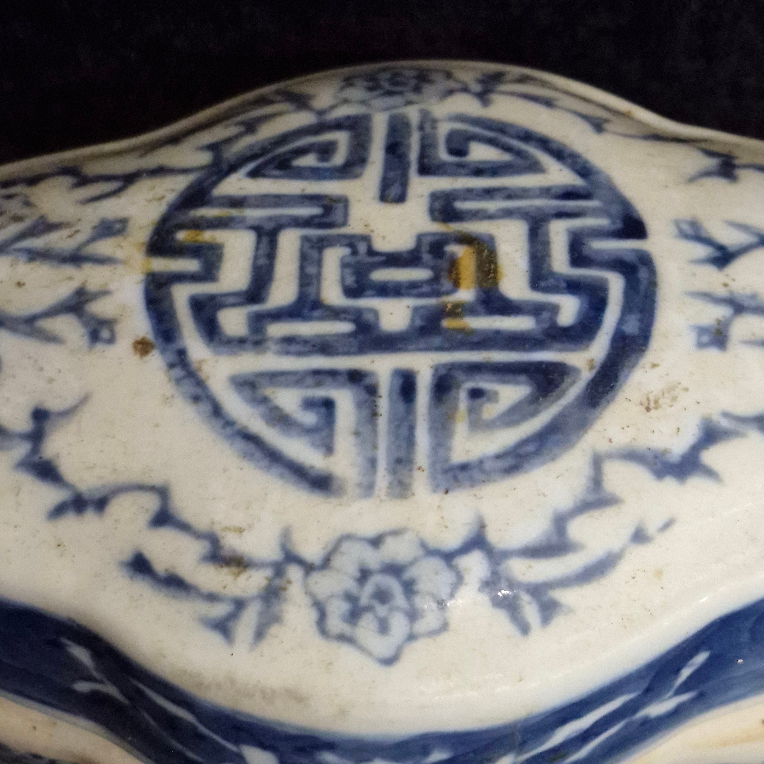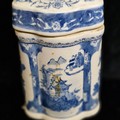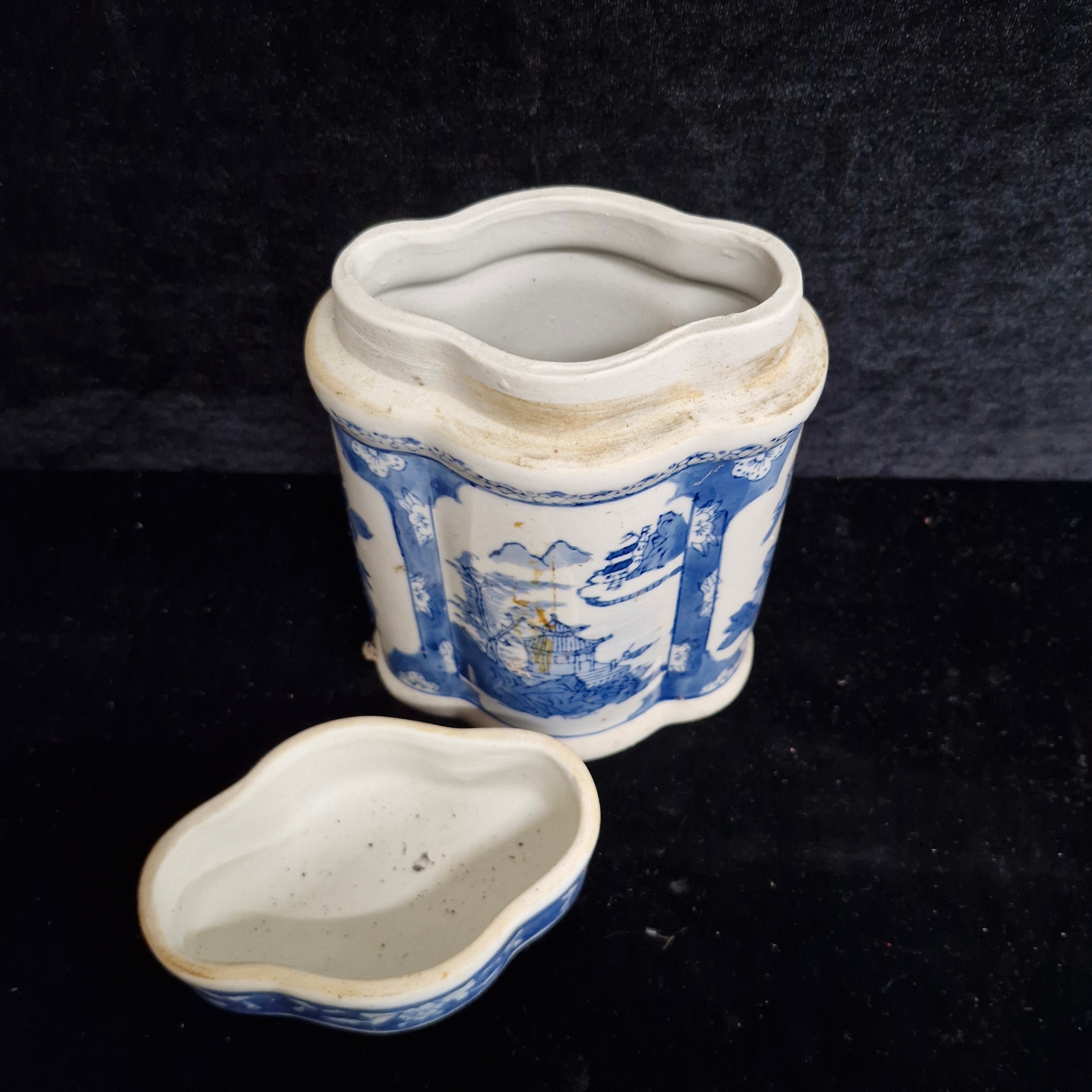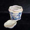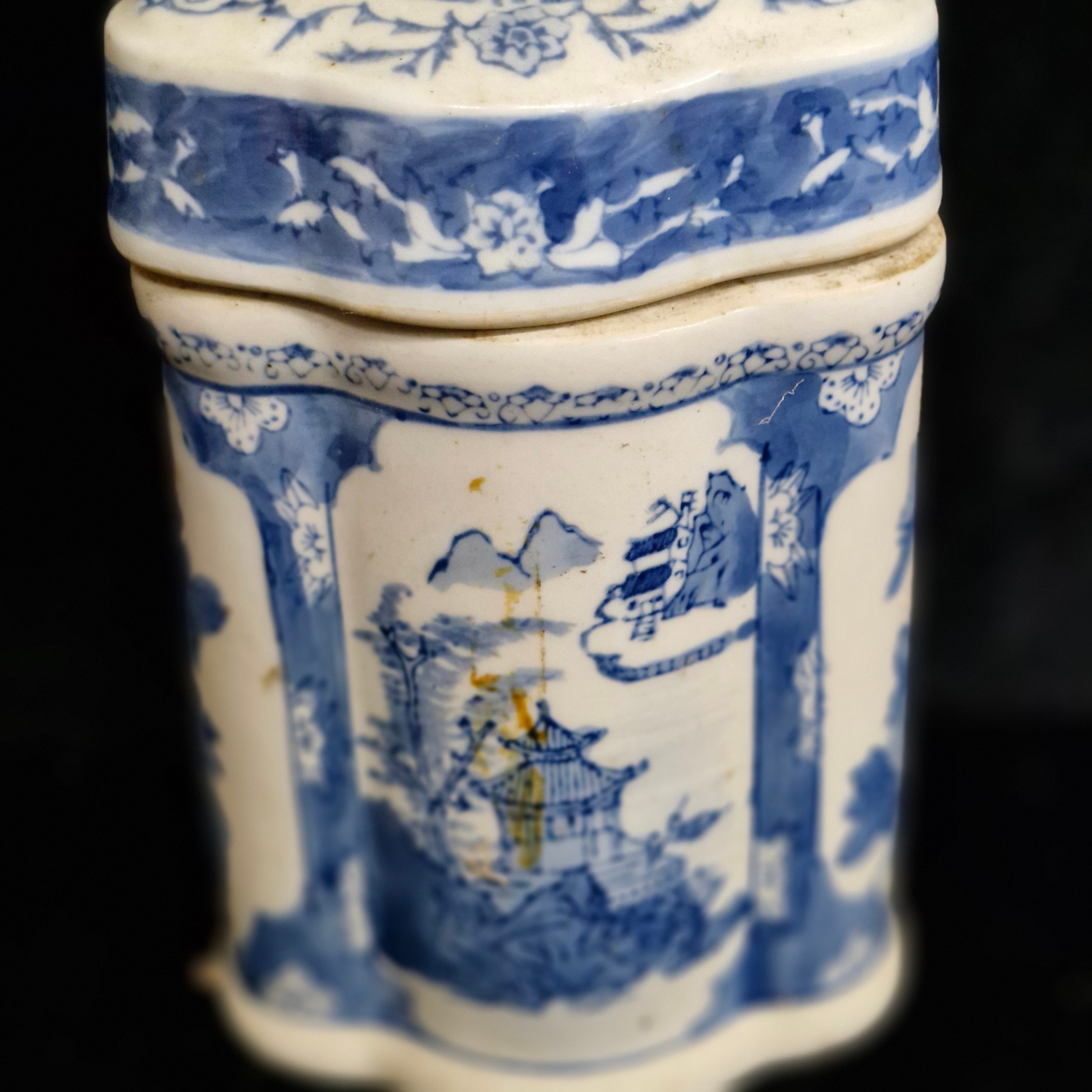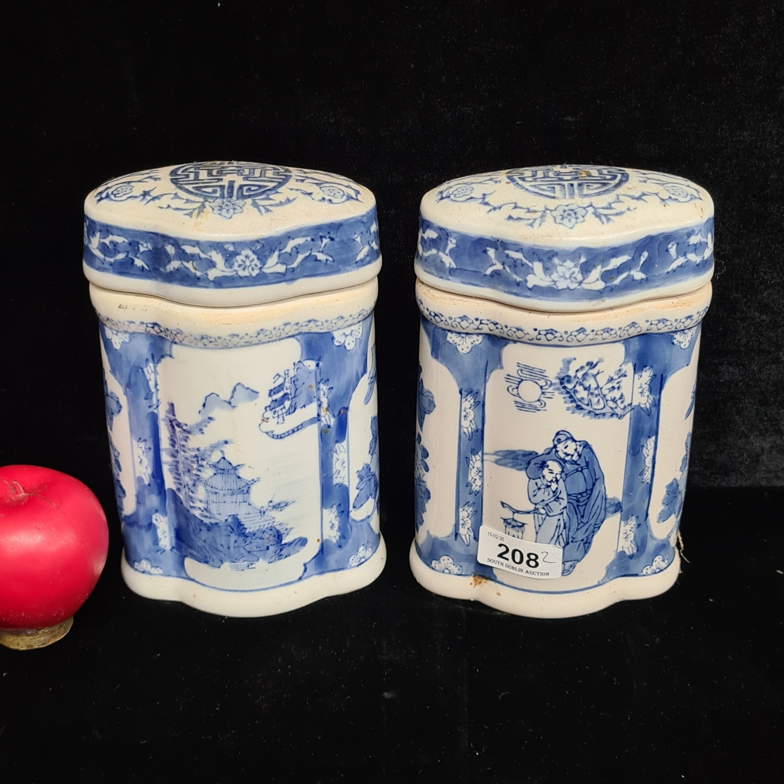 A beautiful pair of hand painted porcelain blue and white Chinese tea canisters. Marked to base and dating to 1900-1940.