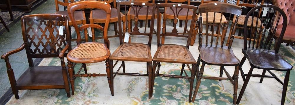 A pair of early 20th century mahogany side chairs, the shaped splat inlaid with oval batwing paterae; a Victorian mahogany side chair; a 20th century elm side chair; others (6)