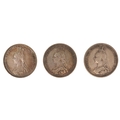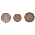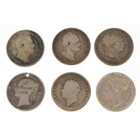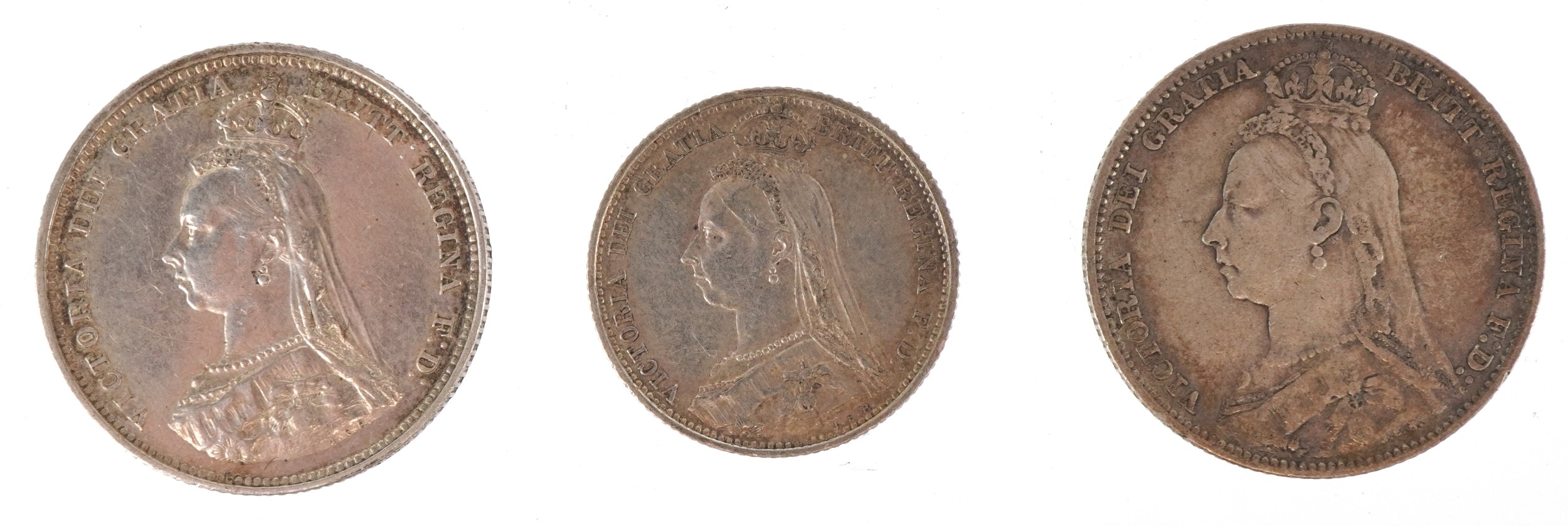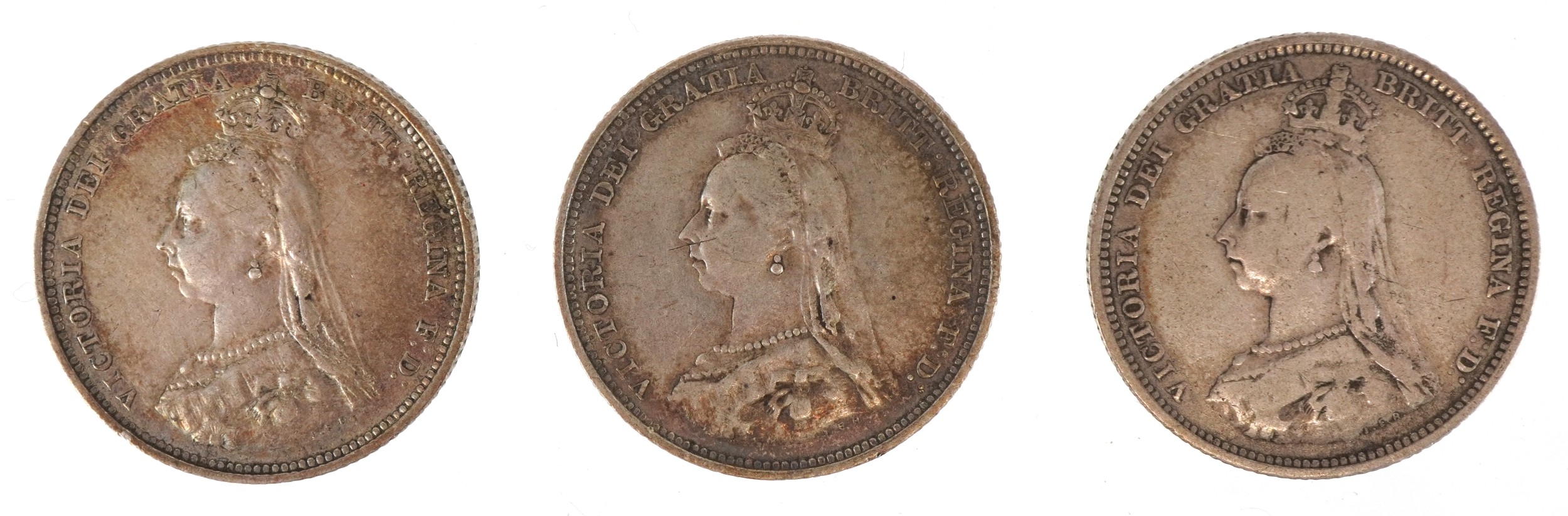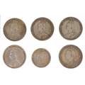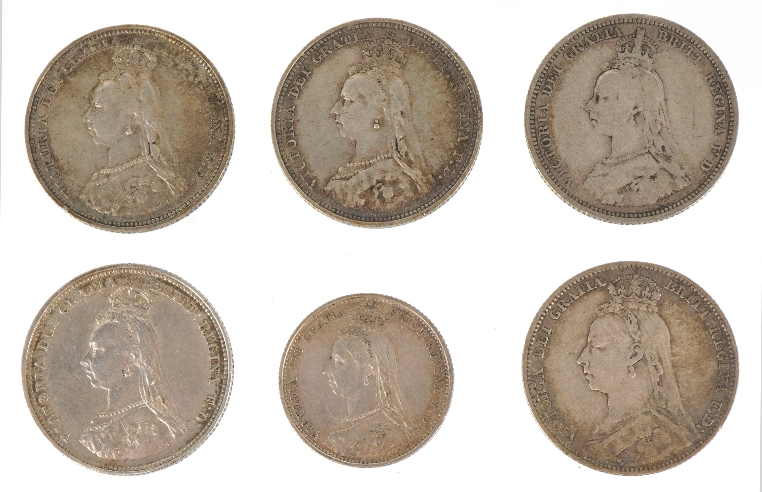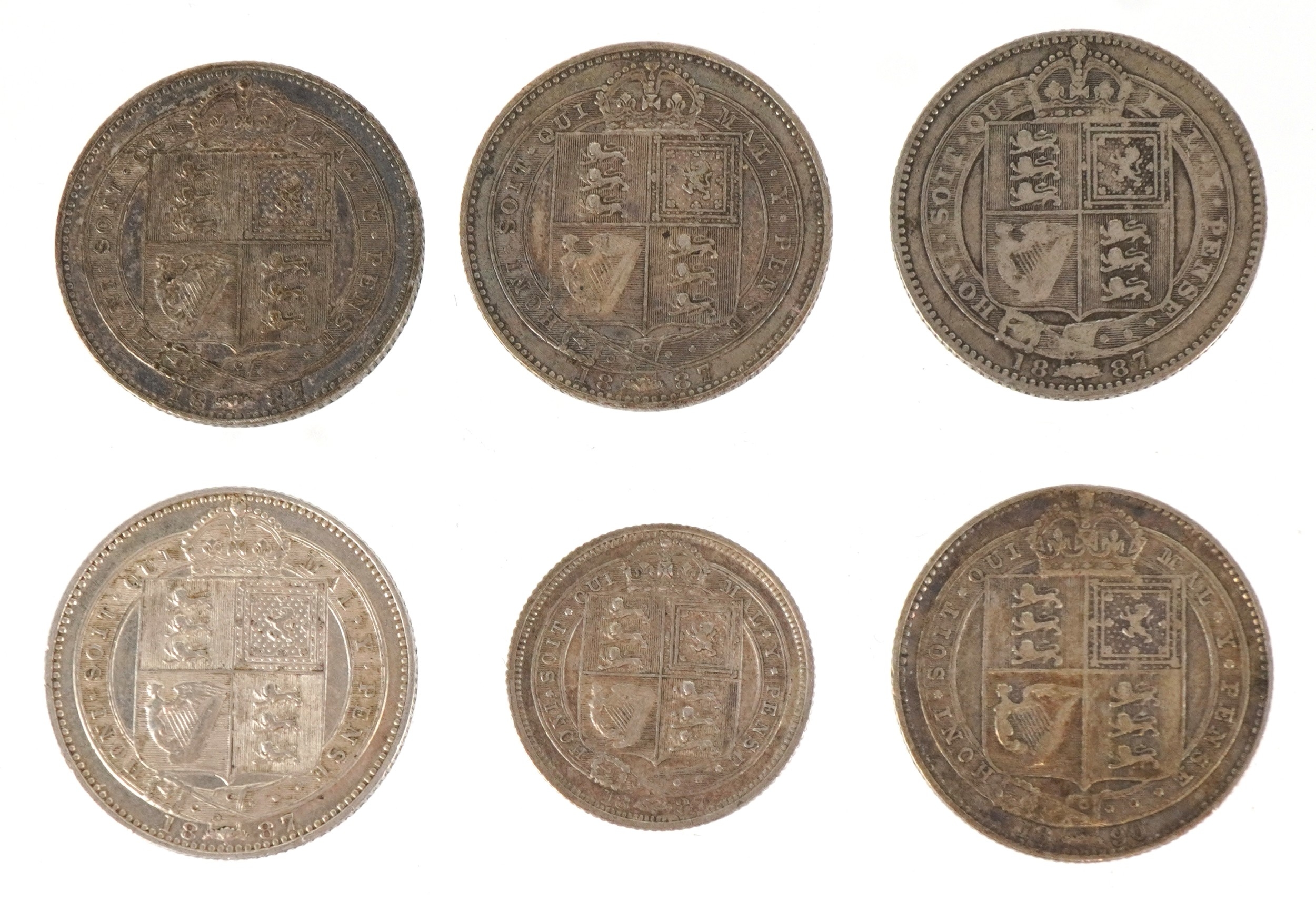 Six British 19th century silver coins comprising four 1887 Golden Jubilee shillings, an 1887 Jubilee sixpence and an 1890 shilling.