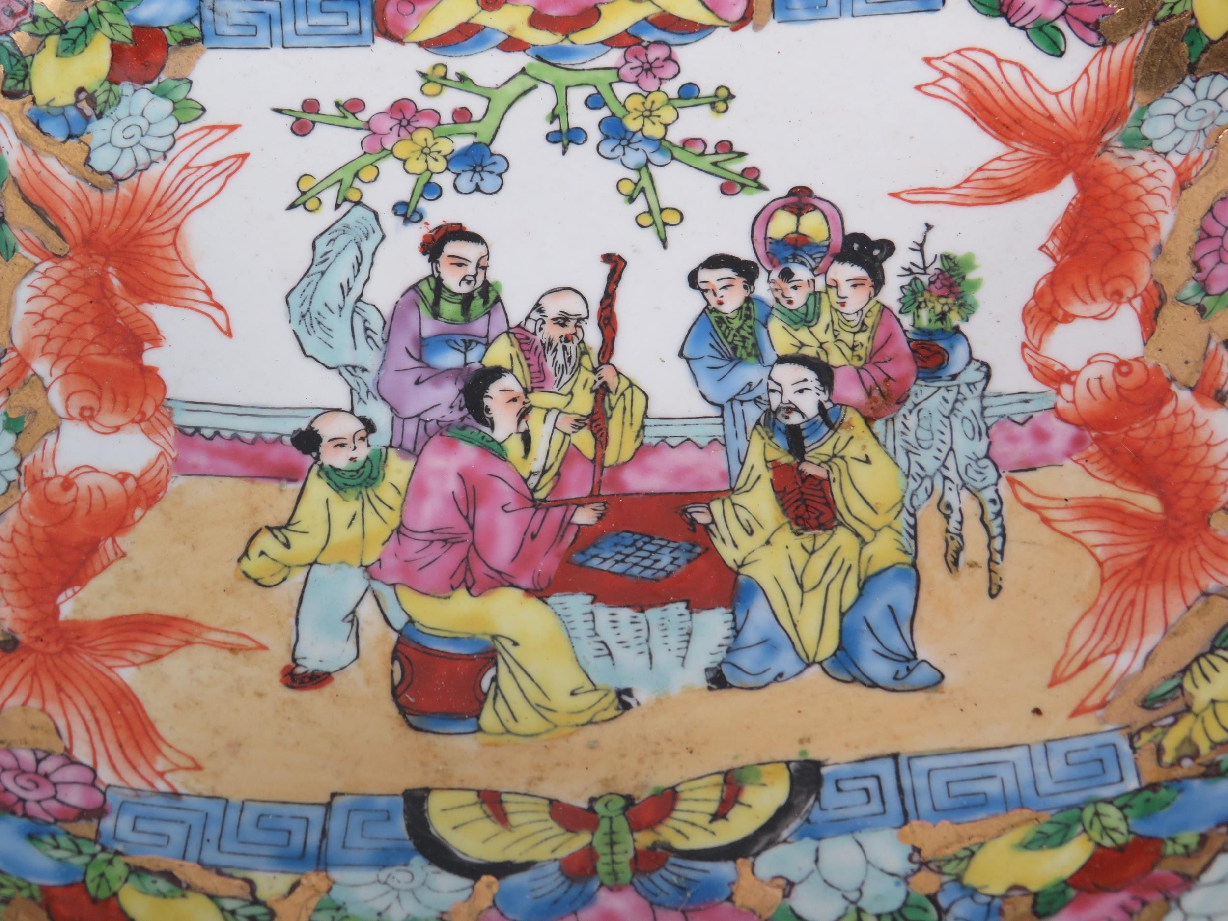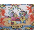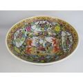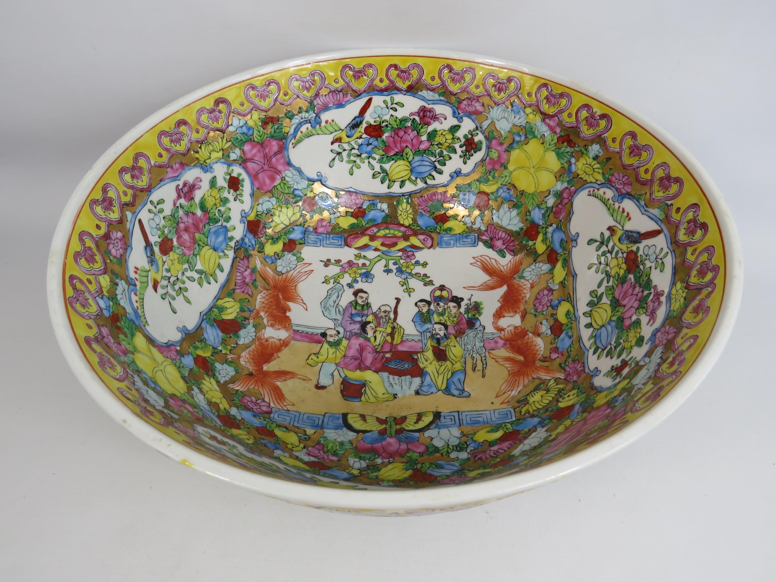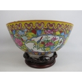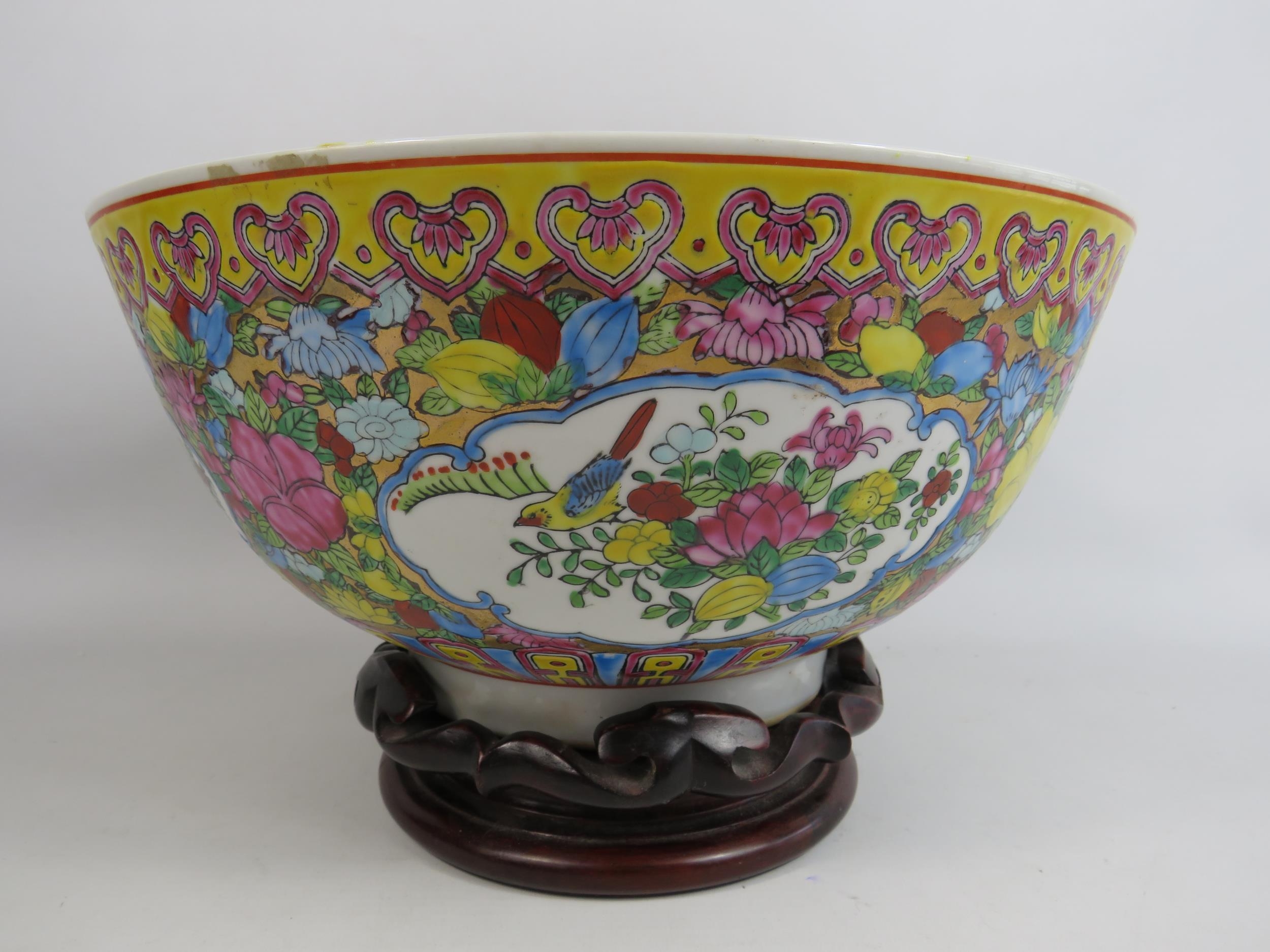 Large chinese Famille rose style bowl standing on a rosewood base. 7" Deep and 12" Diameter. chip on rim.