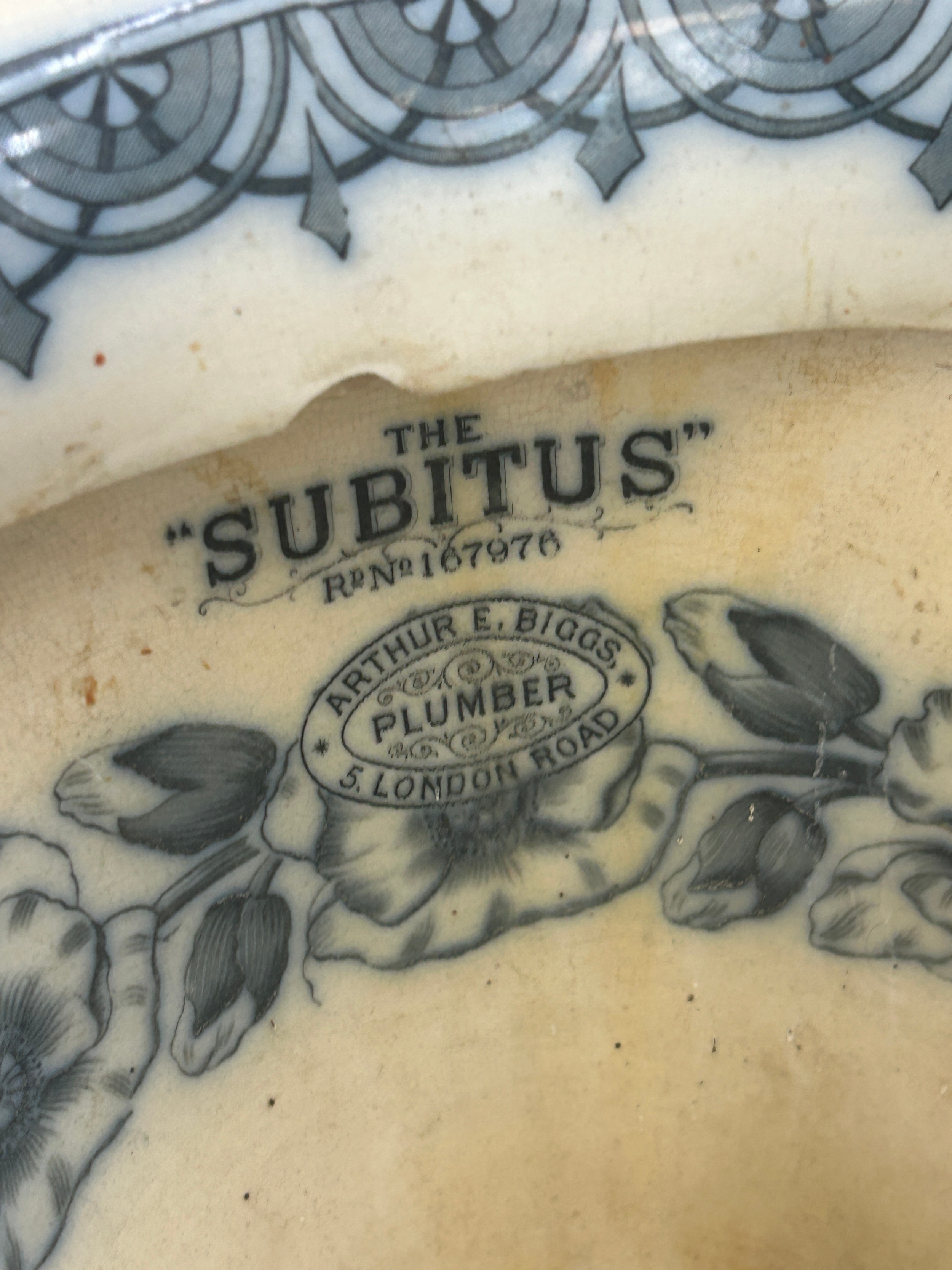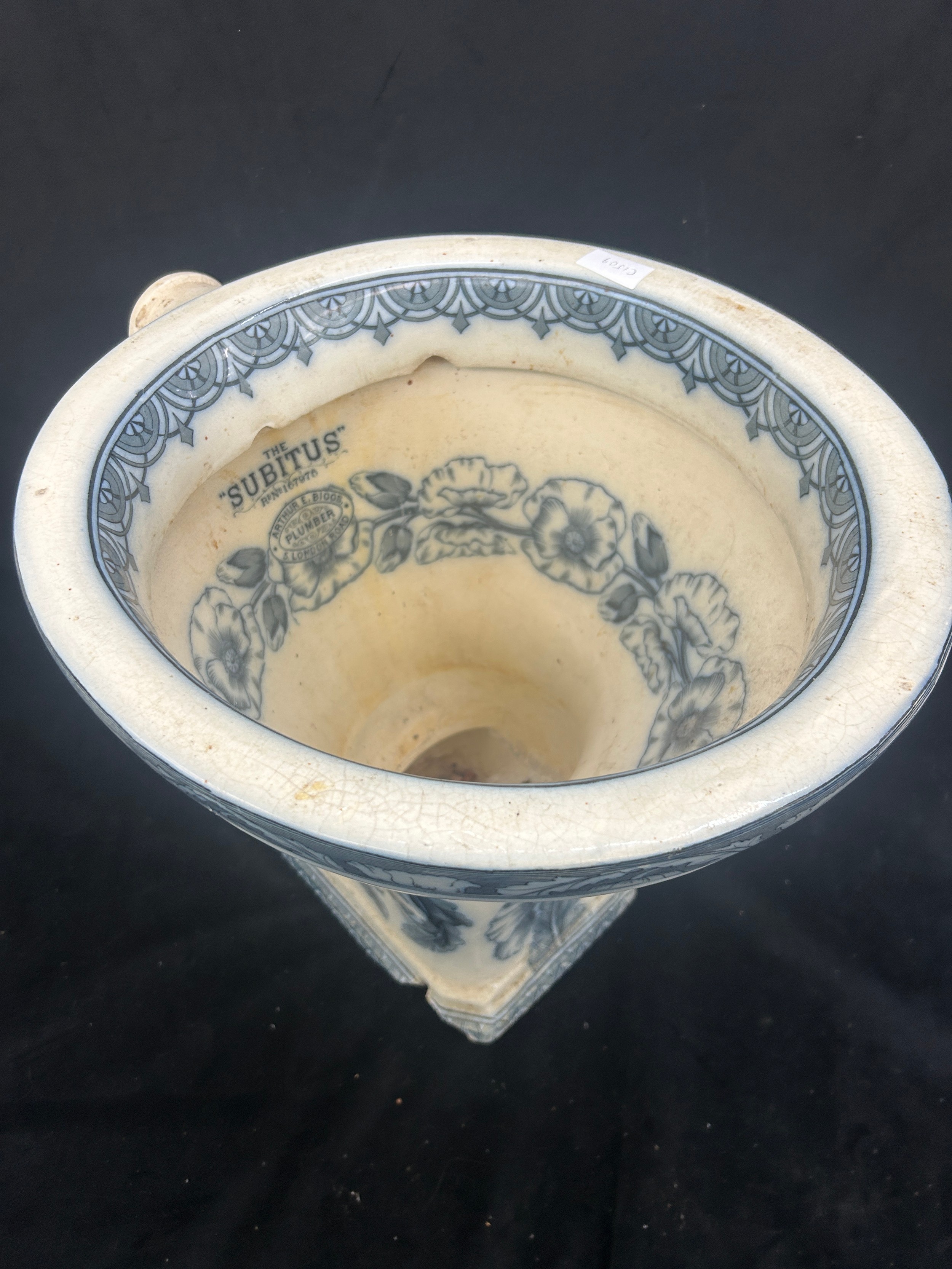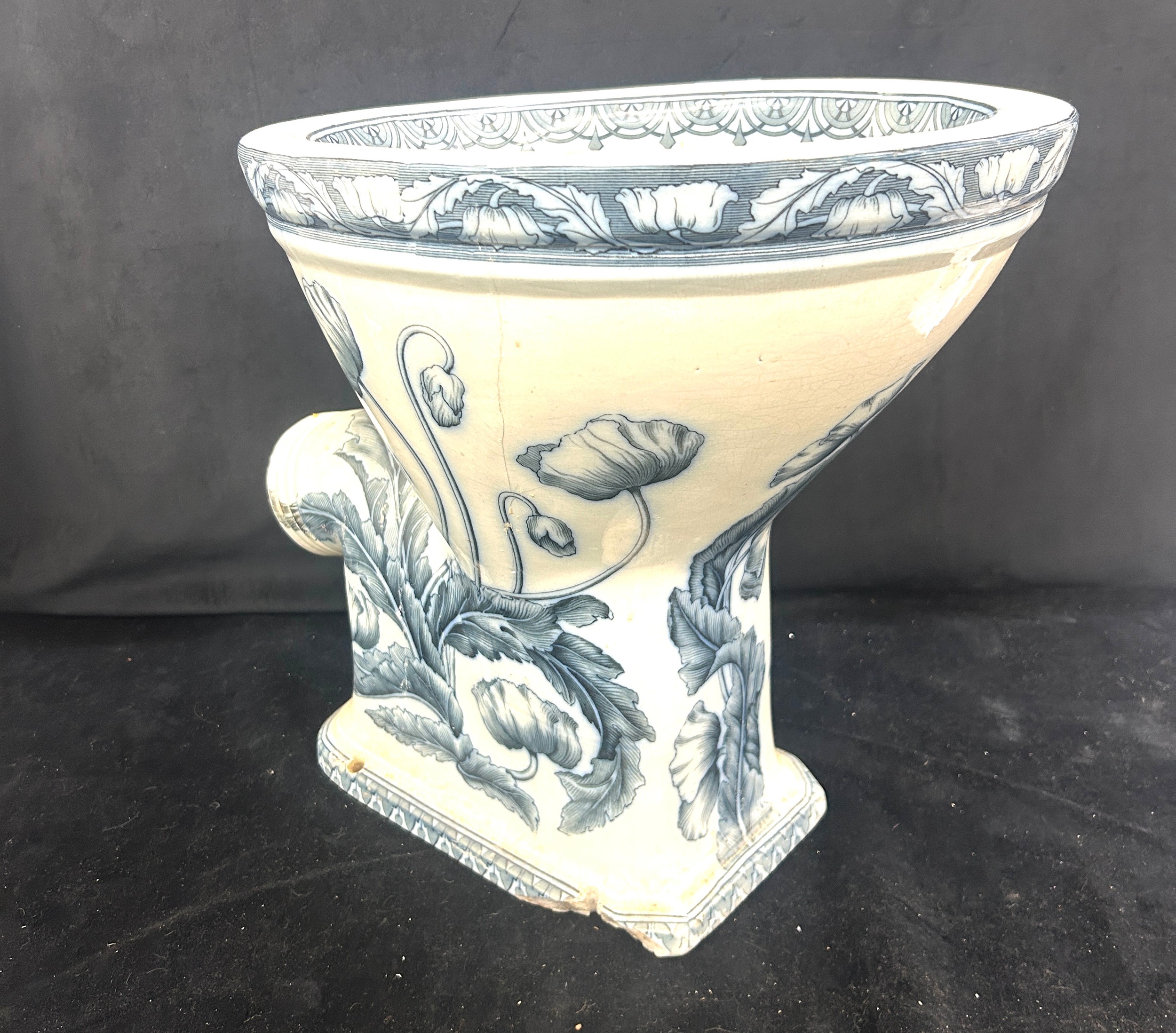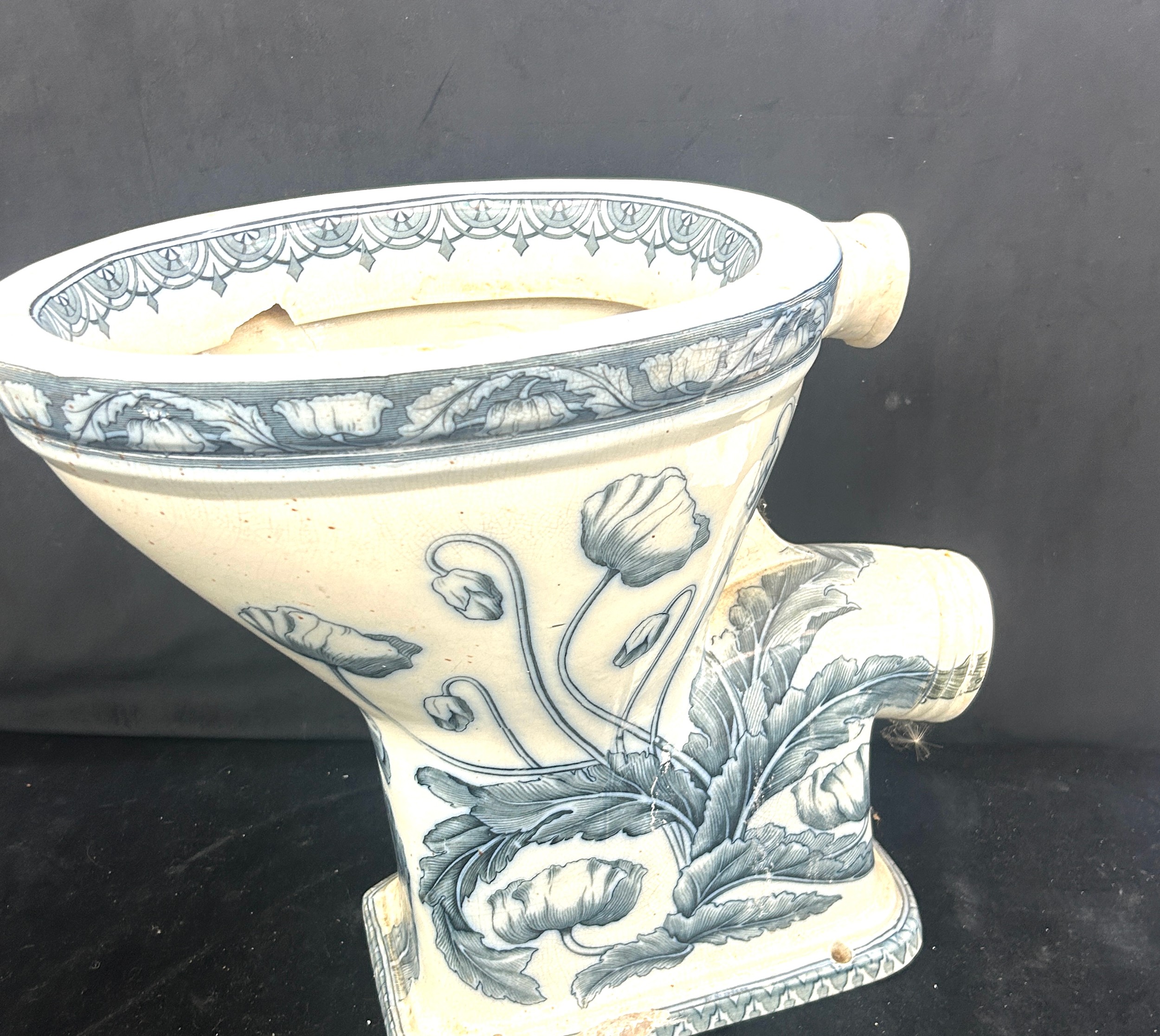 Flow blue subitus toilet made by Arthur E Briggs damage to base, art nouveau style height 17 inches tall