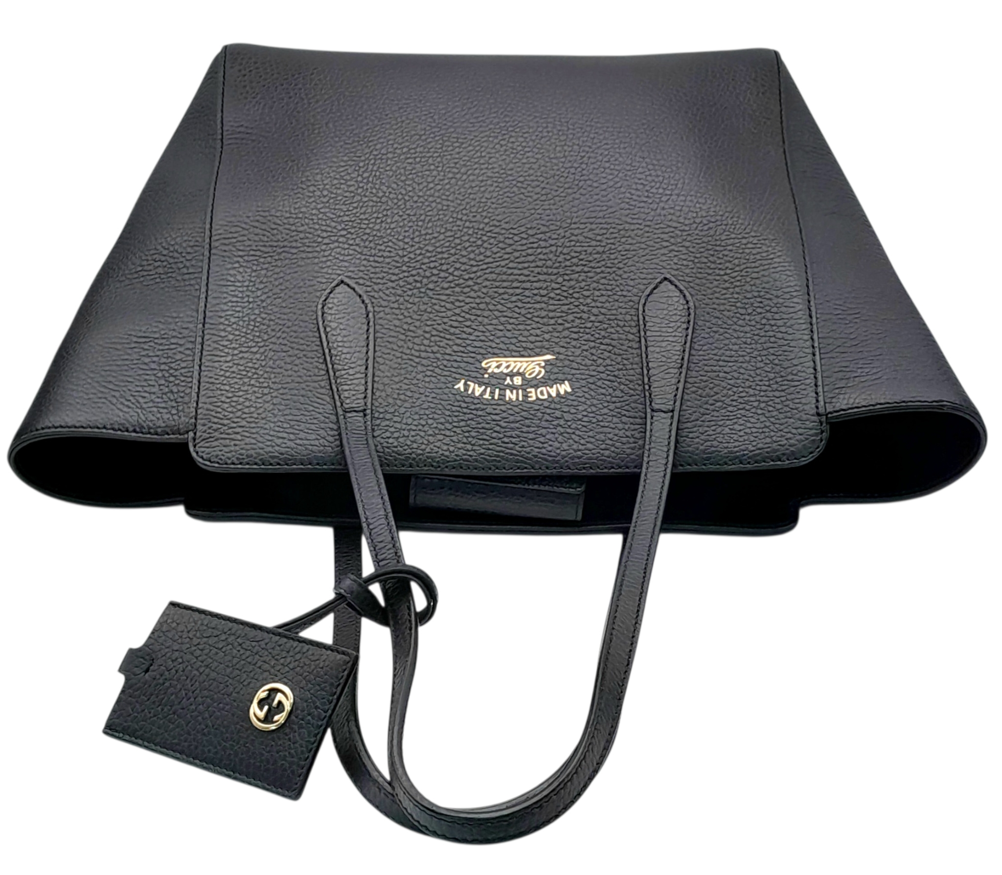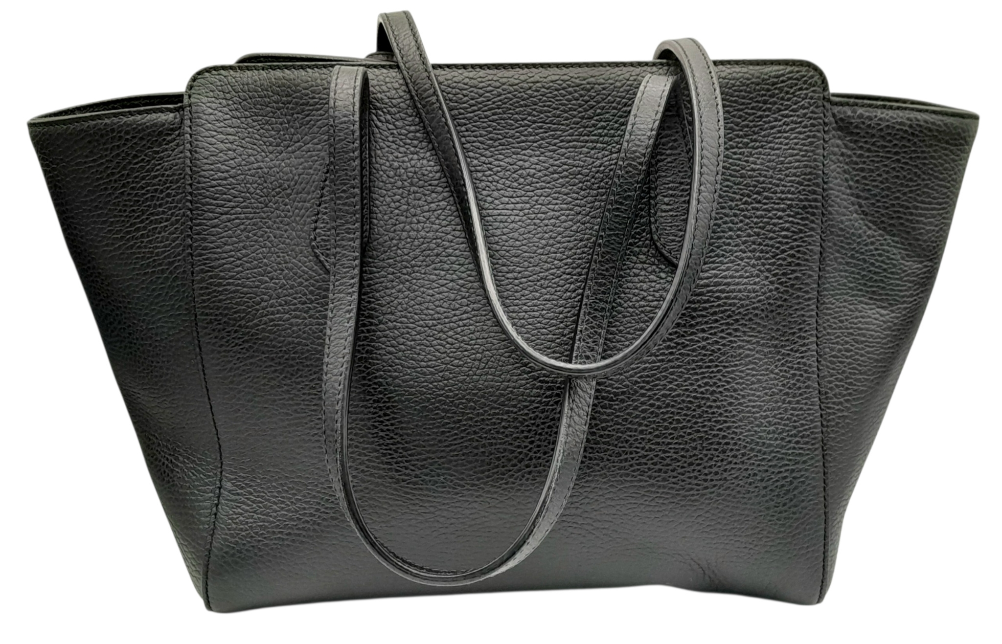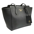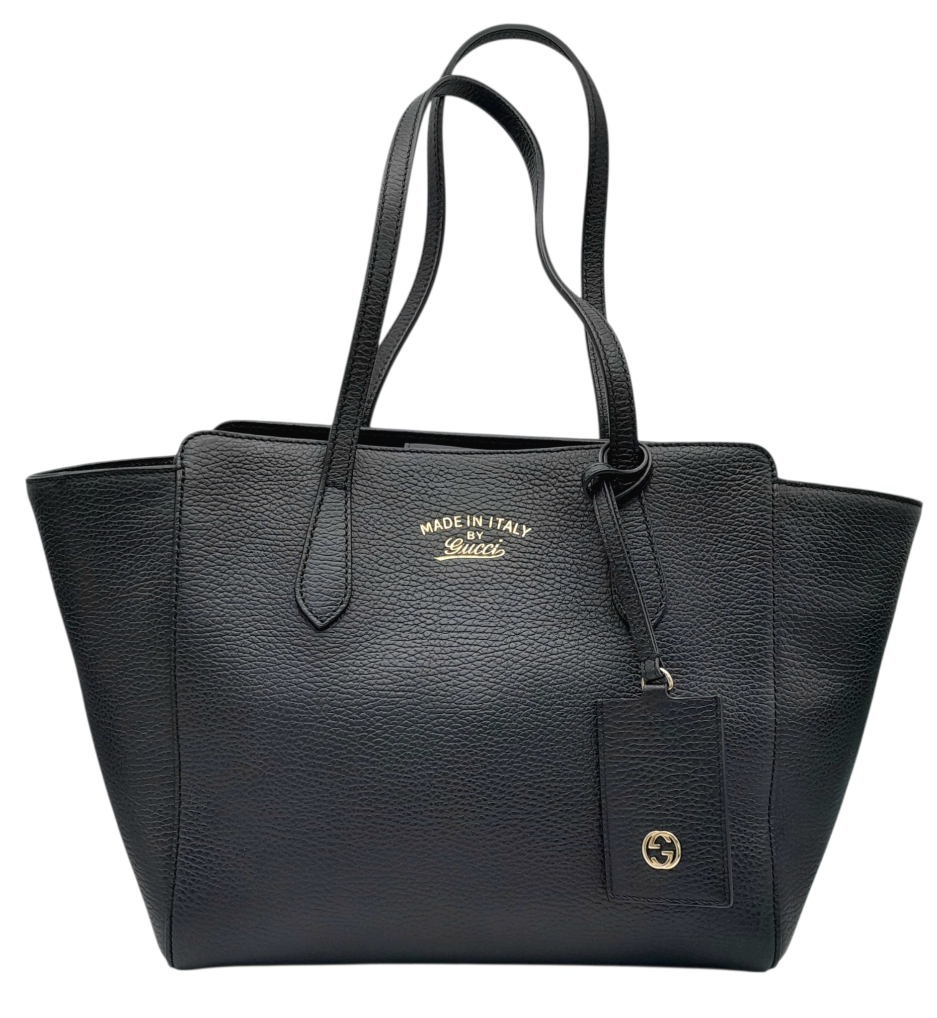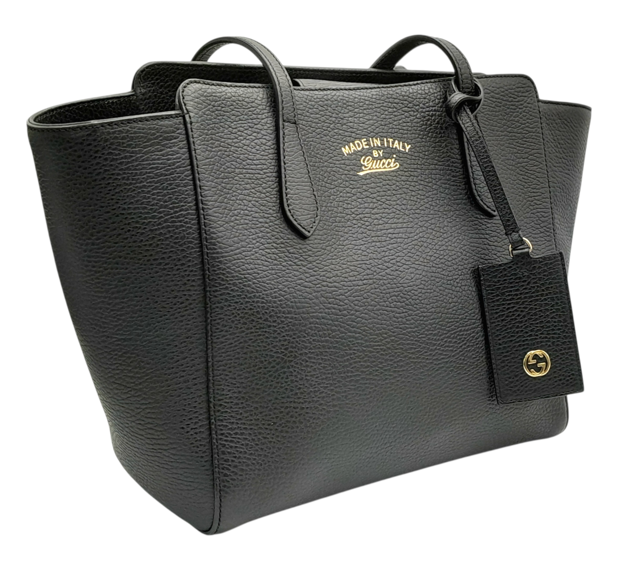 A Gucci Swing Tote Bag. Black grained leather exterior with dual shoulder straps, detachable leather tag and open top with magnetic closure. Beige canvas-lined interior with a zipped inner side pocket and two open inner side pockets. Comes with dust cover bag and a certificate of authenticity. Approximate size: 43cm length x 24cm height. In good condition overall but Please see photos for details condition or request a condition report. Ref: 27508