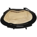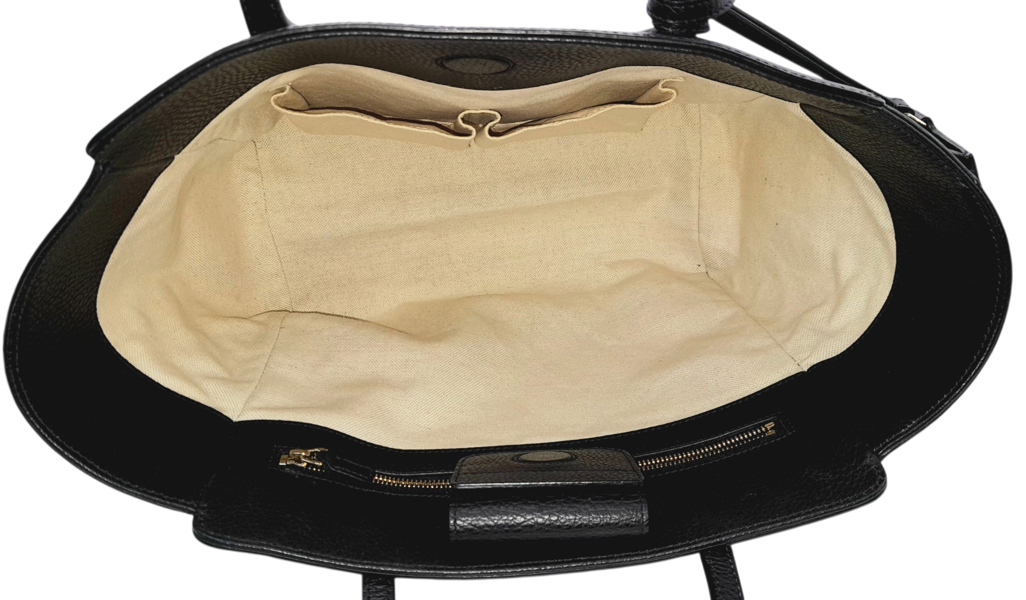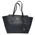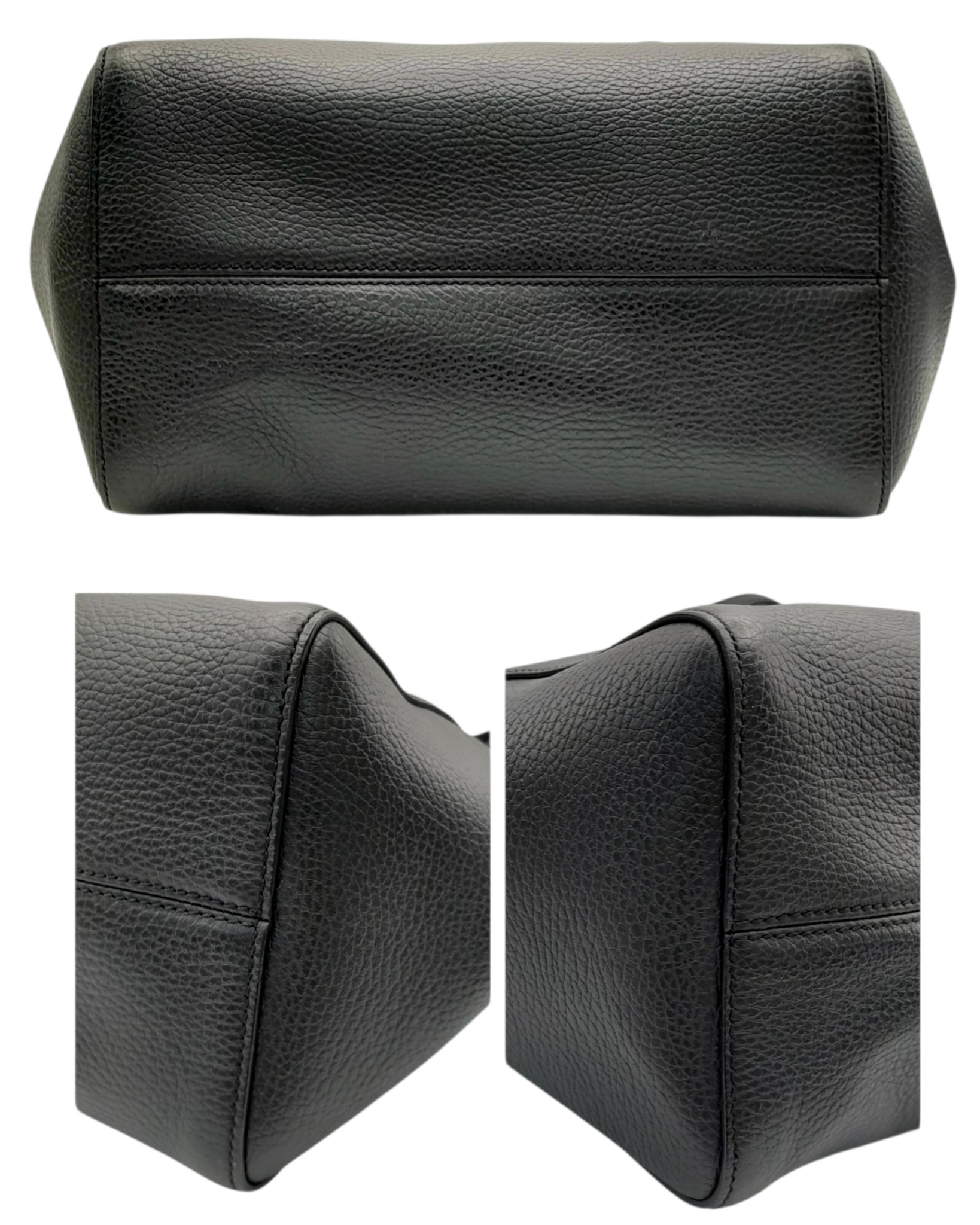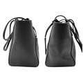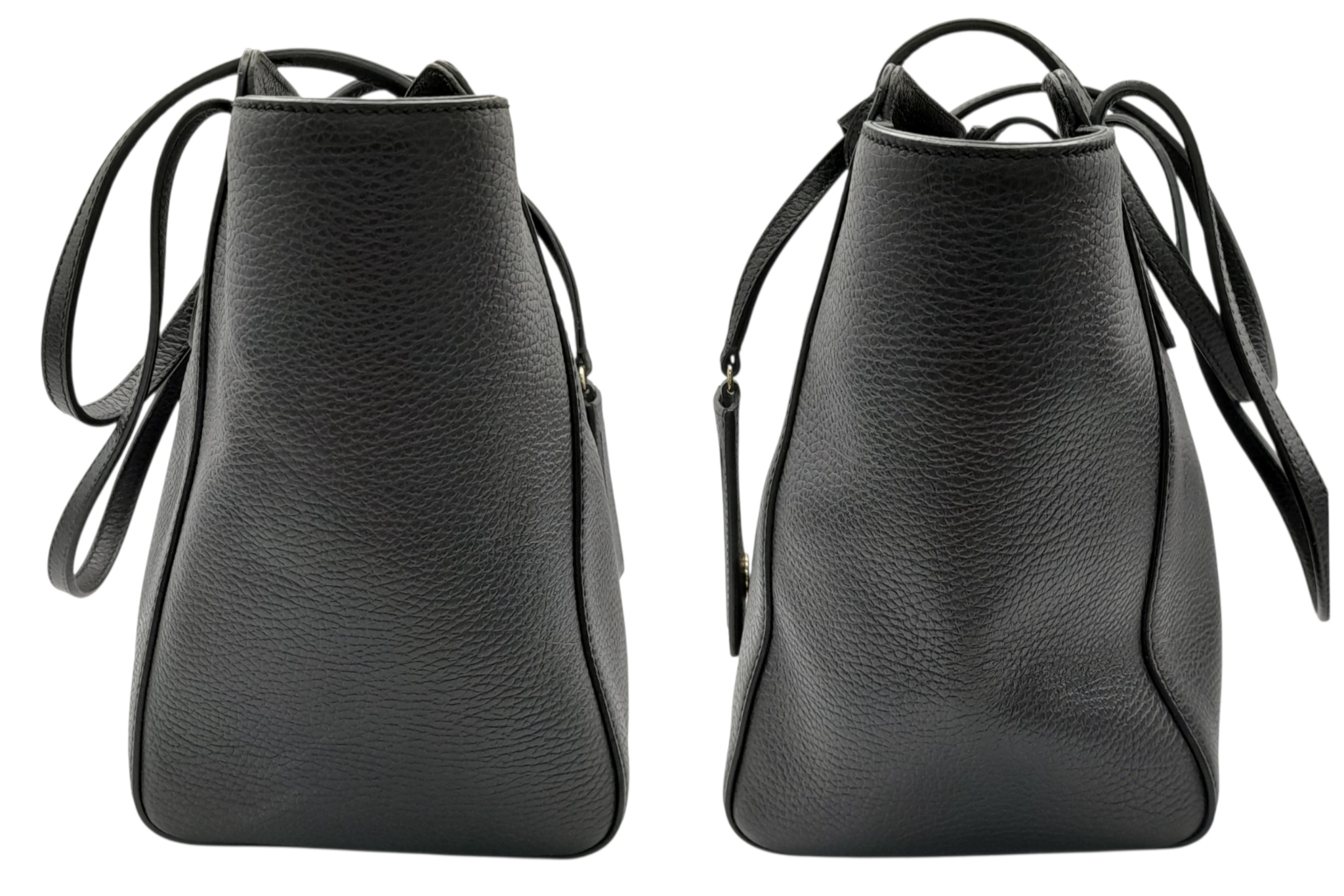 A Gucci Swing Tote Bag. Black grained leather exterior with dual shoulder straps, detachable leather tag and open top with magnetic closure. Beige canvas-lined interior with a zipped inner side pocket and two open inner side pockets. Comes with dust cover bag and a certificate of authenticity. Approximate size: 43cm length x 24cm height. In good condition overall but Please see photos for details condition or request a condition report. Ref: 27508