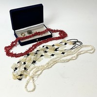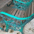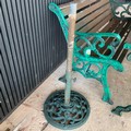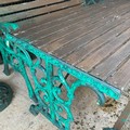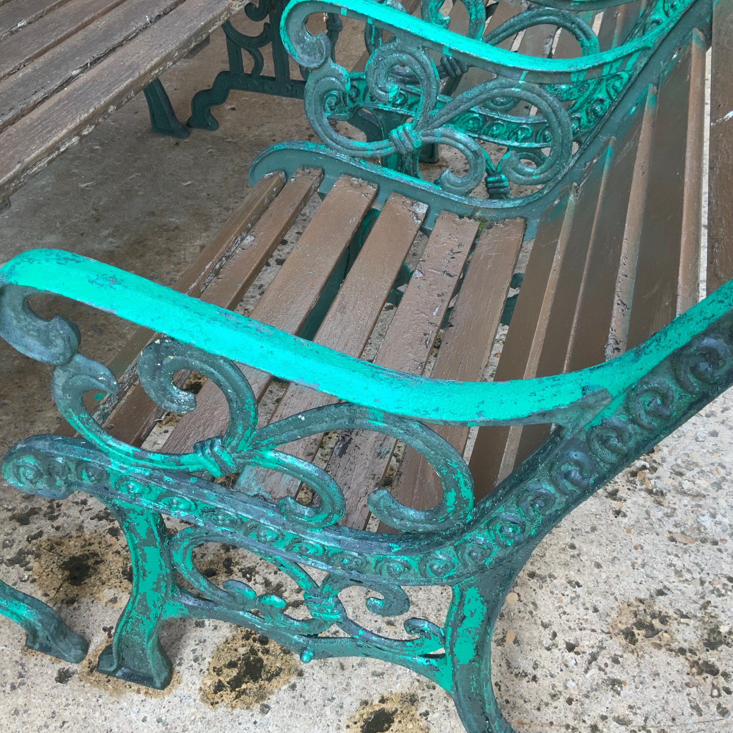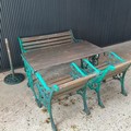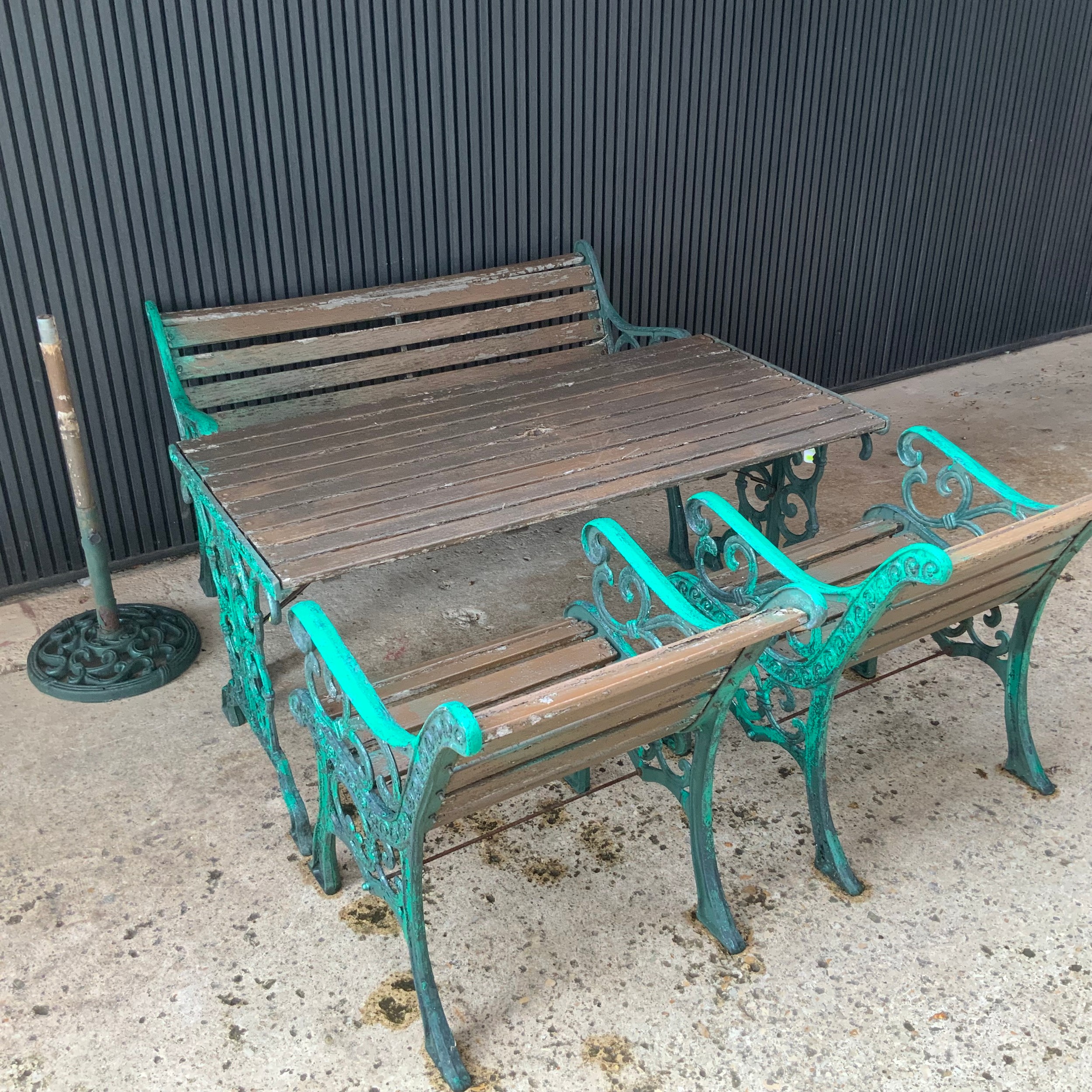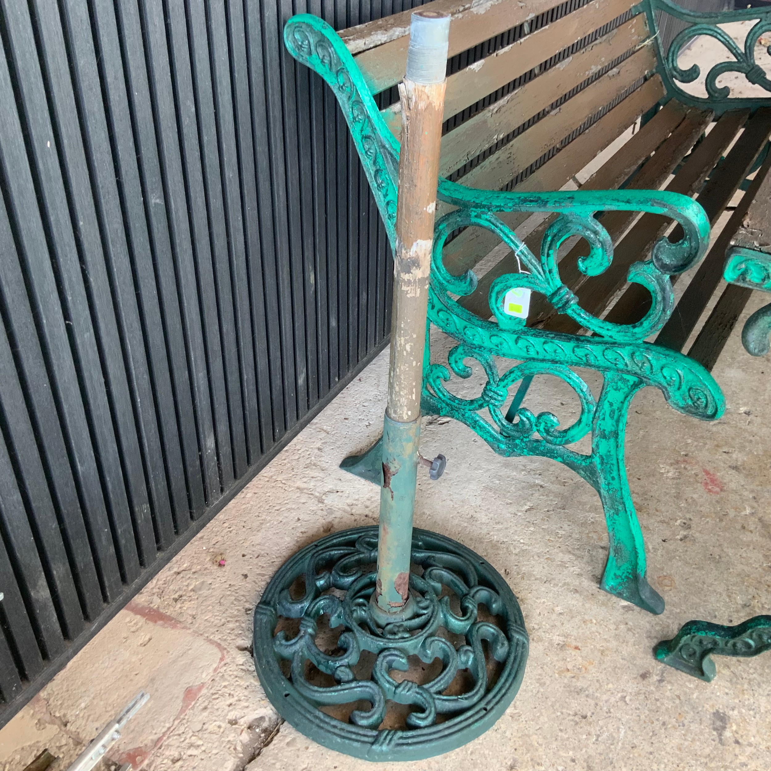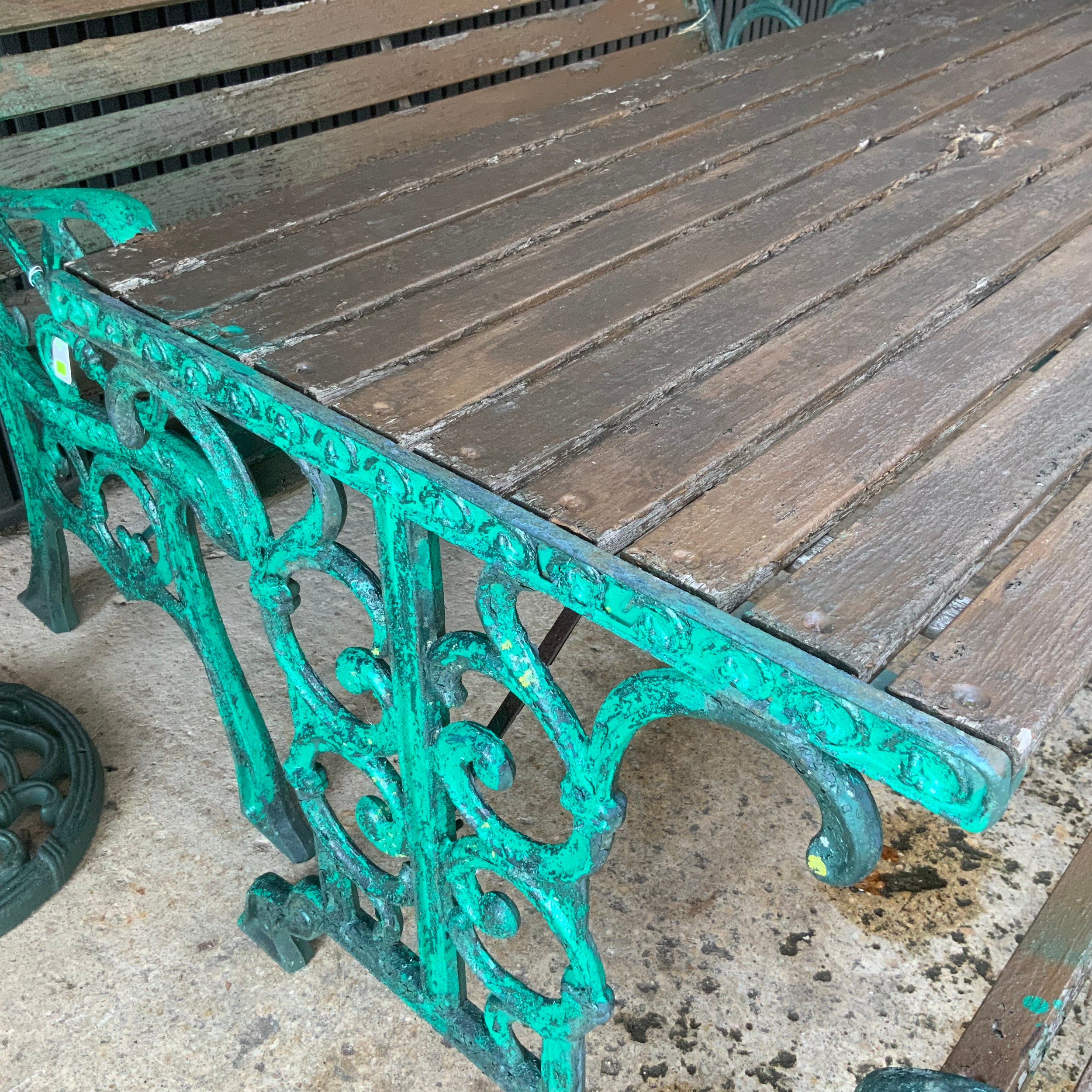 A matching garden table, bench and two chairs, and a garden umbrella stand, each with wooden slats and iron mounts. The table measuring 140cm long, 68cm deep, 65cm high.