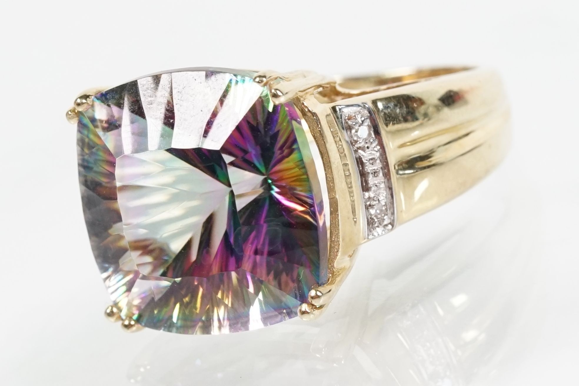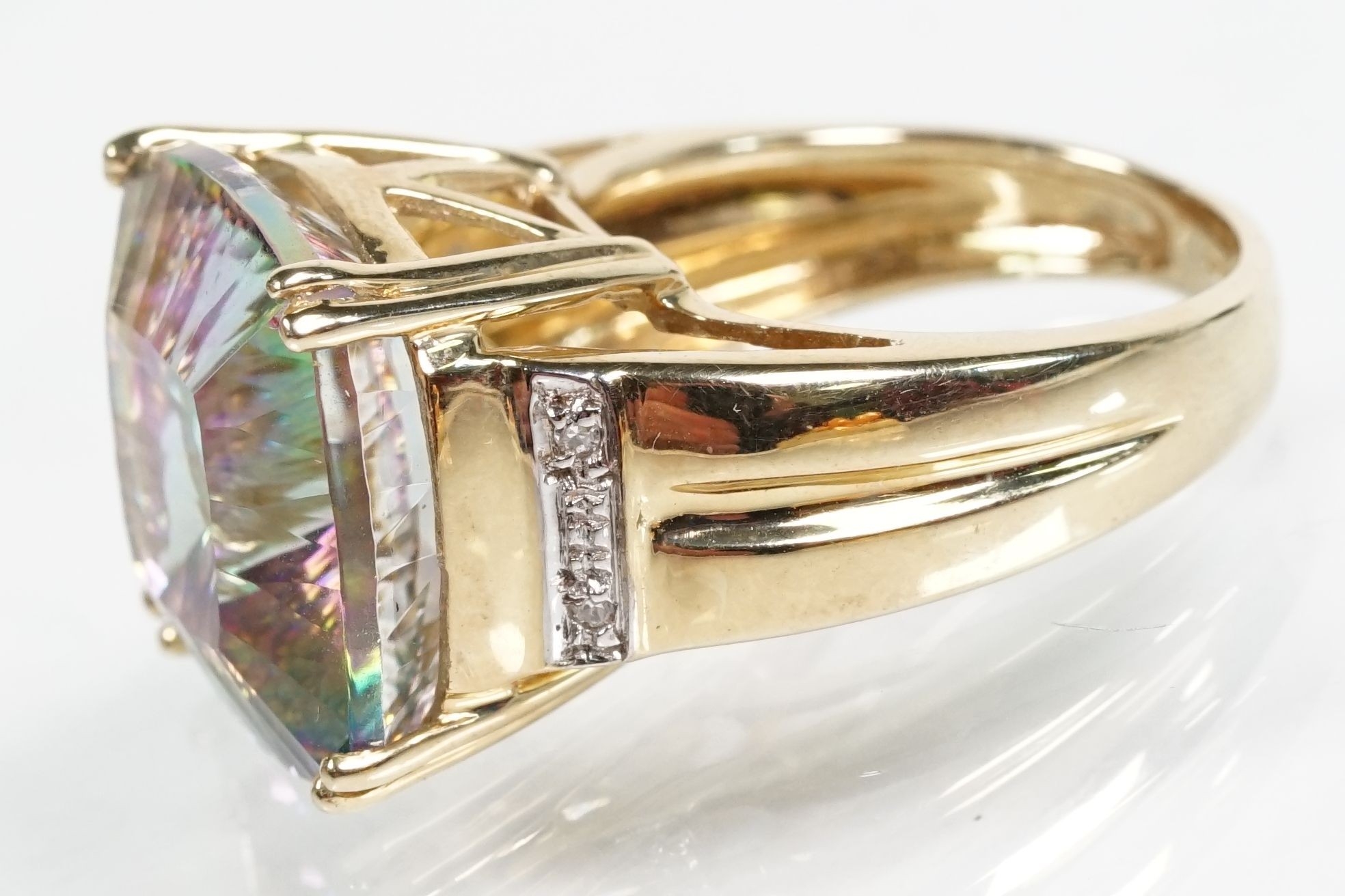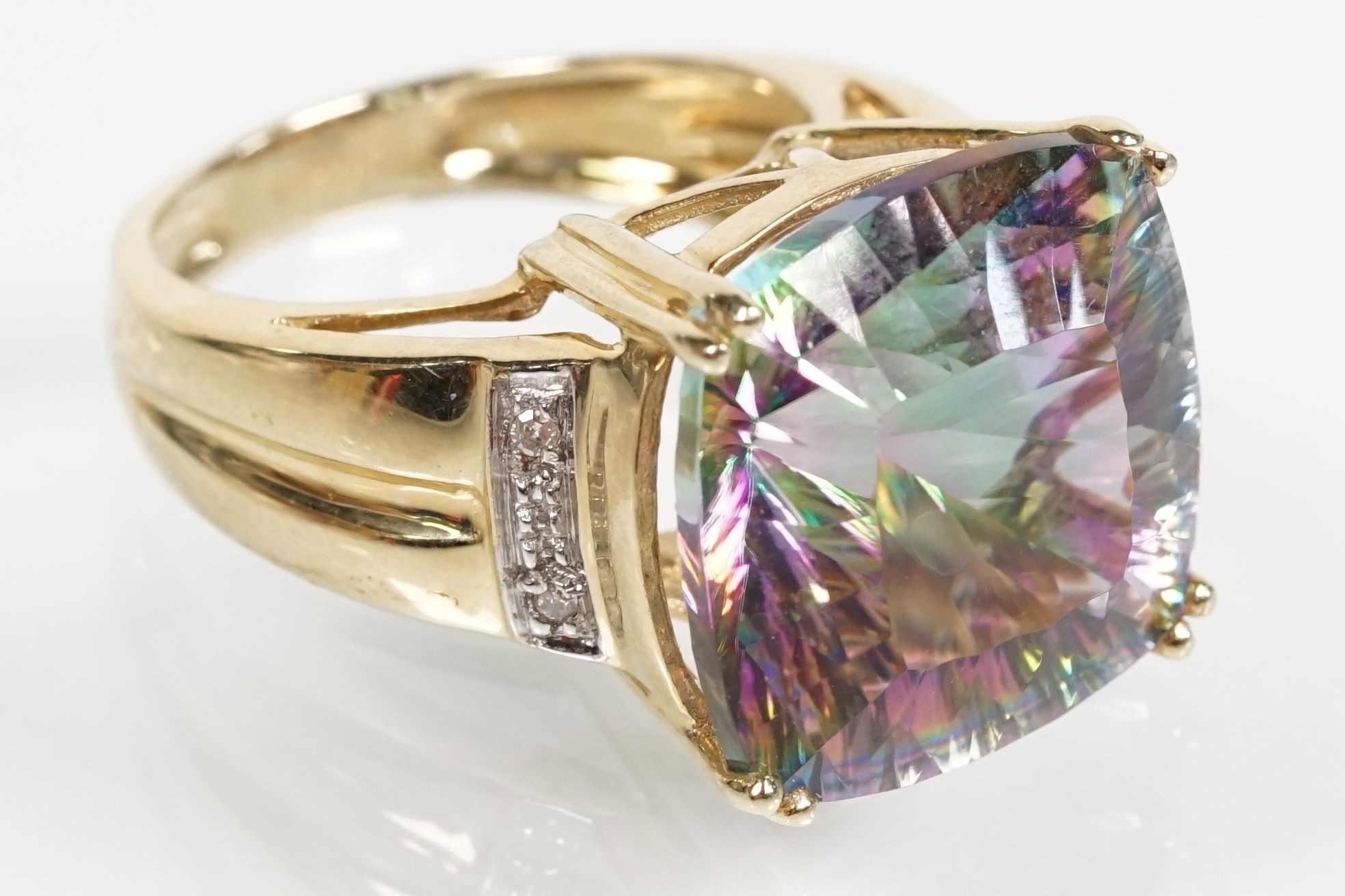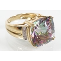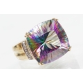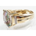 9ct gold and mystic topaz dress ring being set with a cushion cut mystic topaz to the head. Hallmarked Birmingham 2006. Size N.5.