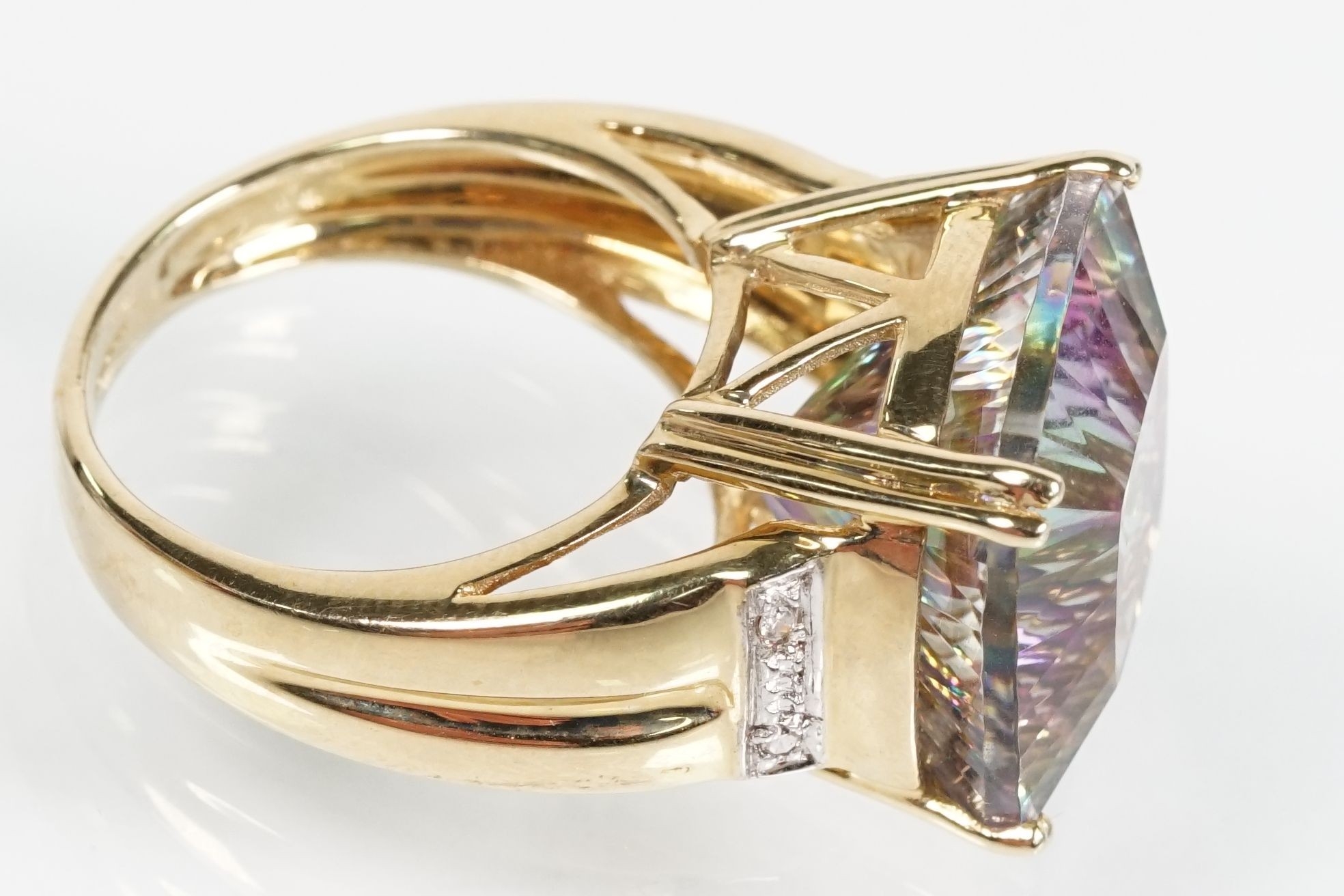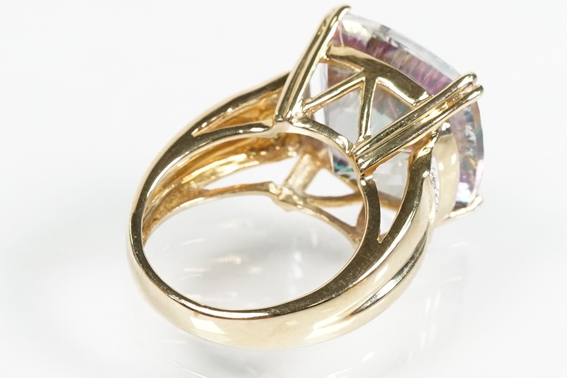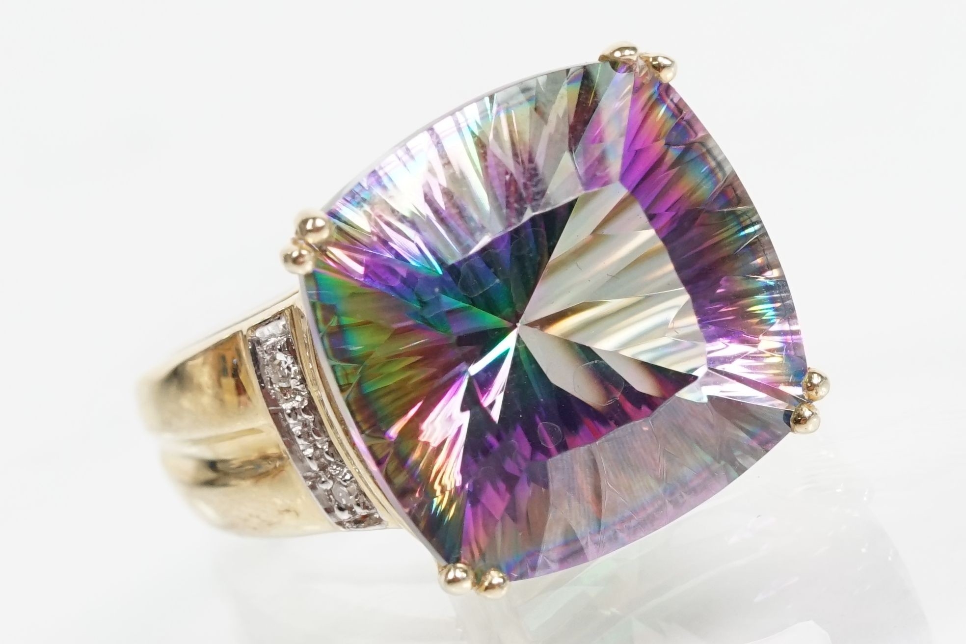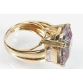 9ct gold and mystic topaz dress ring being set with a cushion cut mystic topaz to the head. Hallmarked Birmingham 2006. Size N.5.