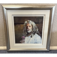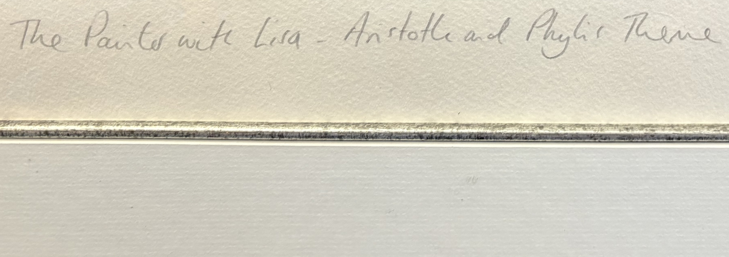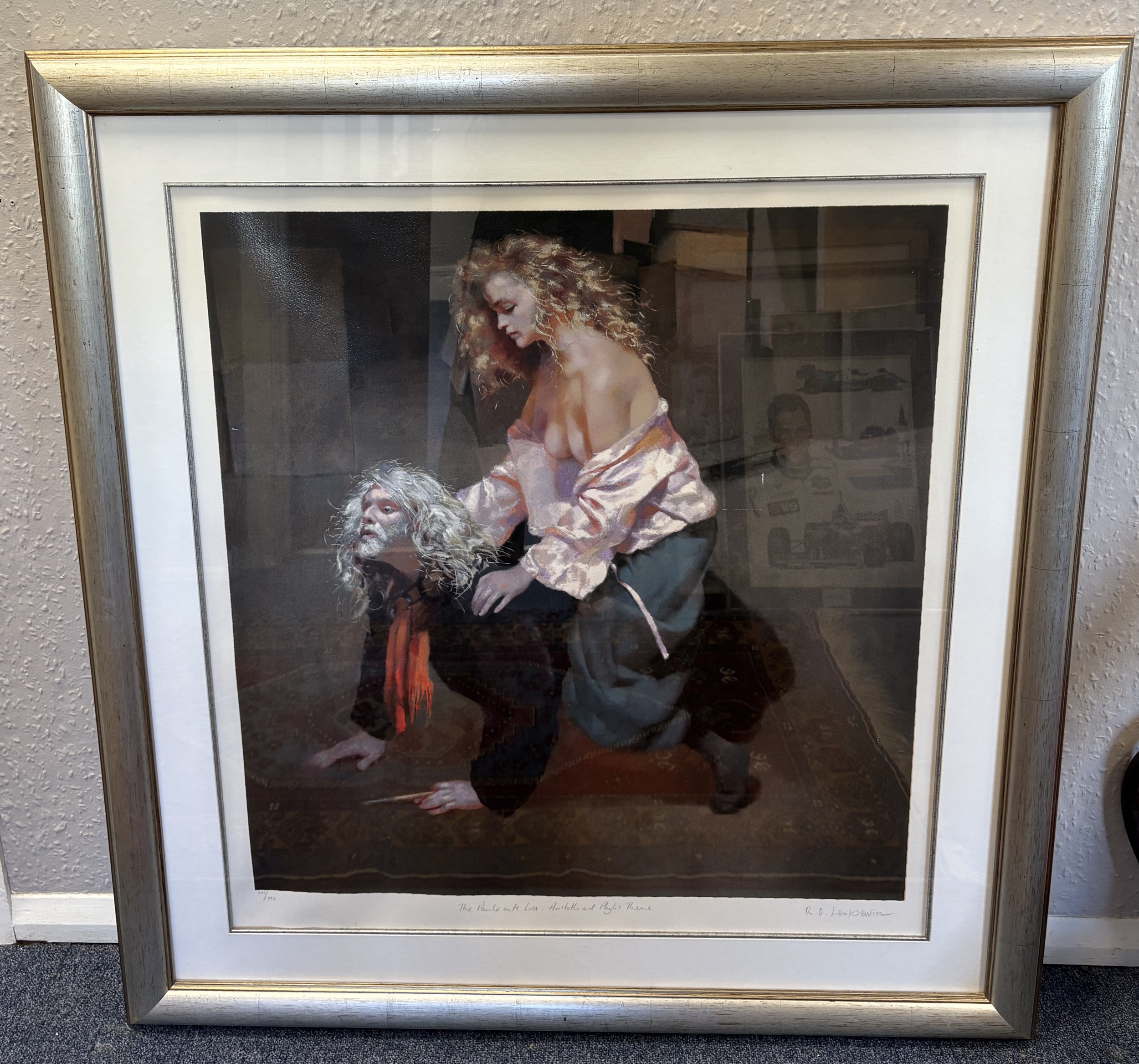 ROBERT LENKIEWICZ: (British, 1941 - 2002): A framed and glazed limited edition print entitled 'the painter with Lisa - Aristotle and Phylis Theme' depicting a portrait of Robert Lenkiewicz with Lisa Stokes. Numbered 341 / 395. Pencil signed to bottom right. Approx. 81 cm x 88 cm (ss). Est. £300 - £400