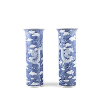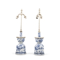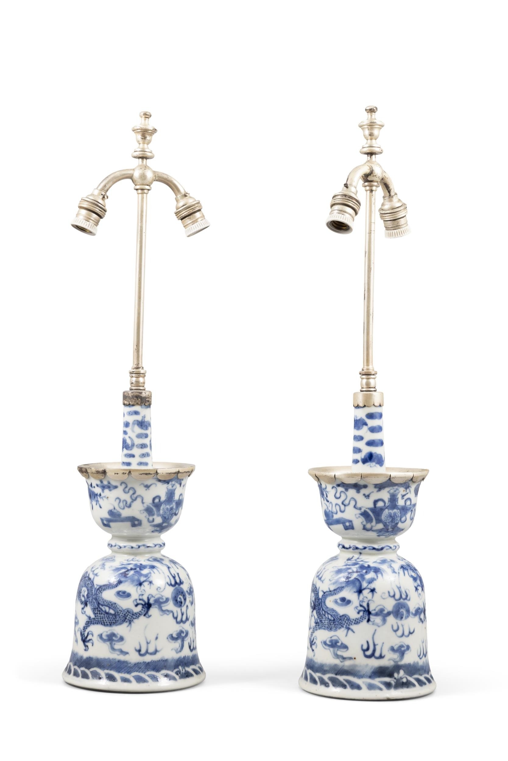 A PAIR OF BLUE AND WHITE PORCELAIN DRAGON CANDLESTICKS 19??? ?????????? China, late 19th century H: 23cm (porcelain base)