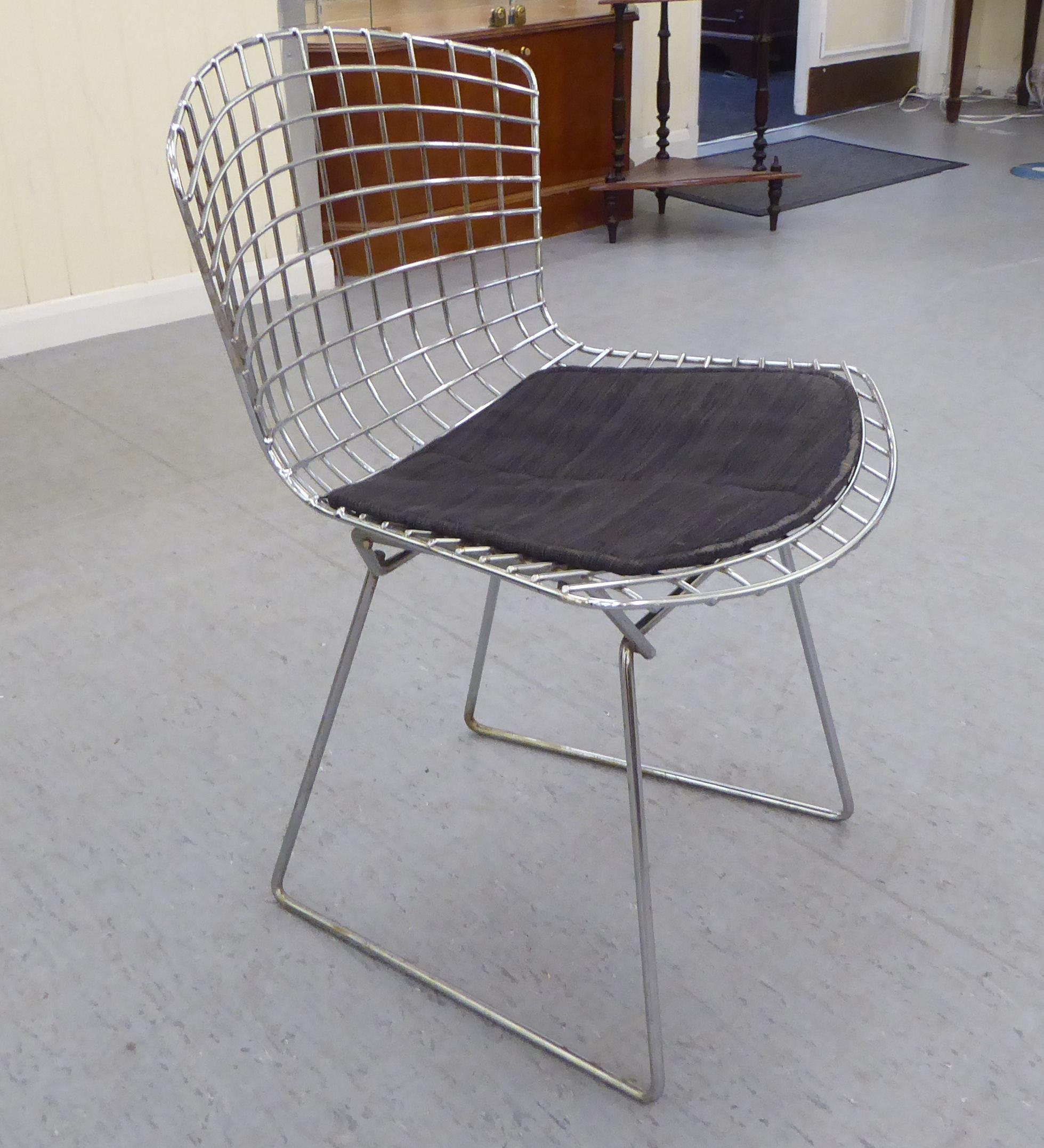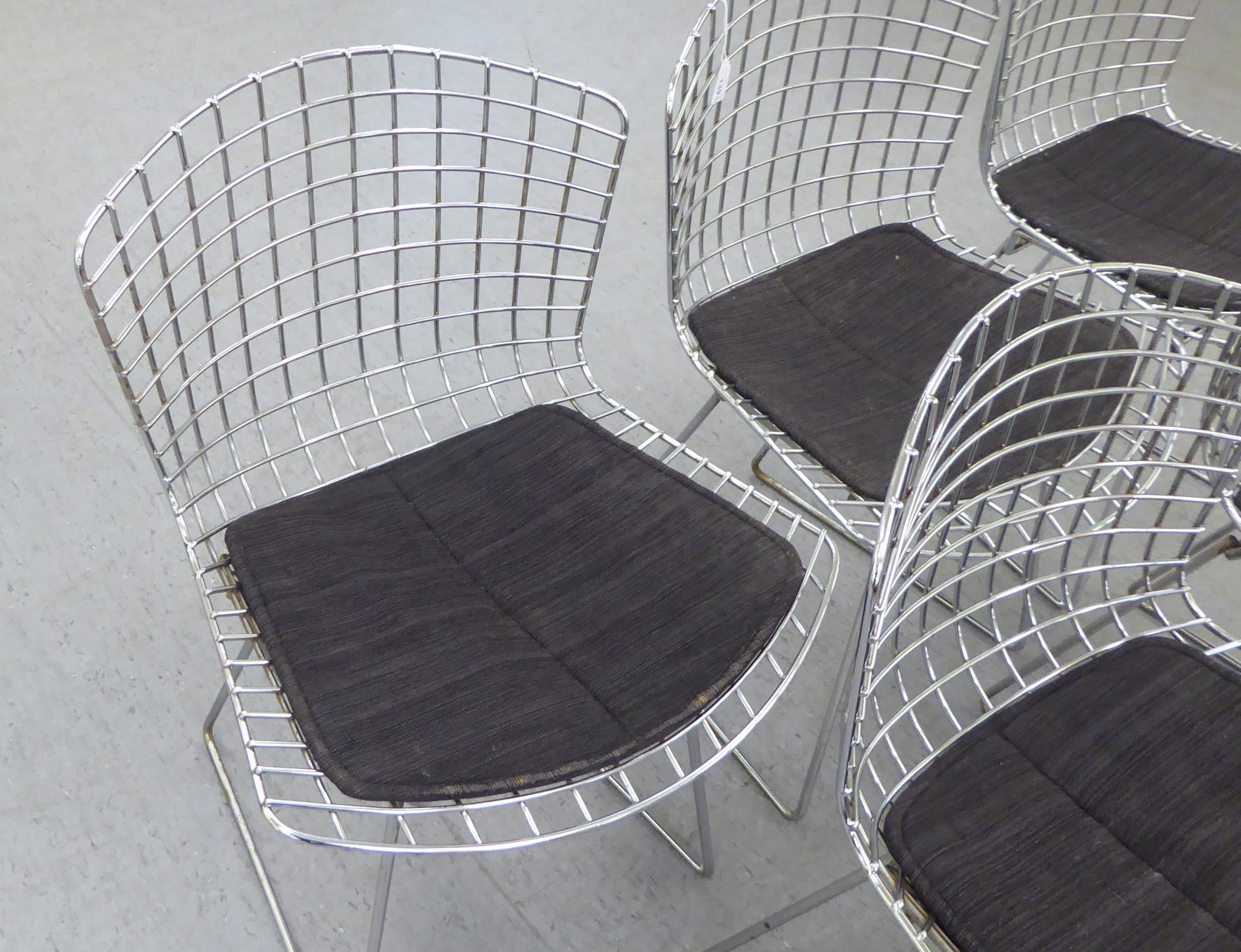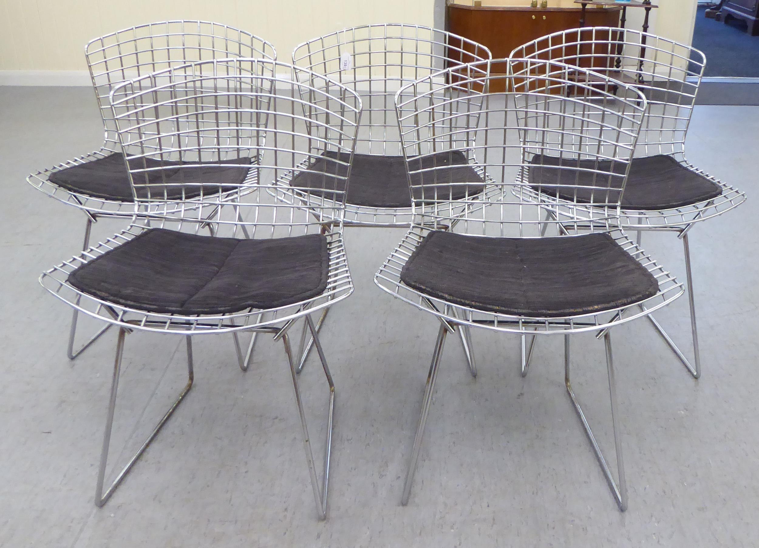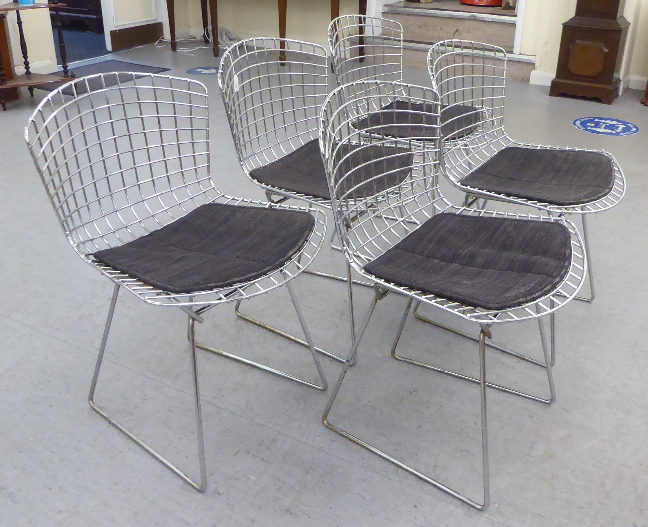 A set of five Bertoia design chromium plated chairs with charcoal coloured, fabric covered cushion seats