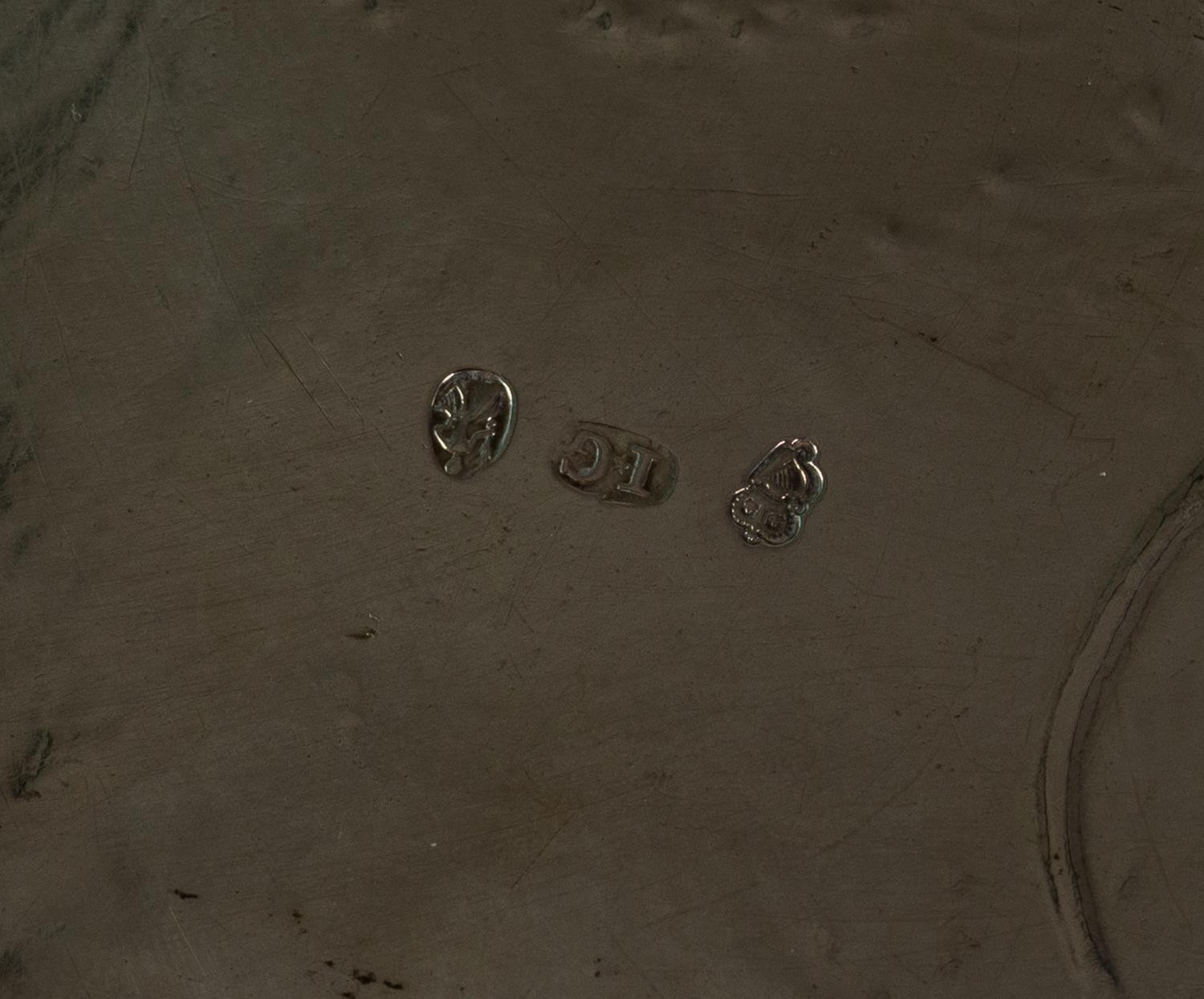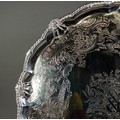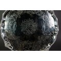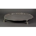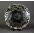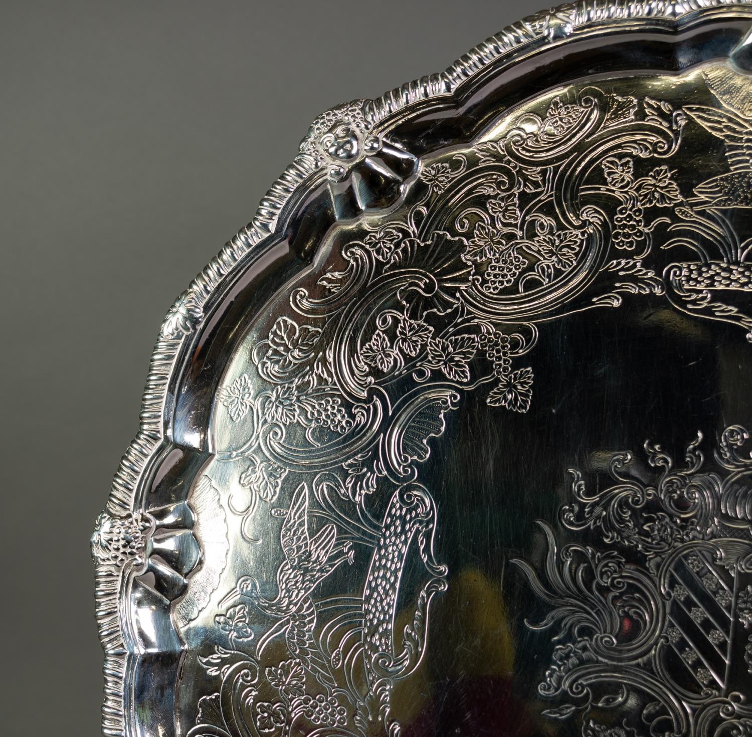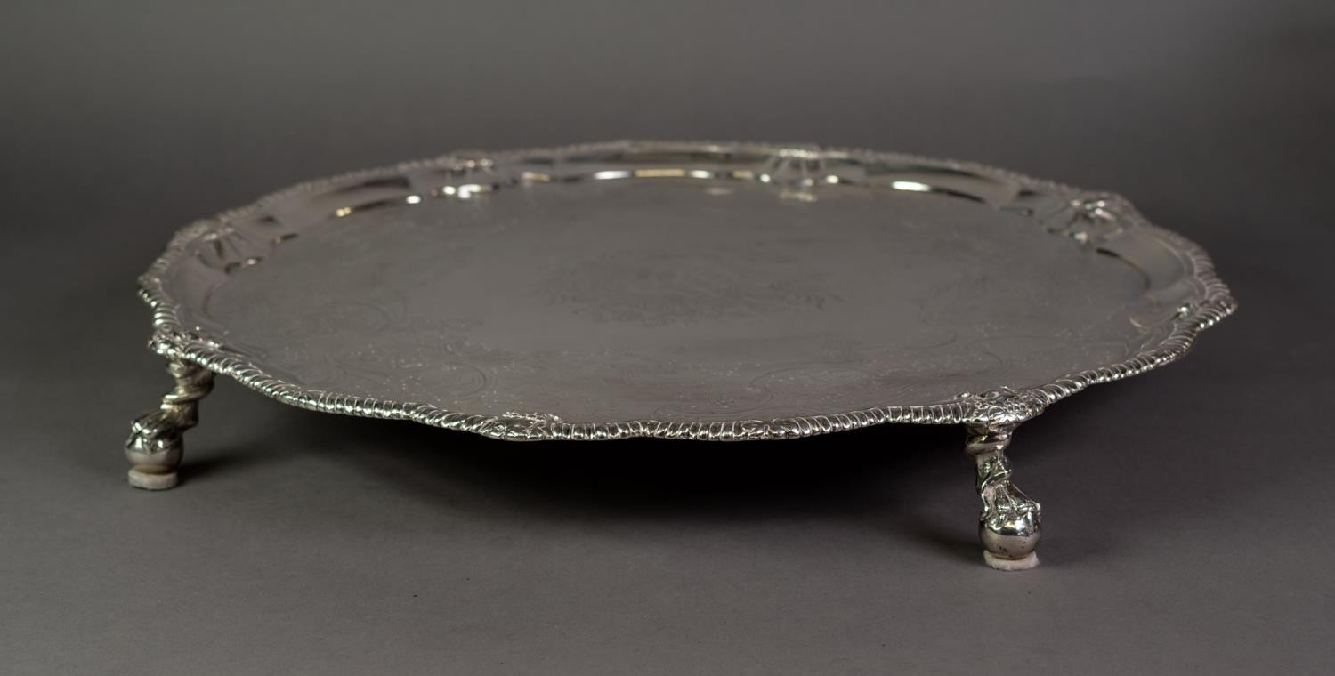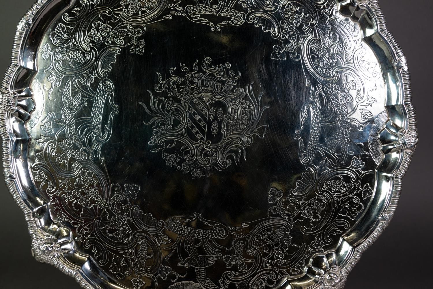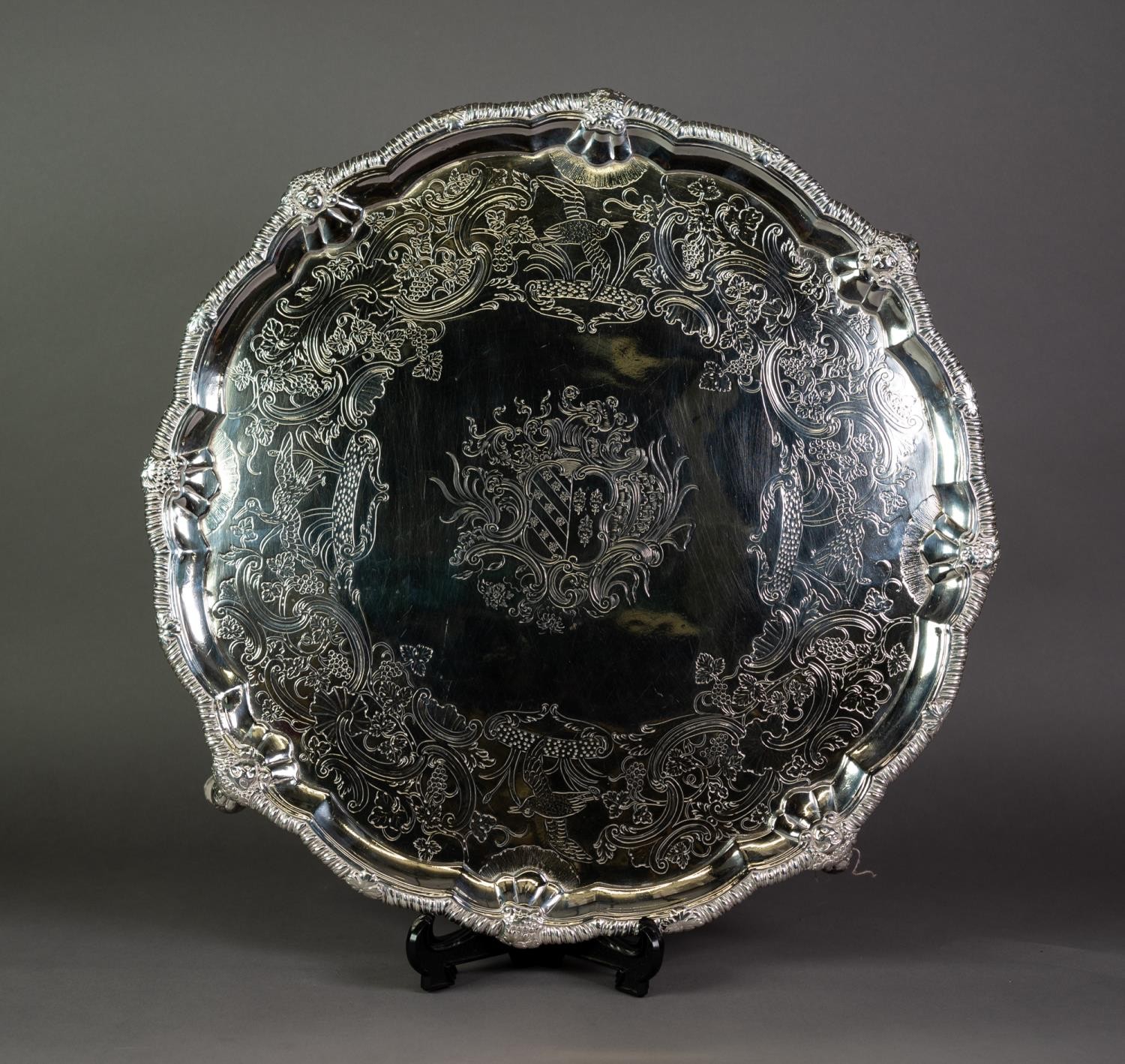 IMPRESSIVE MID EIGHTEENTH CENTURY IRISH SILVER SALVER BY JOHN GUMLEY, DUBLIN, the centre chased with the arms of Penrose of Manaccan, Cornwall impaling (perhaps) Cantiupe, enclosed by meandering fruiting vines, snipe in flight and C scrolls, set beneath a mask capped gadrooned border and raised on four well modelled claw and ball feet, 19 ½” (49.5cm) diameter, marks lack date letter but circa 1740, 99.5oz