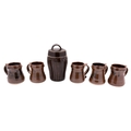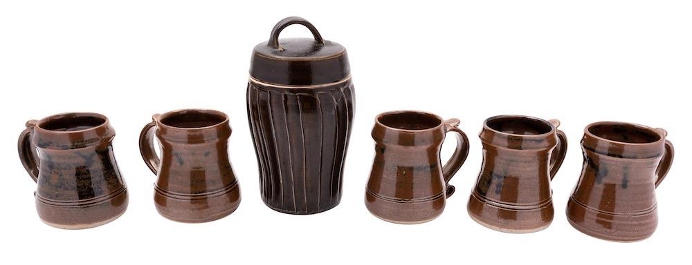 *Jeremy Leach [b. 1941] a group of stoneware, comprising a jar and cover of swelling cylindrical form with fluted decoration, 22cm high together with six tankards of waisted form with ribbed strap handle and scroll terminal, 11cm high, all under tenmoku glazes, impressed personal and Lowerdown seals,.[6]