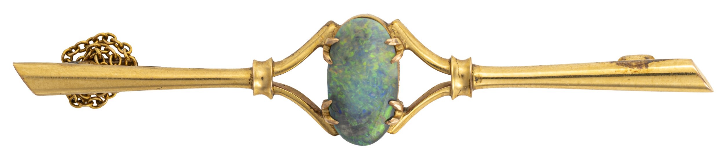 Claw set to the centre with an oval 12mm cabochon opal, in 18ct gold, length 7cm, 6g all in