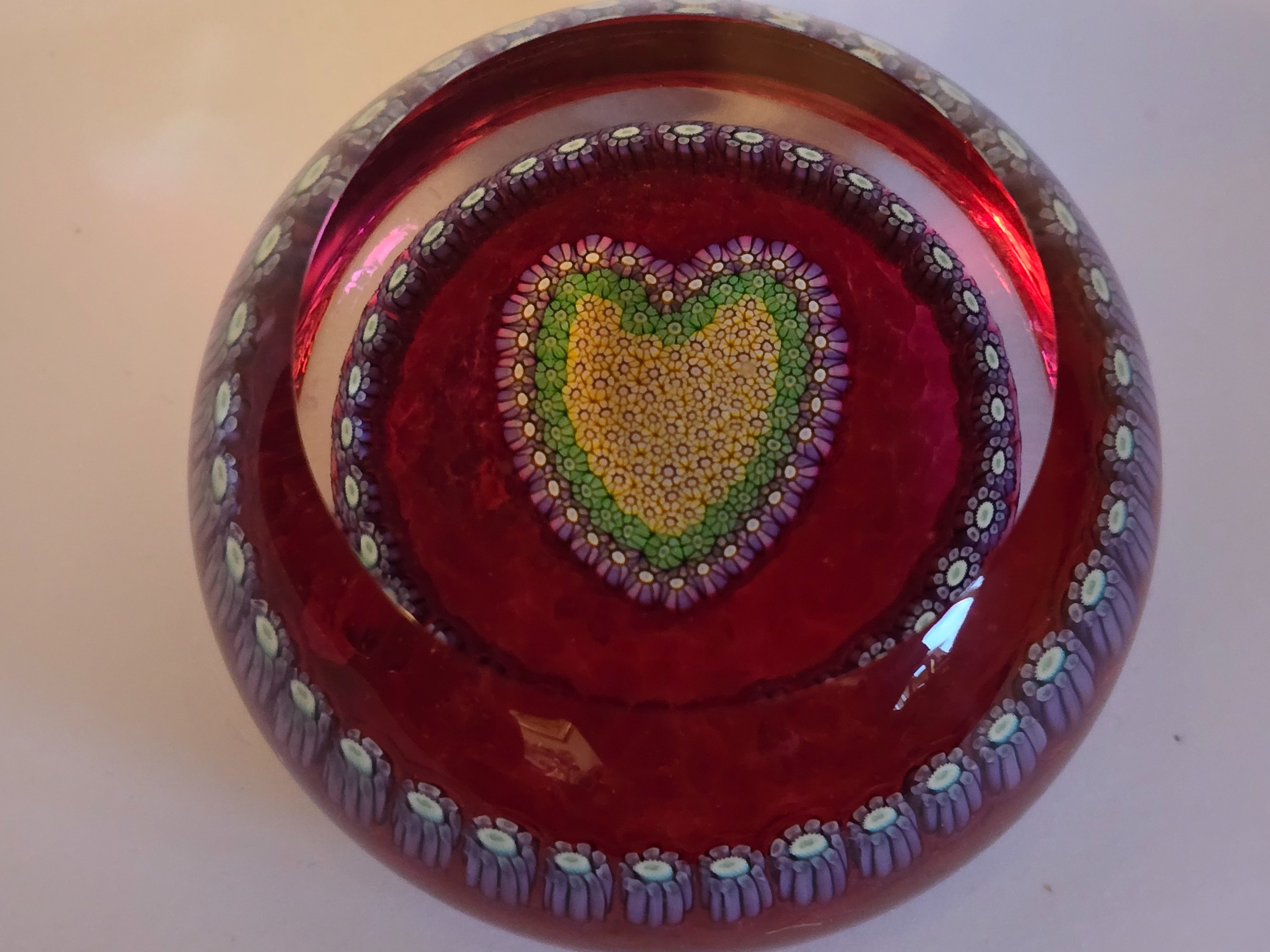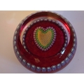 Valentines Gift: Perthshire paperweight - PP46 Initially made as part of a suite of 4 to represent suite of playing cards, the heart was seen as romantic and therefore popular. Lovely workmanship with fine closepack heart,1996 as it is unusual single colour, surrounded by canes, plus a garland on ruby red ground. Top window. Diam: 60.5mm