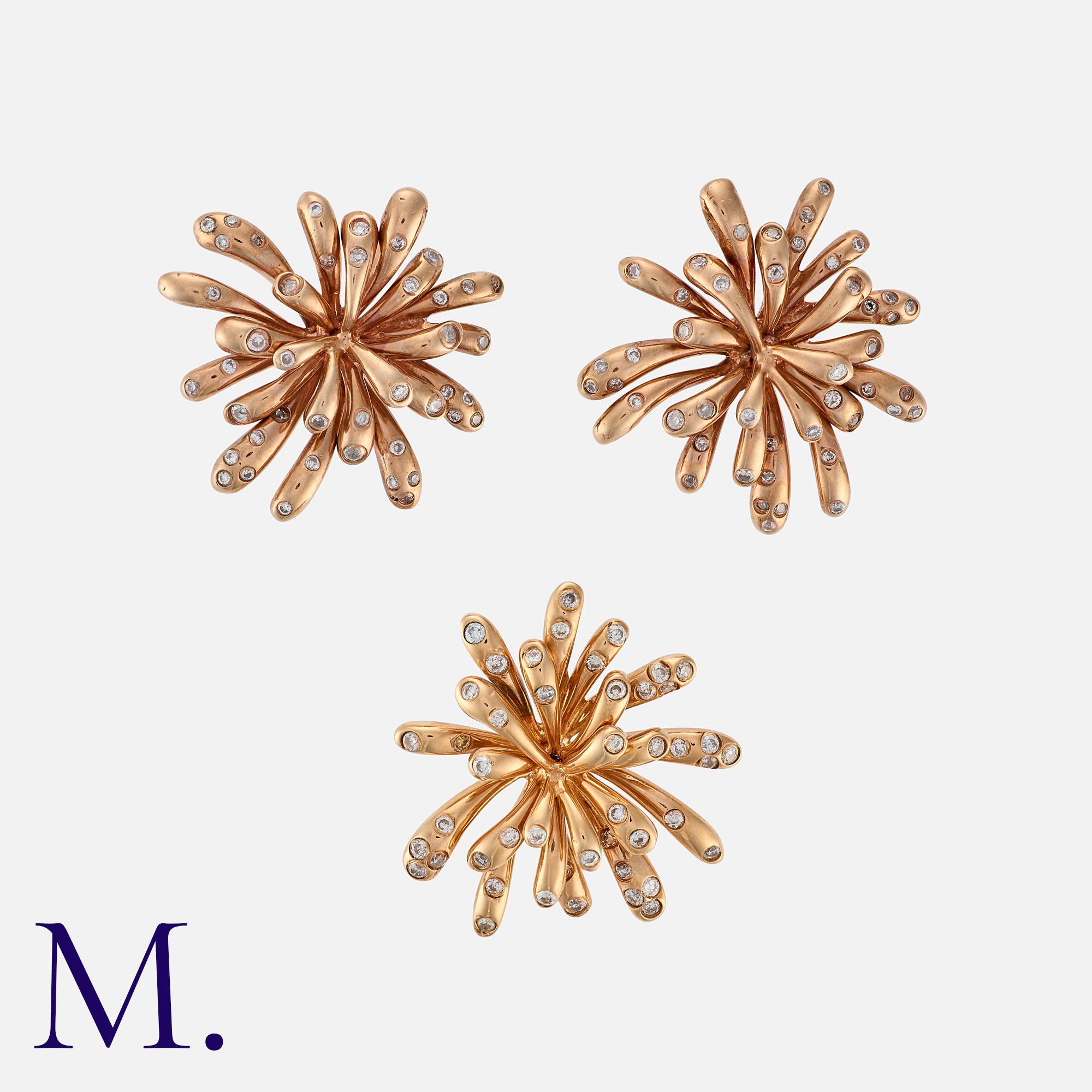 A Diamond Pendant And Earring Set in rose gold, of abstract design, the earrings marked Au375 for 9ct gold, the pendant marked Au750 for 18ct gold.