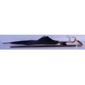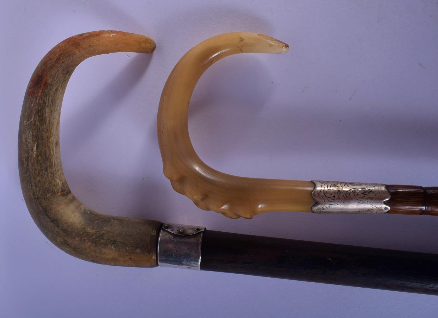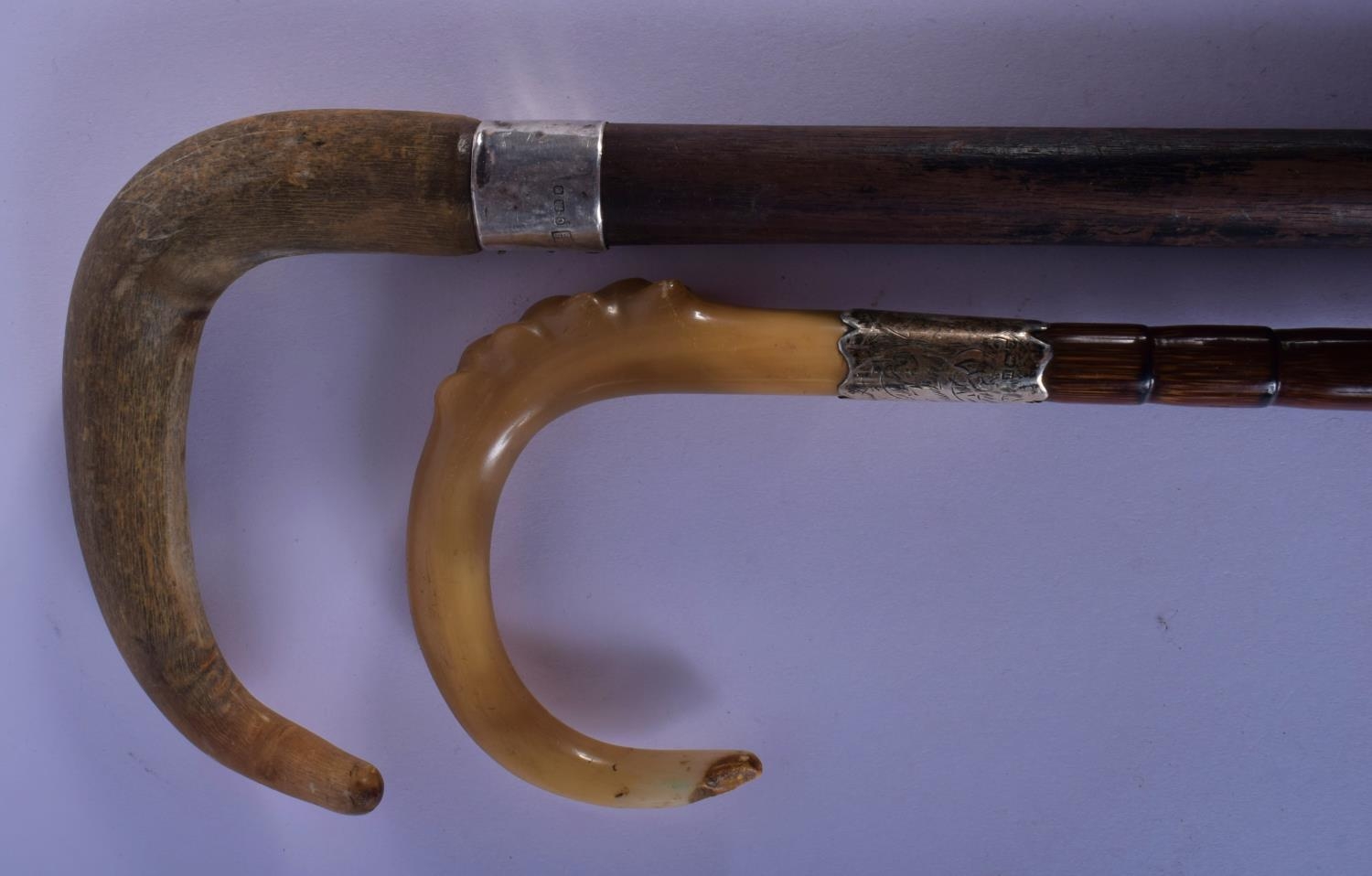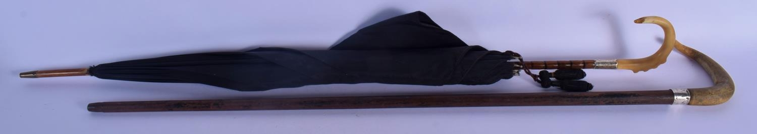 A 19TH CENTURY MIDDLE EASTERN SILVER MOUNTED RHINOCEROS HORN CANE and a similar parasol. Largest 88 cm long. (2)