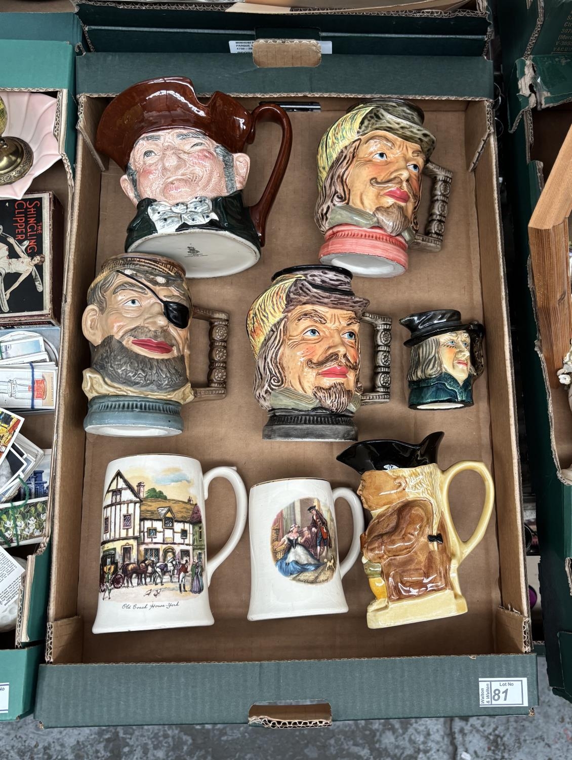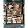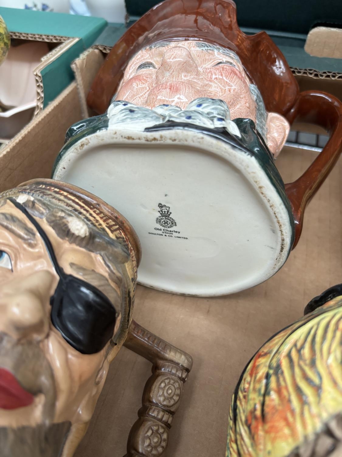 Box containing character jugs including Royal Doulton Old Charley