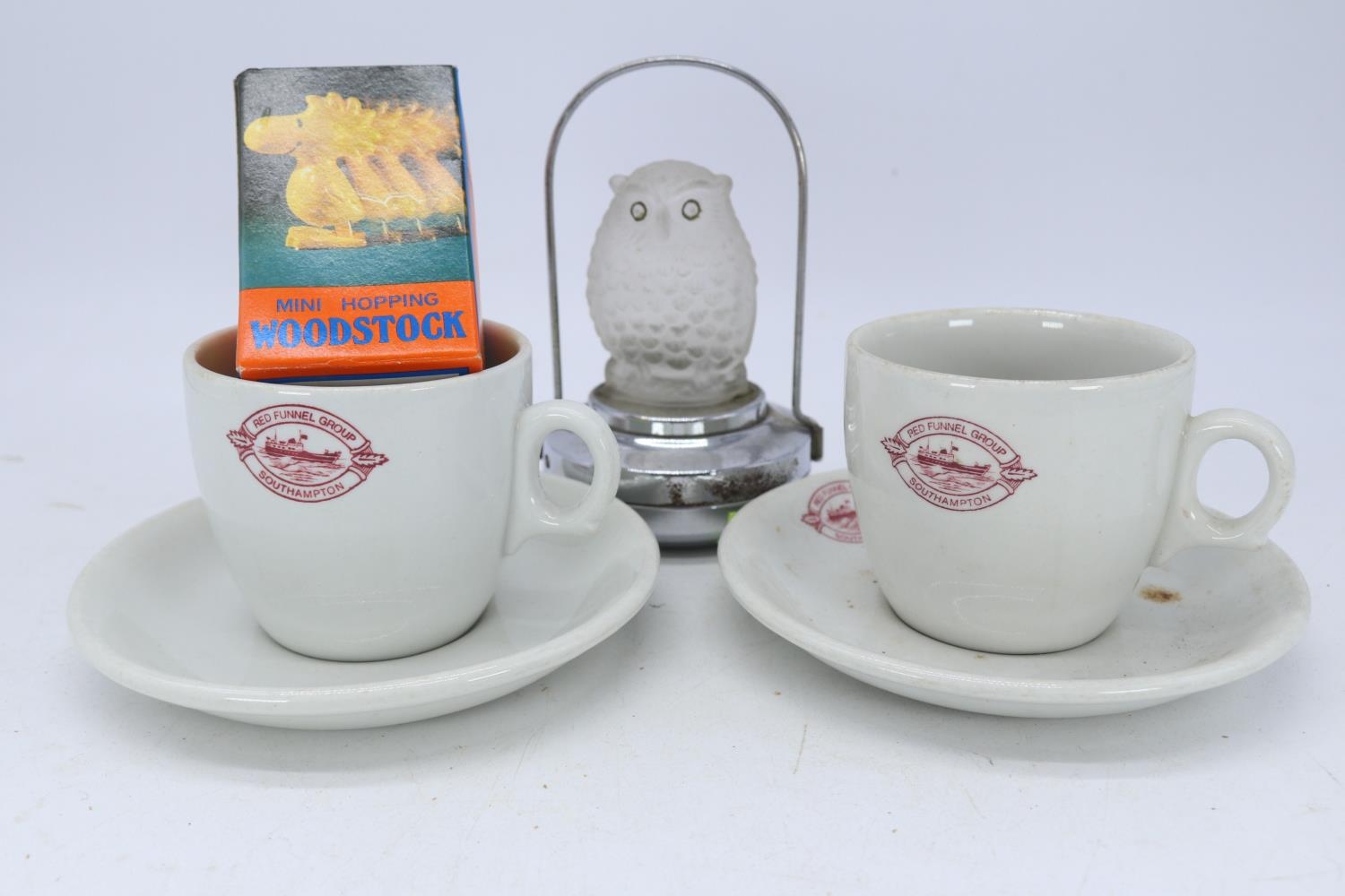 Two Red Funnel cup and saucers, boxed Woodstock and a Pifco frosted owl topped torch