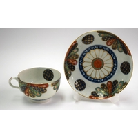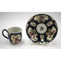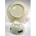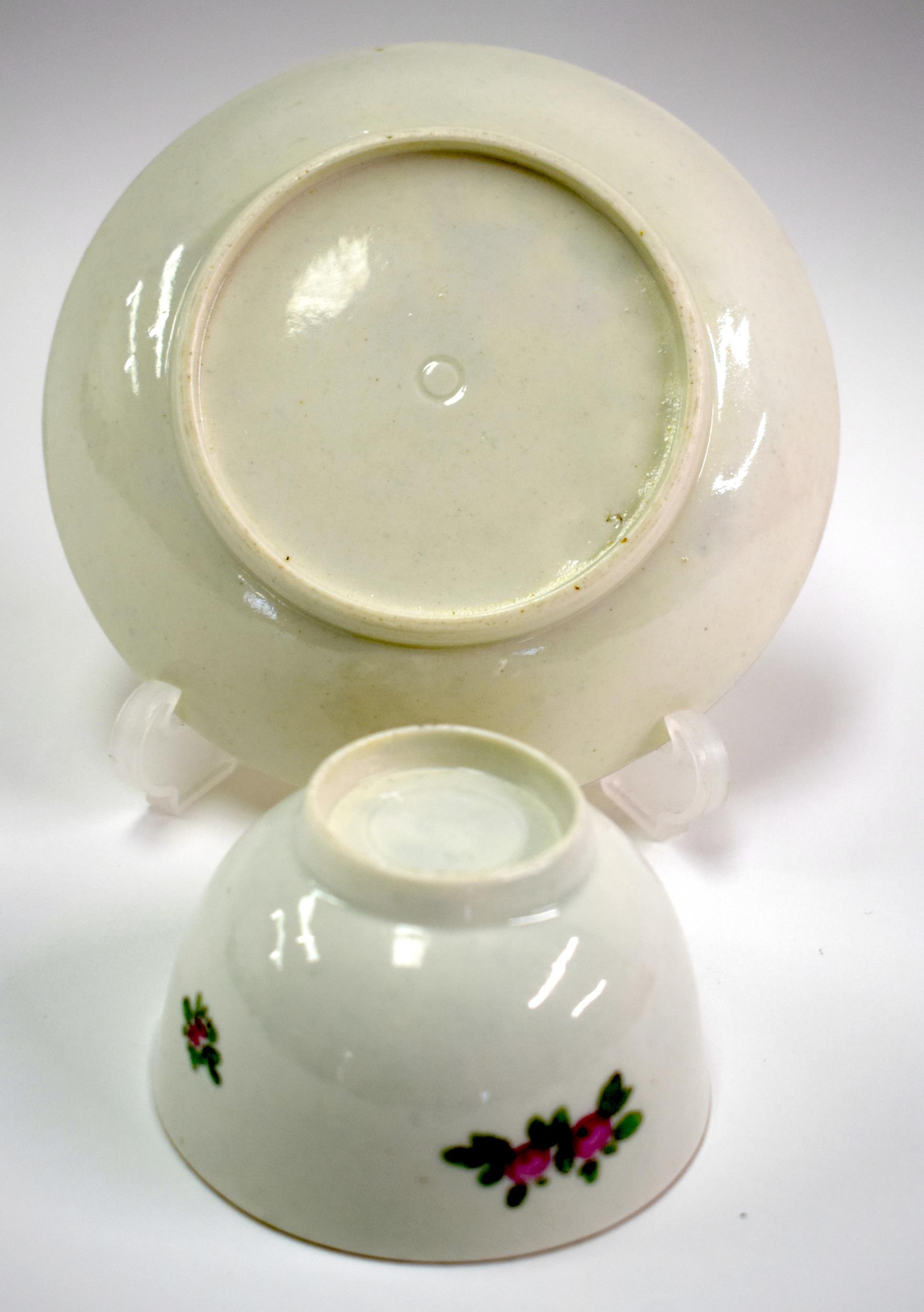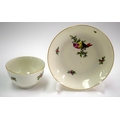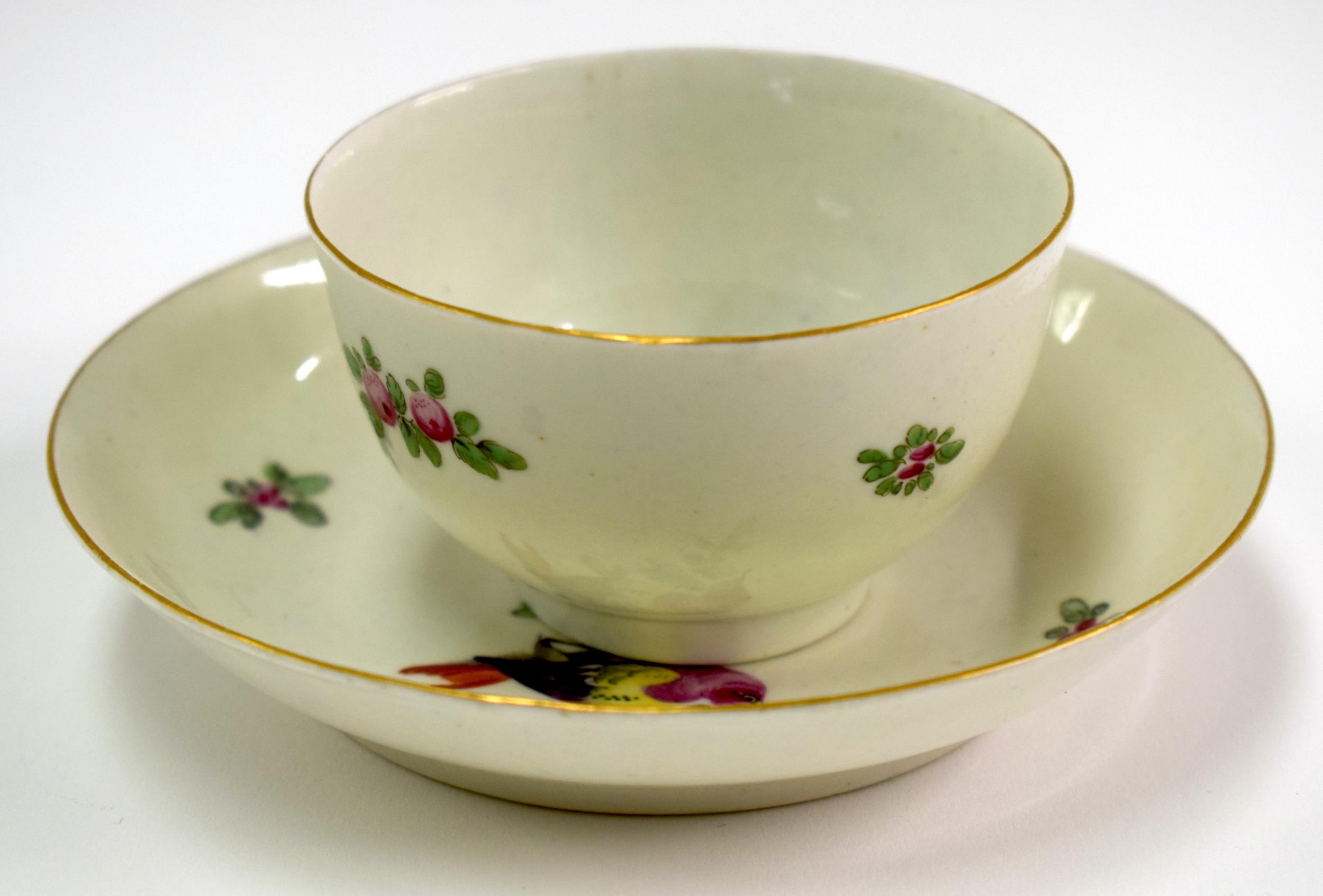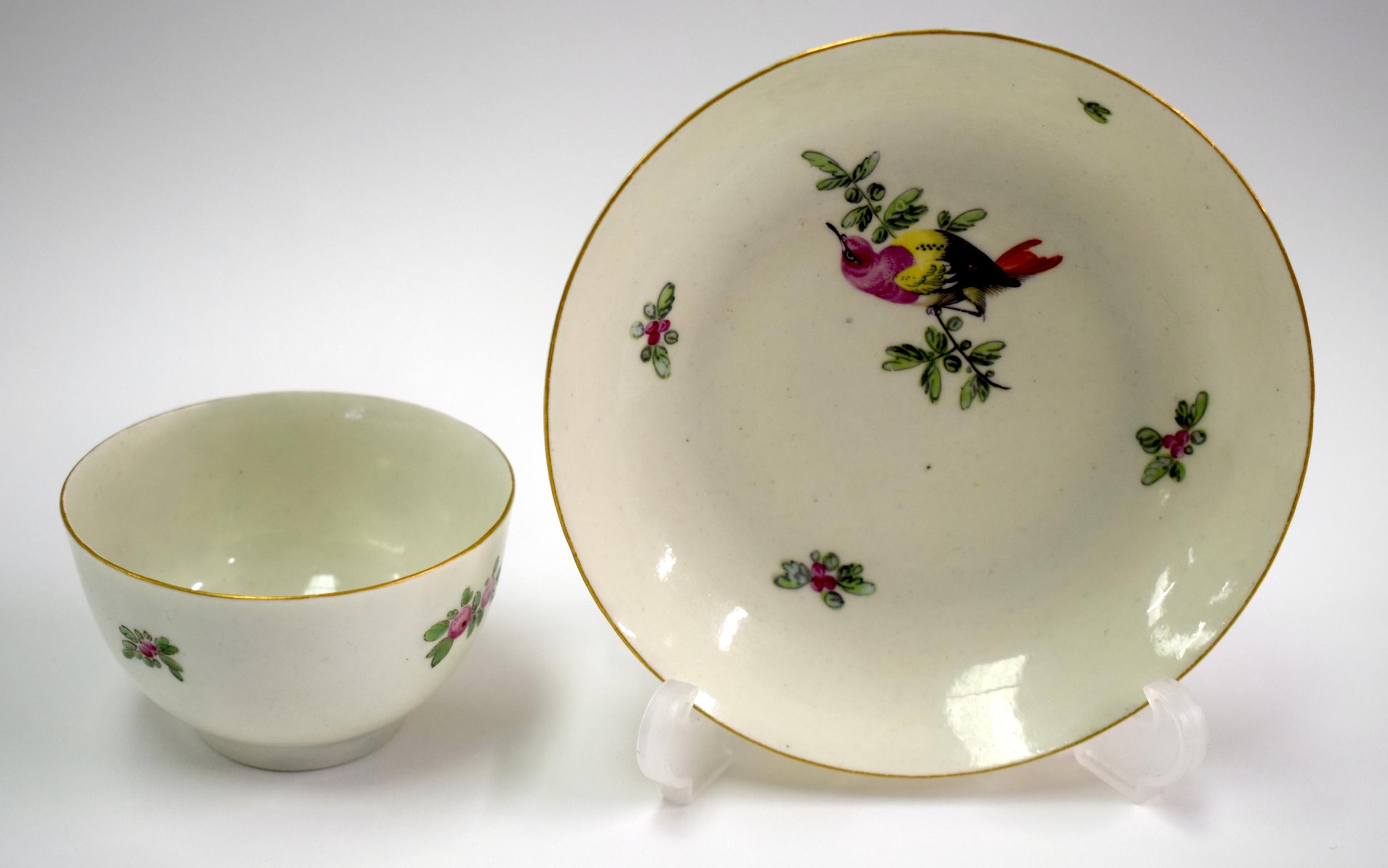 18th century Worcester teabowl and saucer each painted with a bird on a leafy branch. Saucer 12.5cm diameter. Cup 4.5cm high