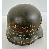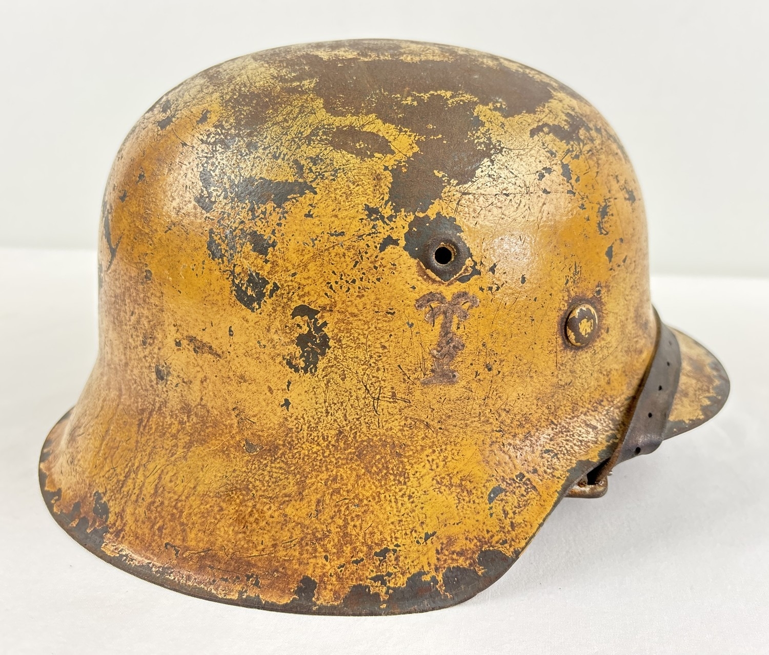 German Luftwaffe M42 steel helmet painted ochre over Luftwaffe blue, with the Luftwaffe branch of service decal. Complete with headband, rivets, washers, leather cradle and chinstrap. This example bears the Heereswaffenampt stamp mark inside the crown. Body stamped CKL66 5680, liner size 55.