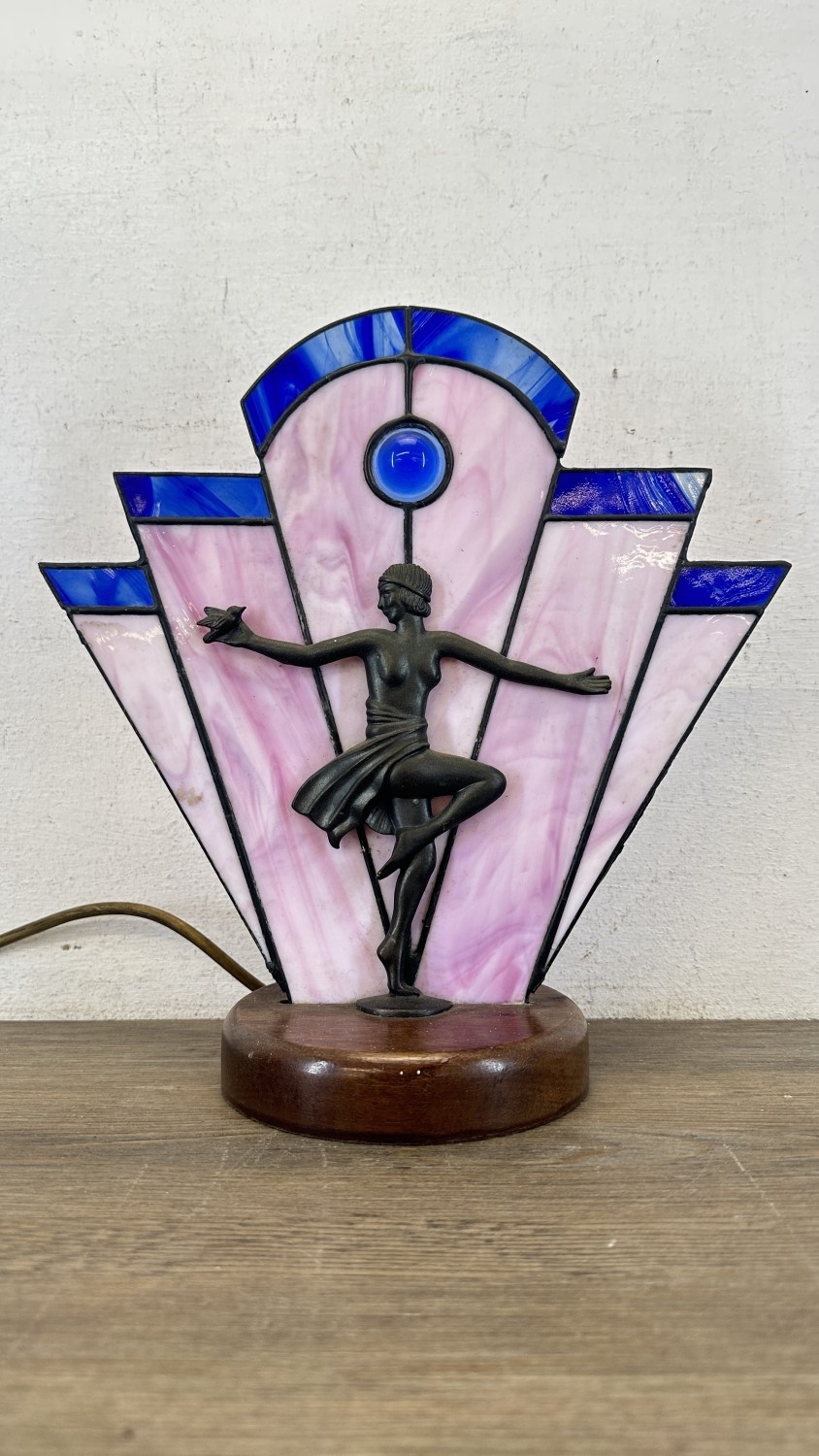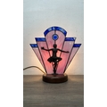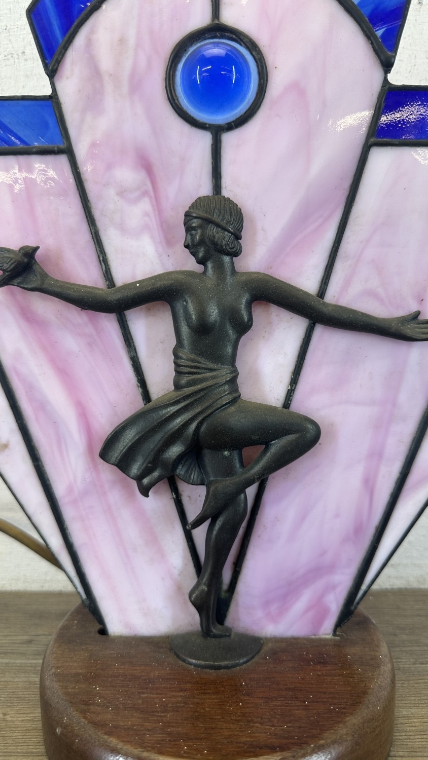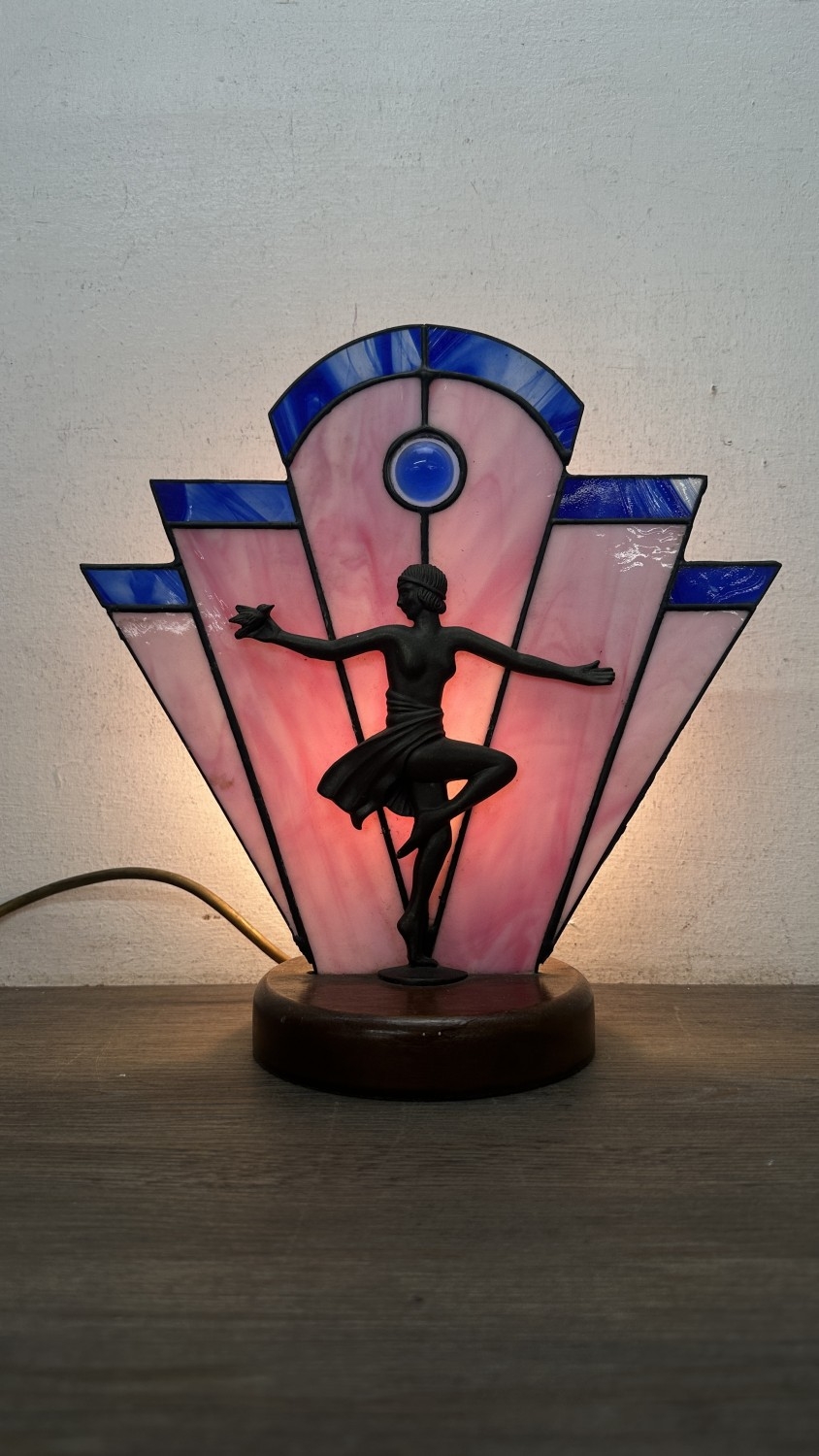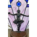 An Art Deco style Tiffany type stained glass table lamp with cast metal flapper girl design on wooden plinth - approx. 30cm high