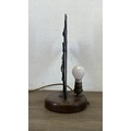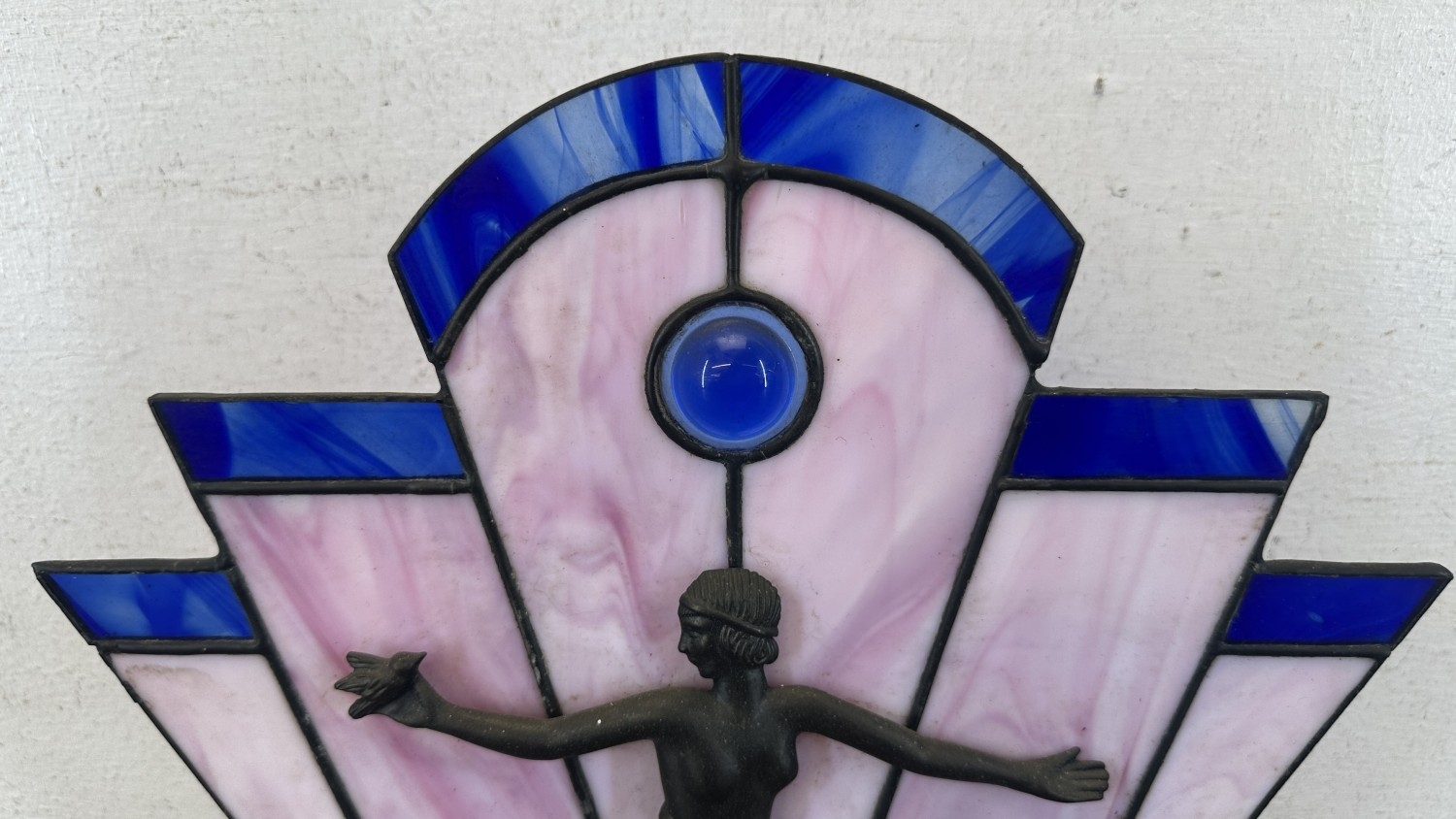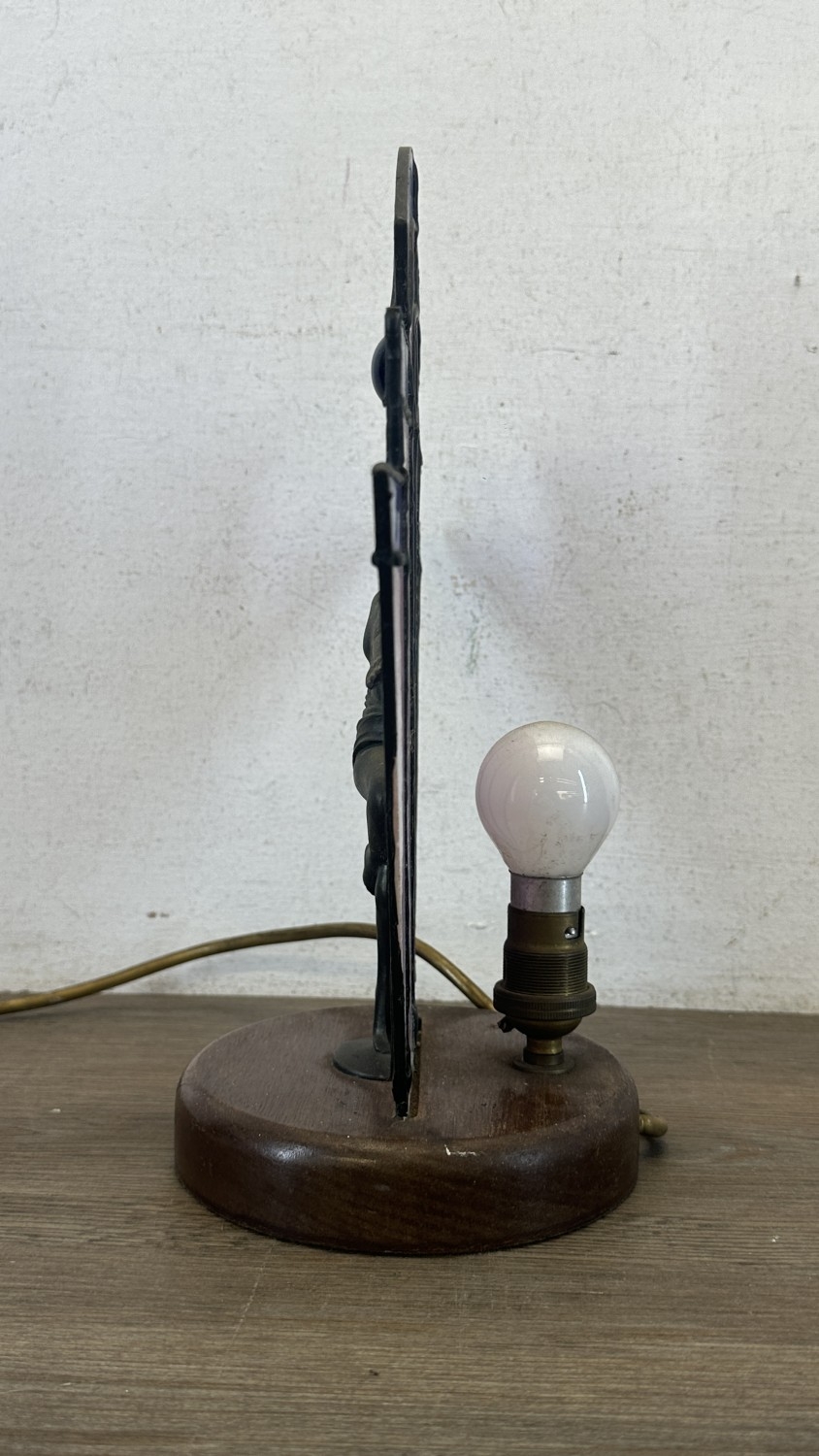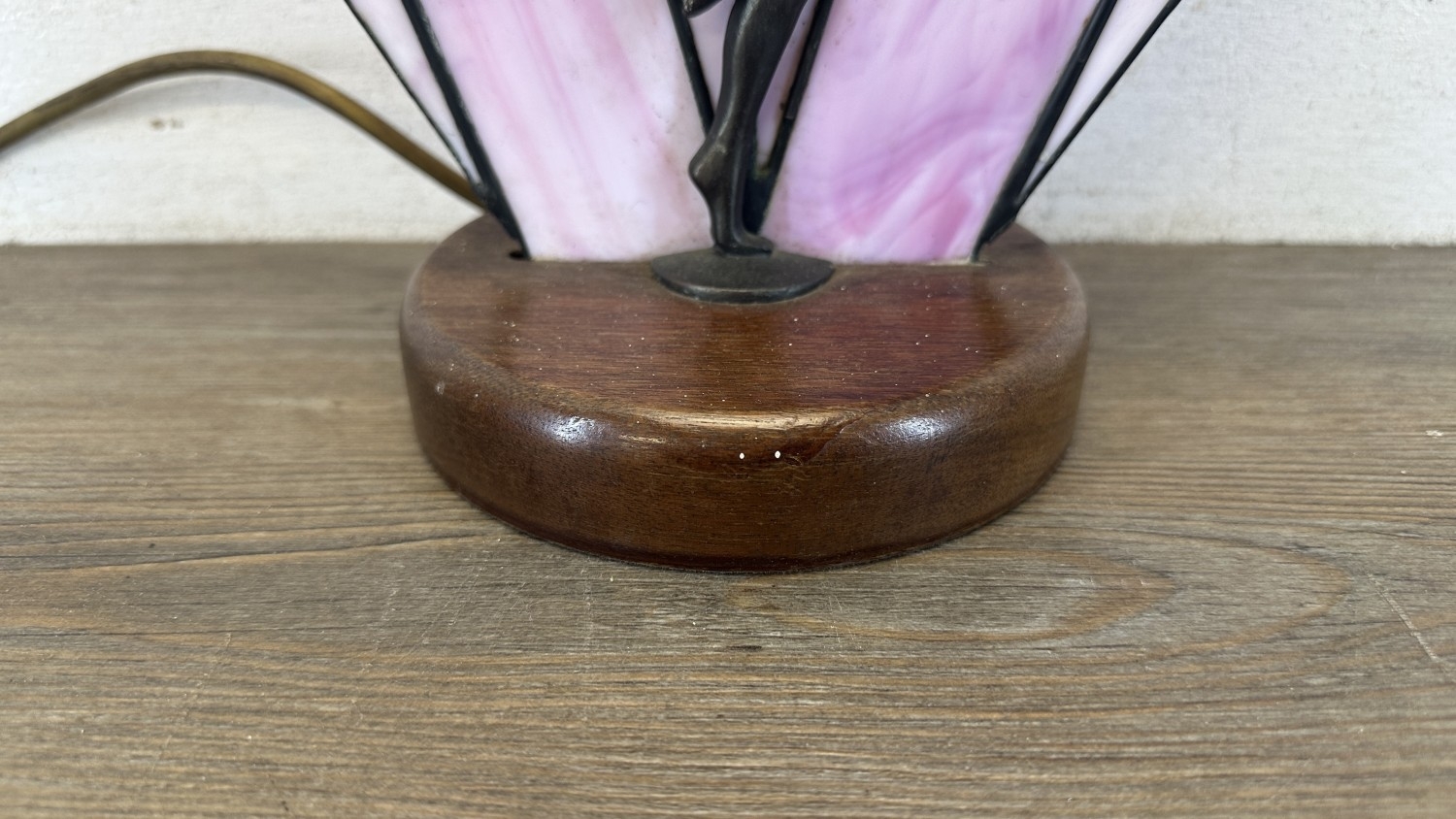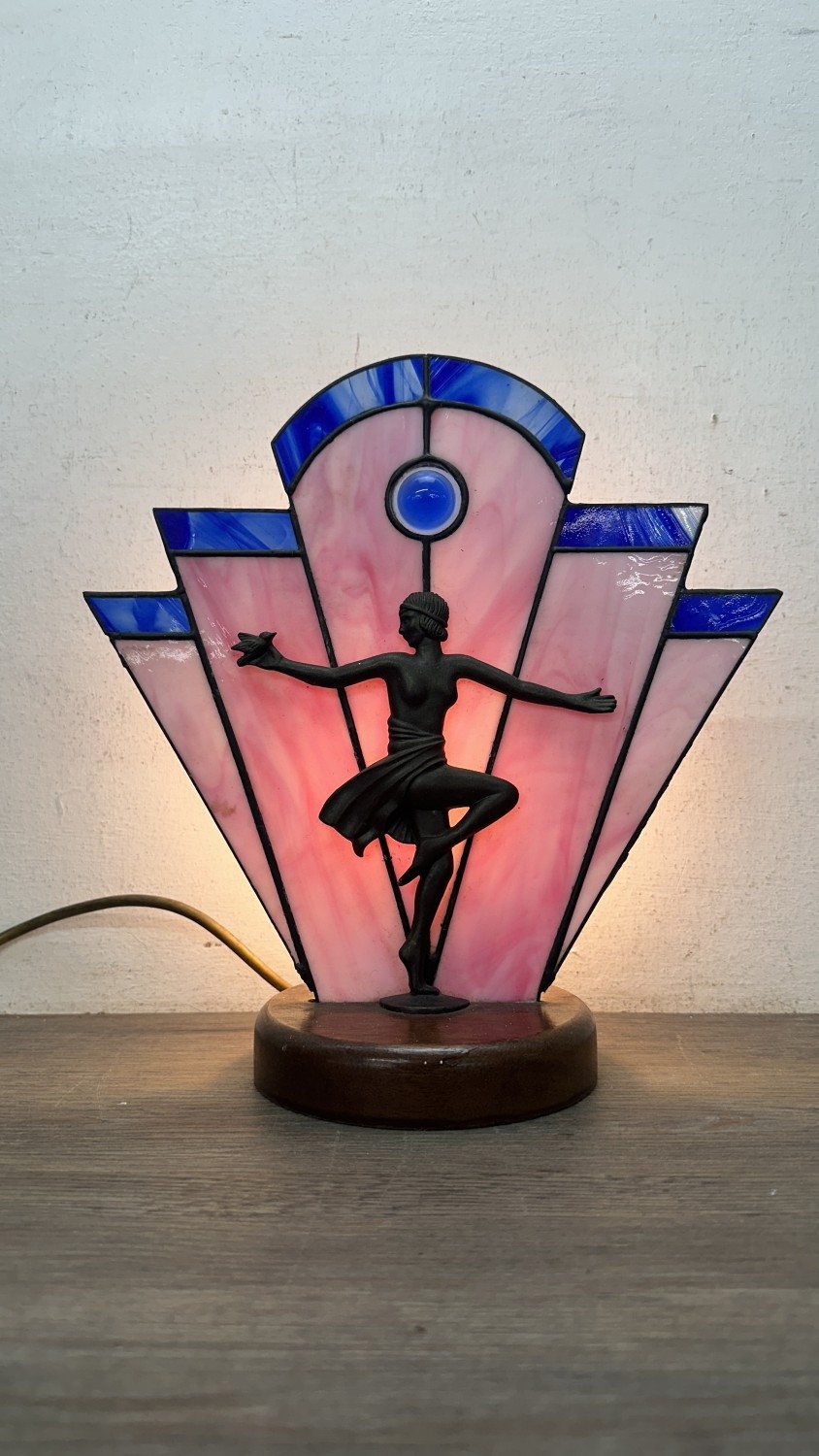 An Art Deco style Tiffany type stained glass table lamp with cast metal flapper girl design on wooden plinth - approx. 30cm high