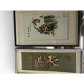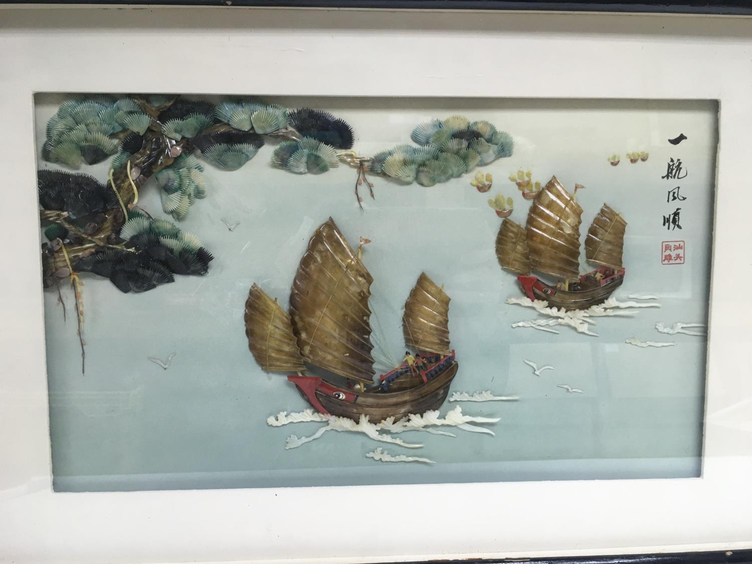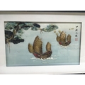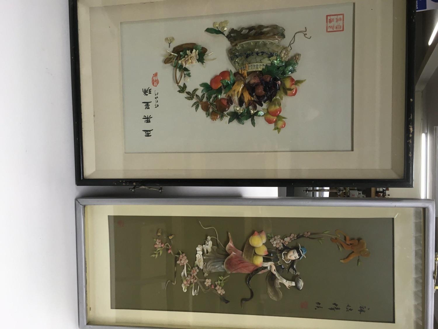 Three 20th century Chinese three dimensional Raised relief stone and mother of pearl pictures in the form of baskets of fruit and sailing junks (3). NO RESERVE.