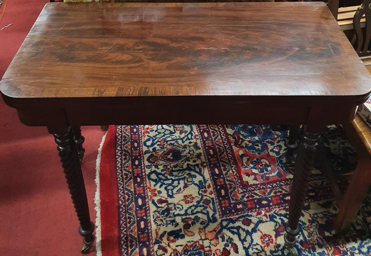 A Regency Mahogany fold over Card Table with barley twist supports. 94 x 92 x 75 cms approx.