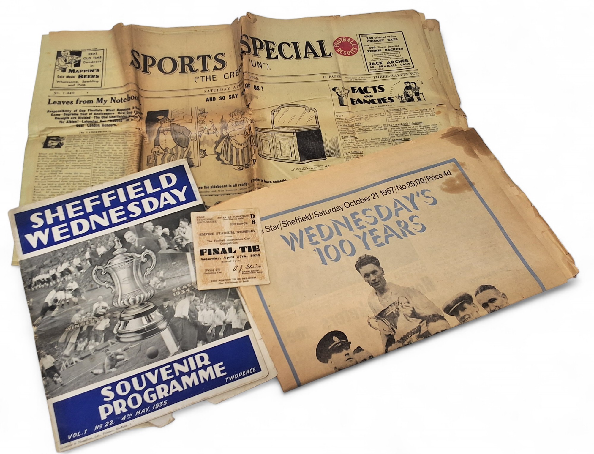 Sheffield Wednesday memorabilia - a 'The Football Association Cup Competition' Final Tie ticket held at the Empire Stadium, Wembley on 27th April, 1935, Sheffield Wednesday vs. West Bromwich Albion; a Sheffield Wednesday Souvenir programme, Vol.1 no.22 4th May 1935, folded, back cover loose; a Sports Special "The Green 'Un" Saturday, April 27th 1935, fold, poor condition; a pull out for the Sheffield Star 'Wednesday's 100 Years' October 21, 1967, folded, tears to page edges