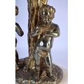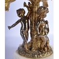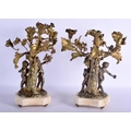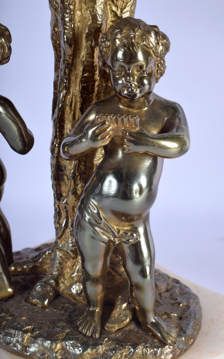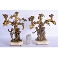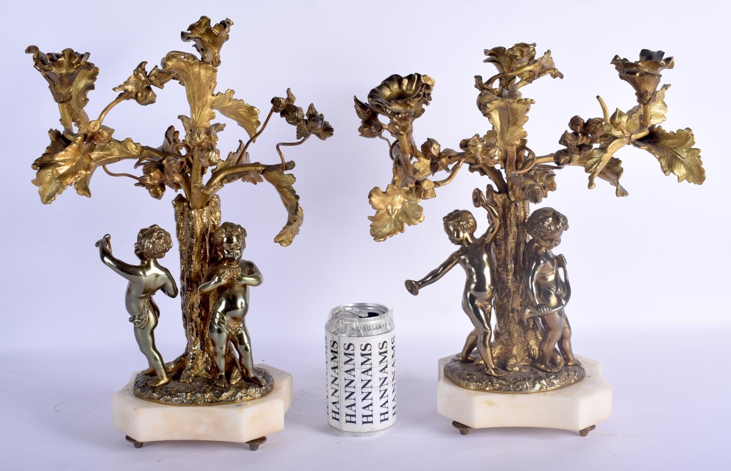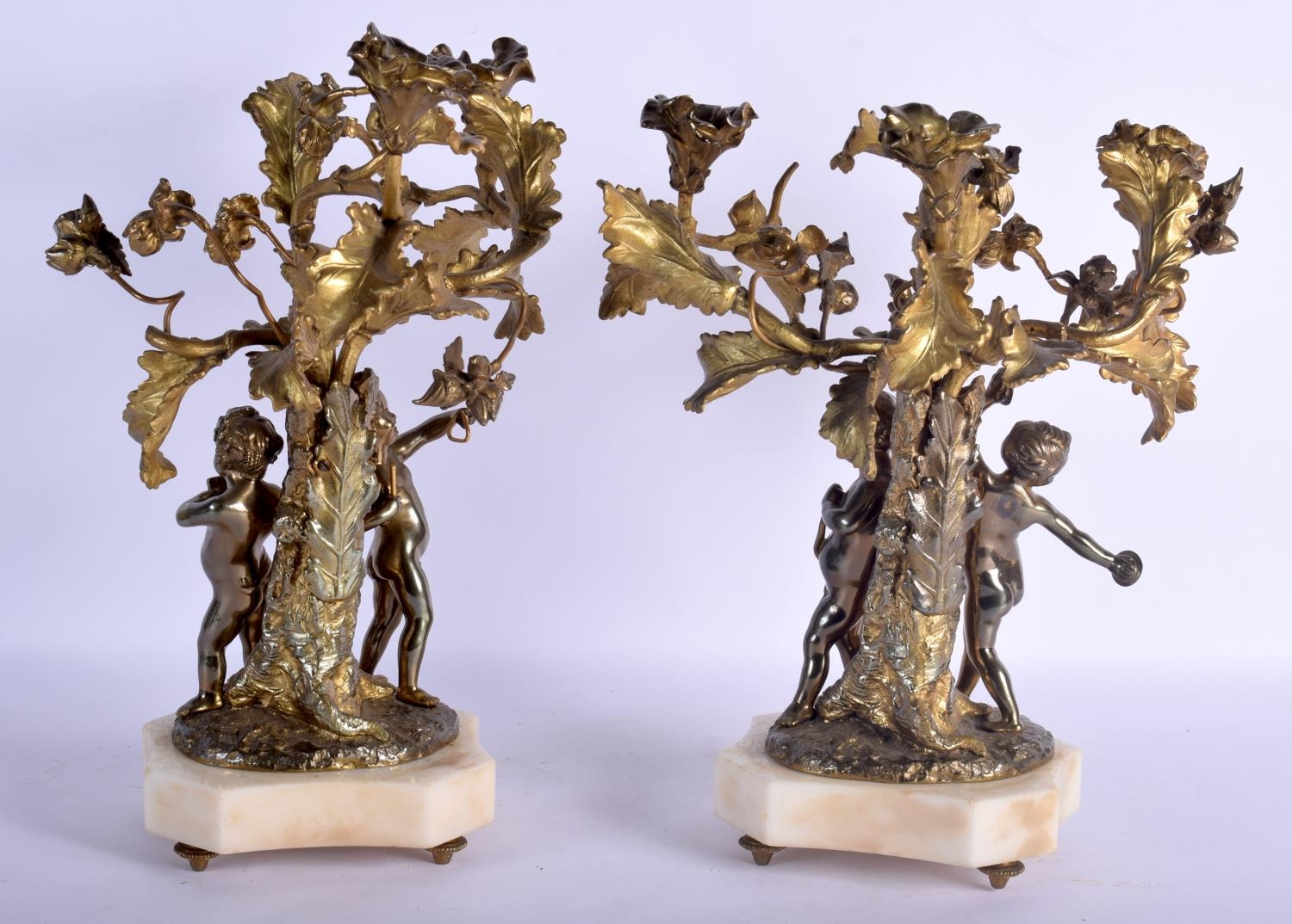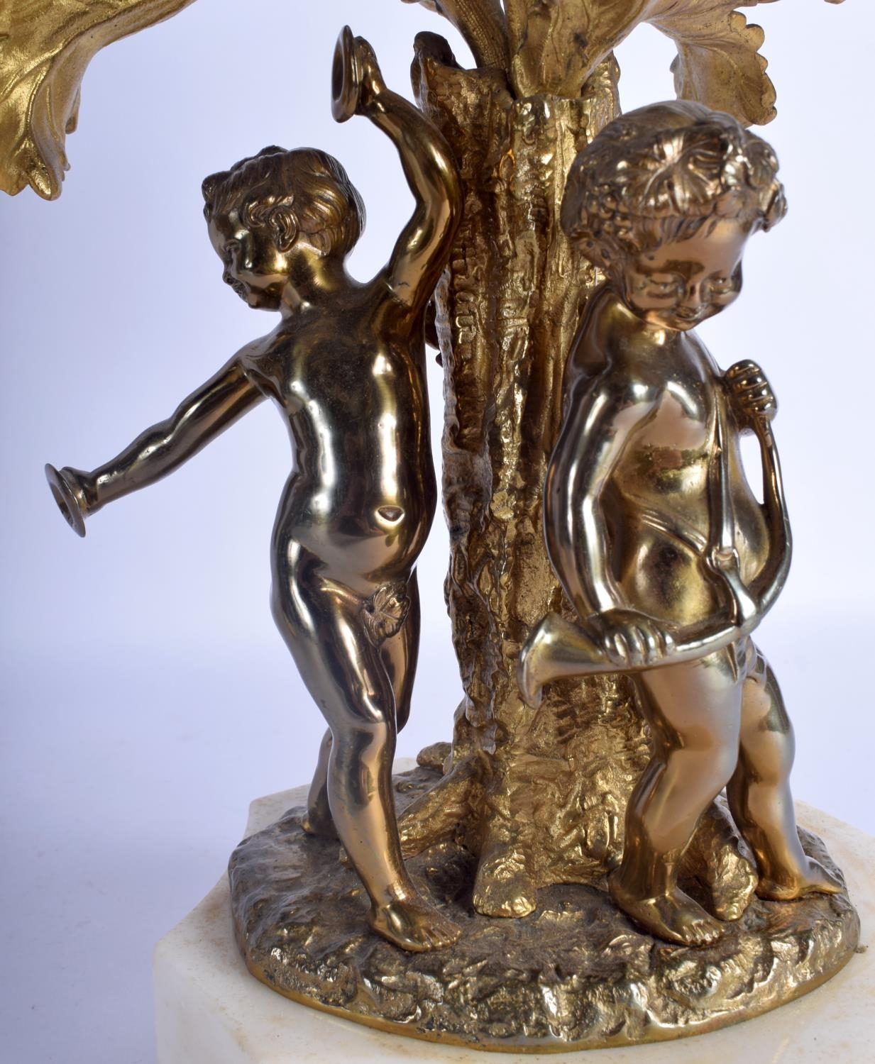 A PAIR OF 19TH CENTURY FRENCH GILT BRONZE AND ORMOLU CANDLEABRA modelled as putti playing instruments upon marble bases. 42 cm x 24 cm.