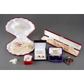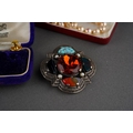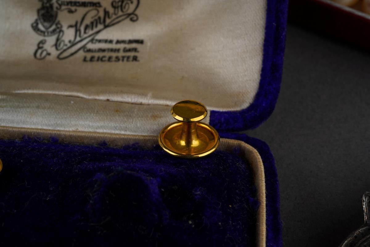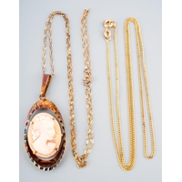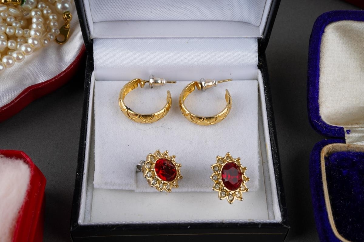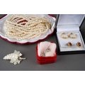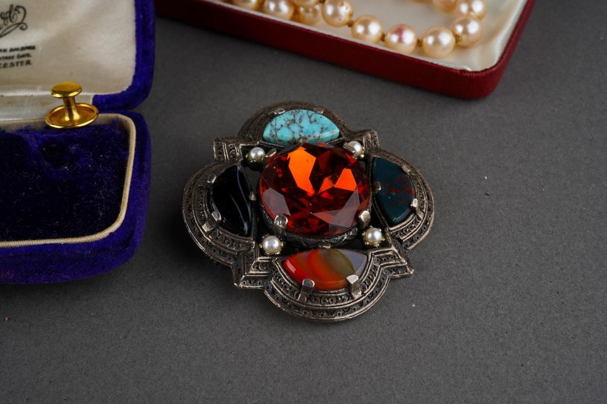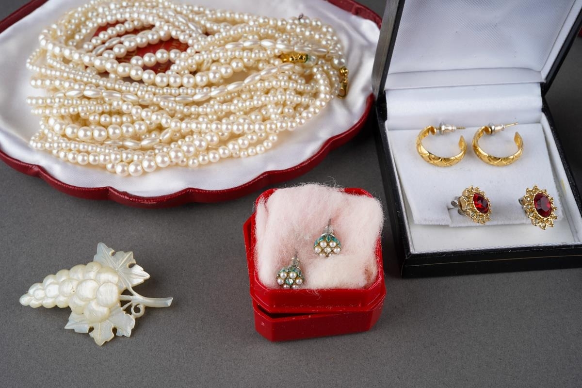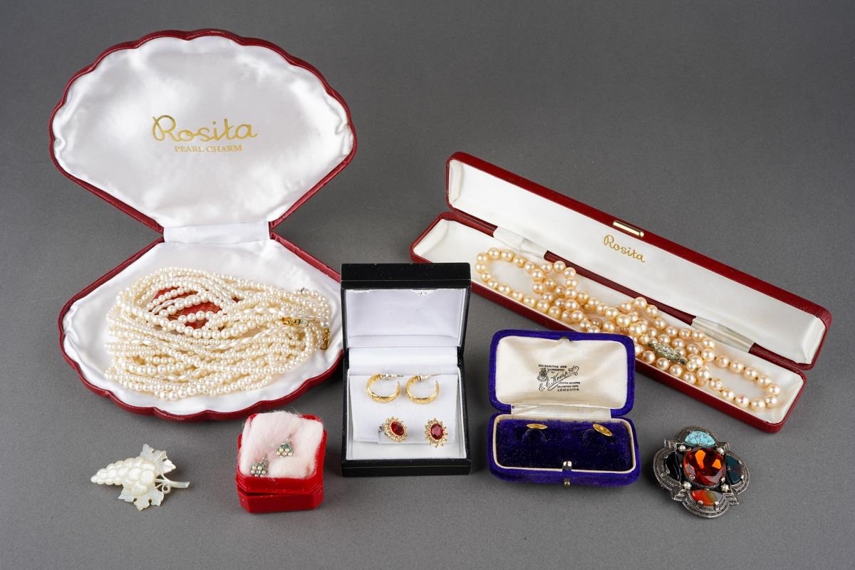 Collection of costume jewellery to include a pair of 9 ct gold studs (1g approx), Scottish brooch, pear necklaces, mother of pearl carved brooch etc.