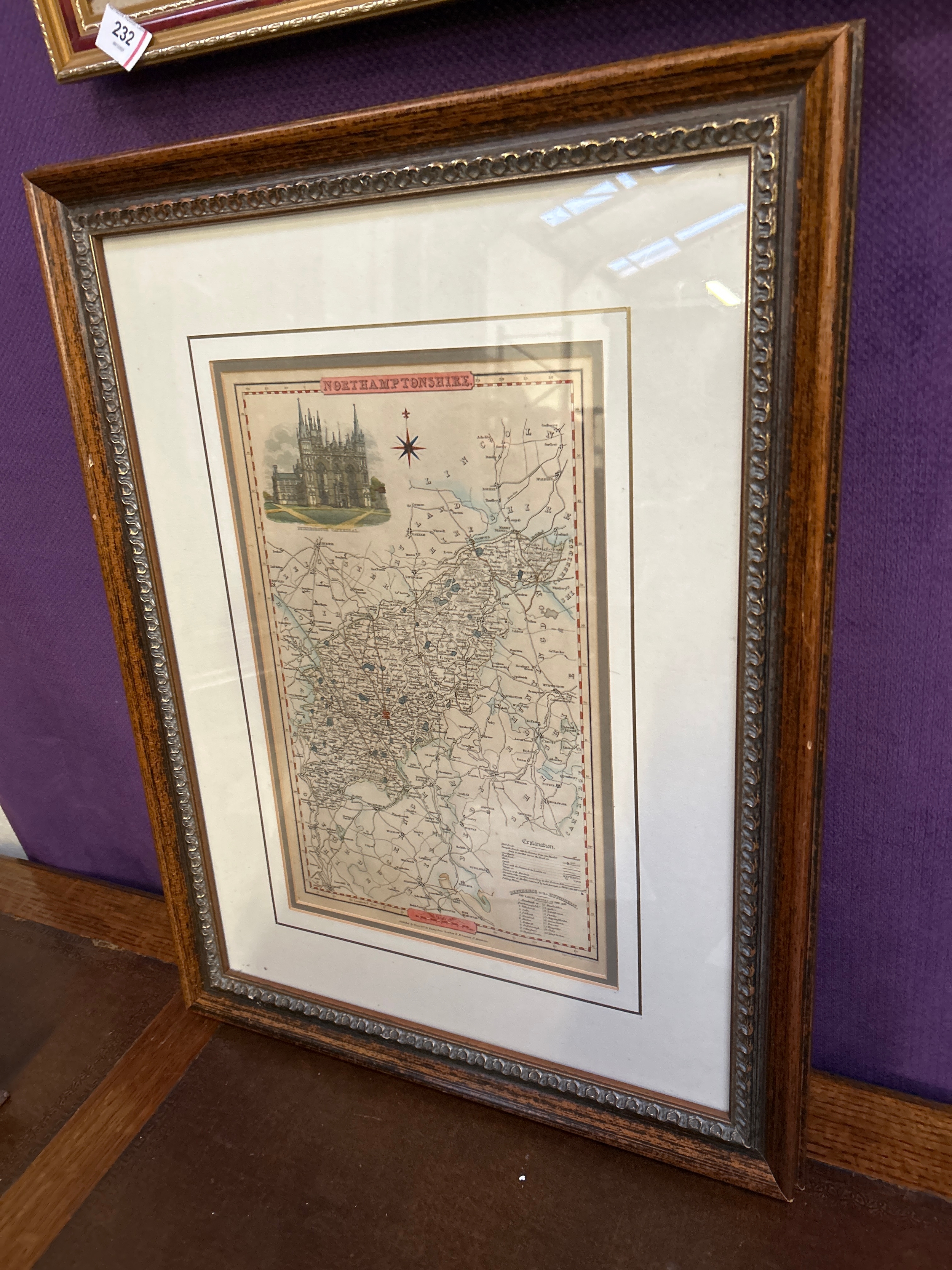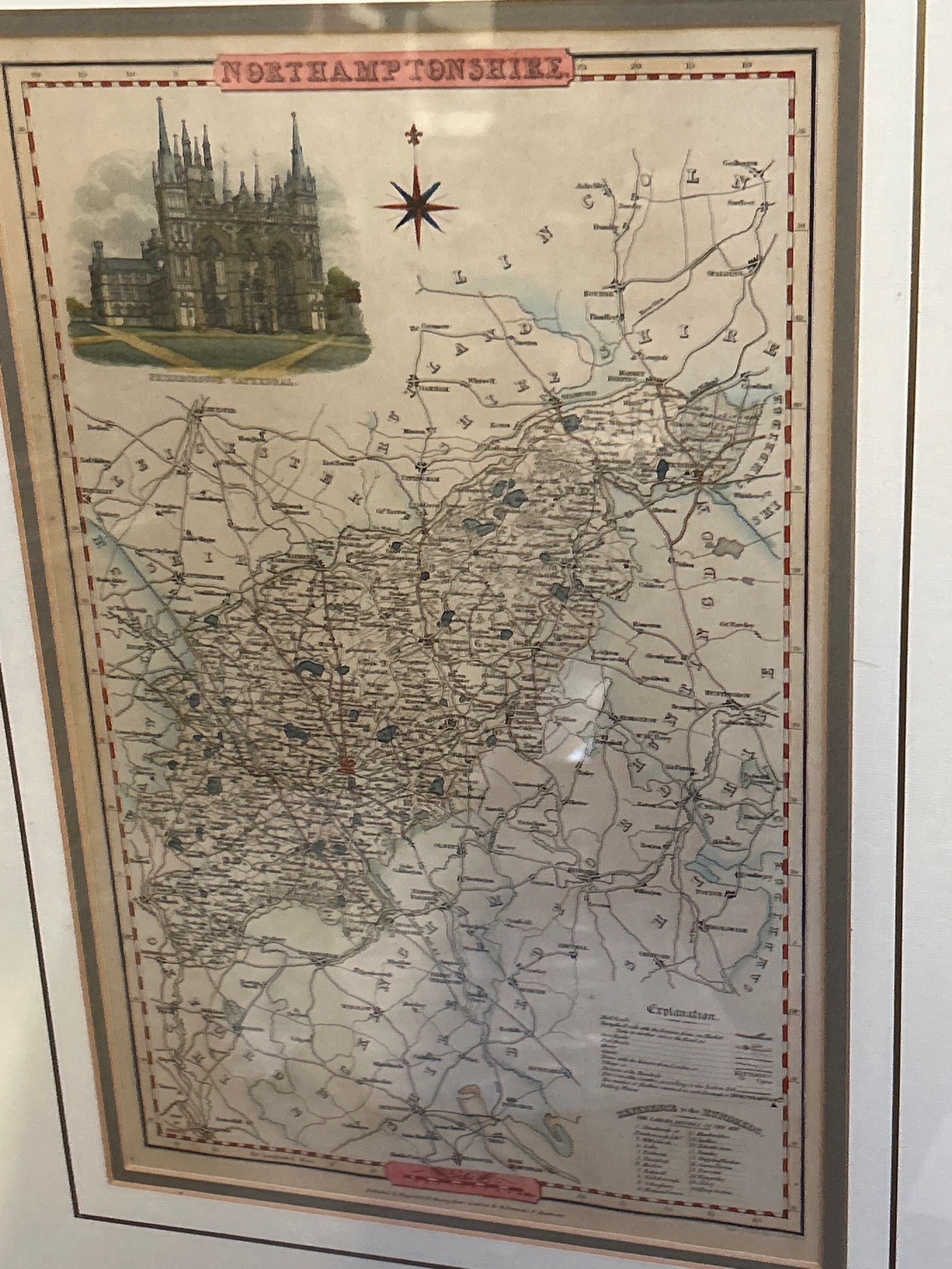 An original 1836 map of Northamptonshire by James Pigot from his British Atlas of the Counties of England. Hand coloured with view of Peterborough Cathedral. 24cm x 38cm.