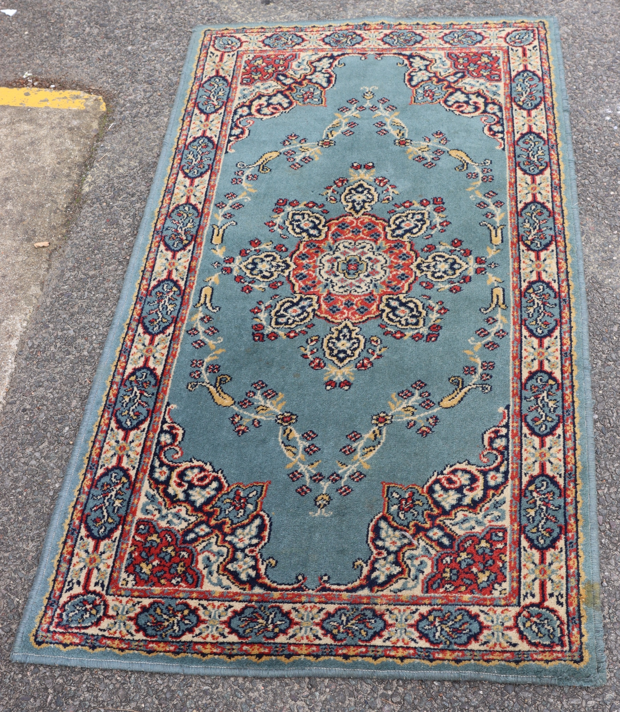A small rug on blue ground, 138cm x 70cm (some spots and marks).