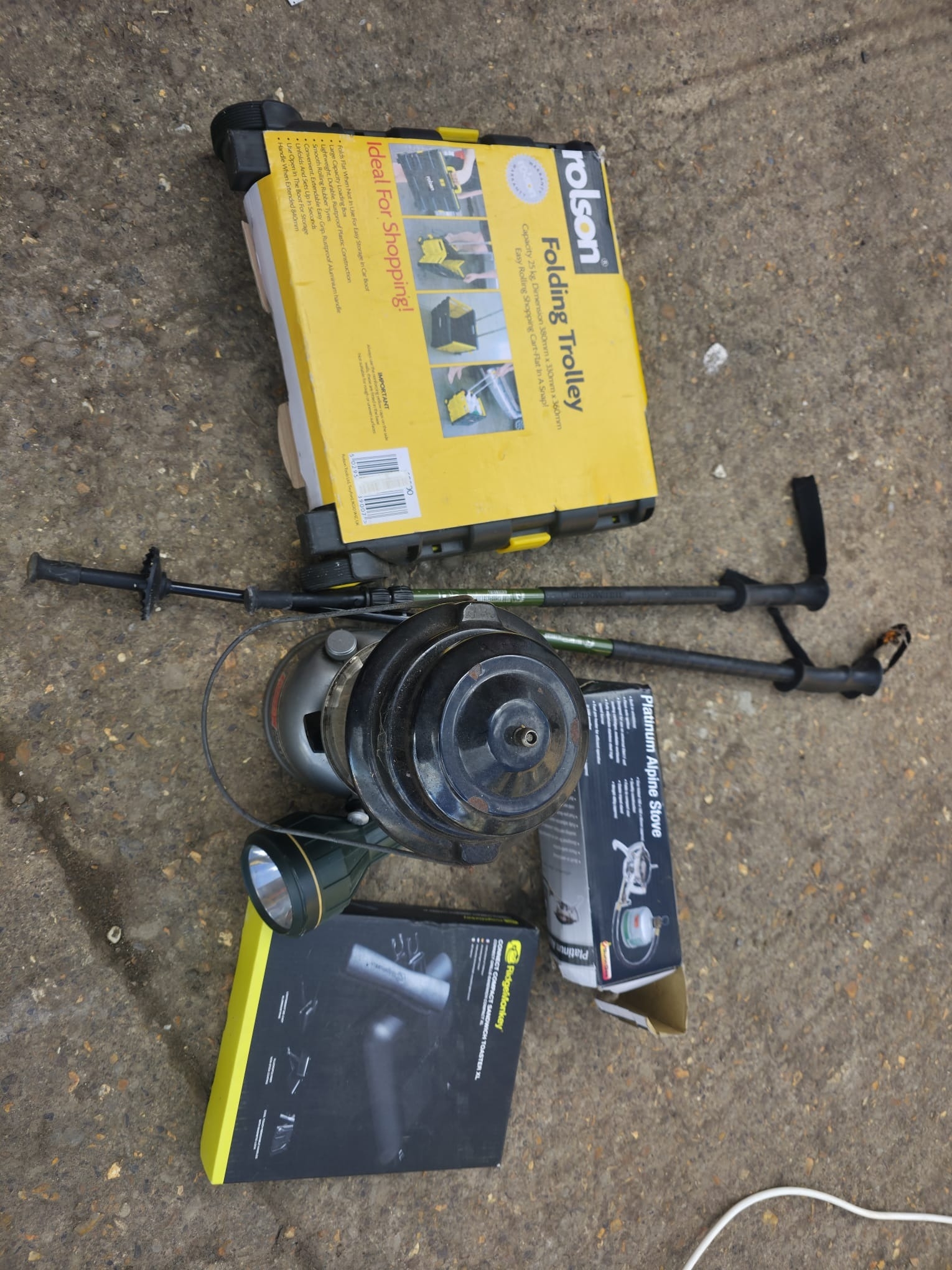 A mixed group of camping and outdoor equipment comprising a Rolson folding trolley (boxed), a Platinum Alpine camping stove (boxed), a portable lantern/torch, a pair of walking poles and additional accessories including boxed tool items. Items appear in used condition with some wear and signs of previous use, boxes present but condition varies and contents untested. An ideal assortment for camping, hiking or general outdoor use. Sold as seen with no guarantees as to completeness or working order.