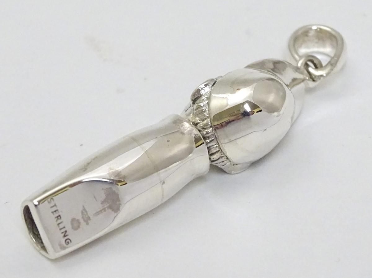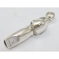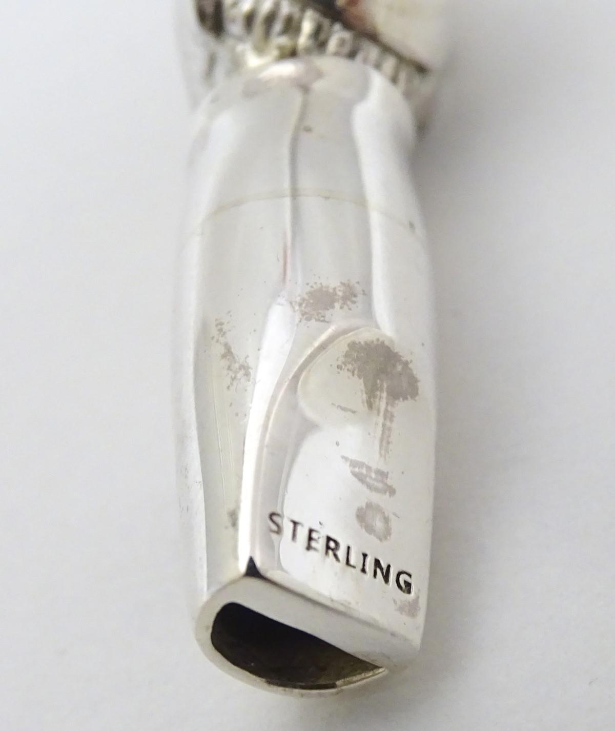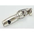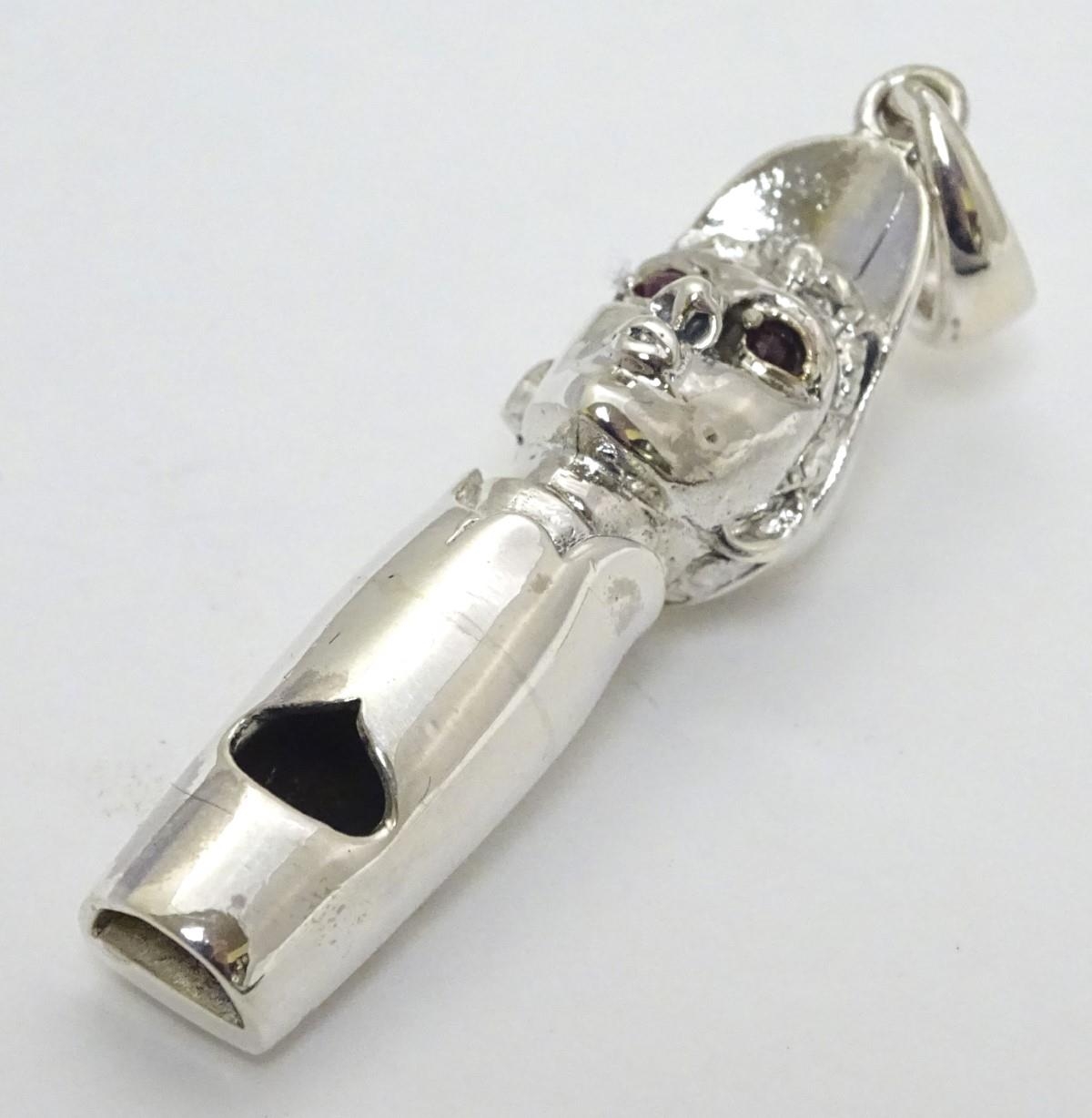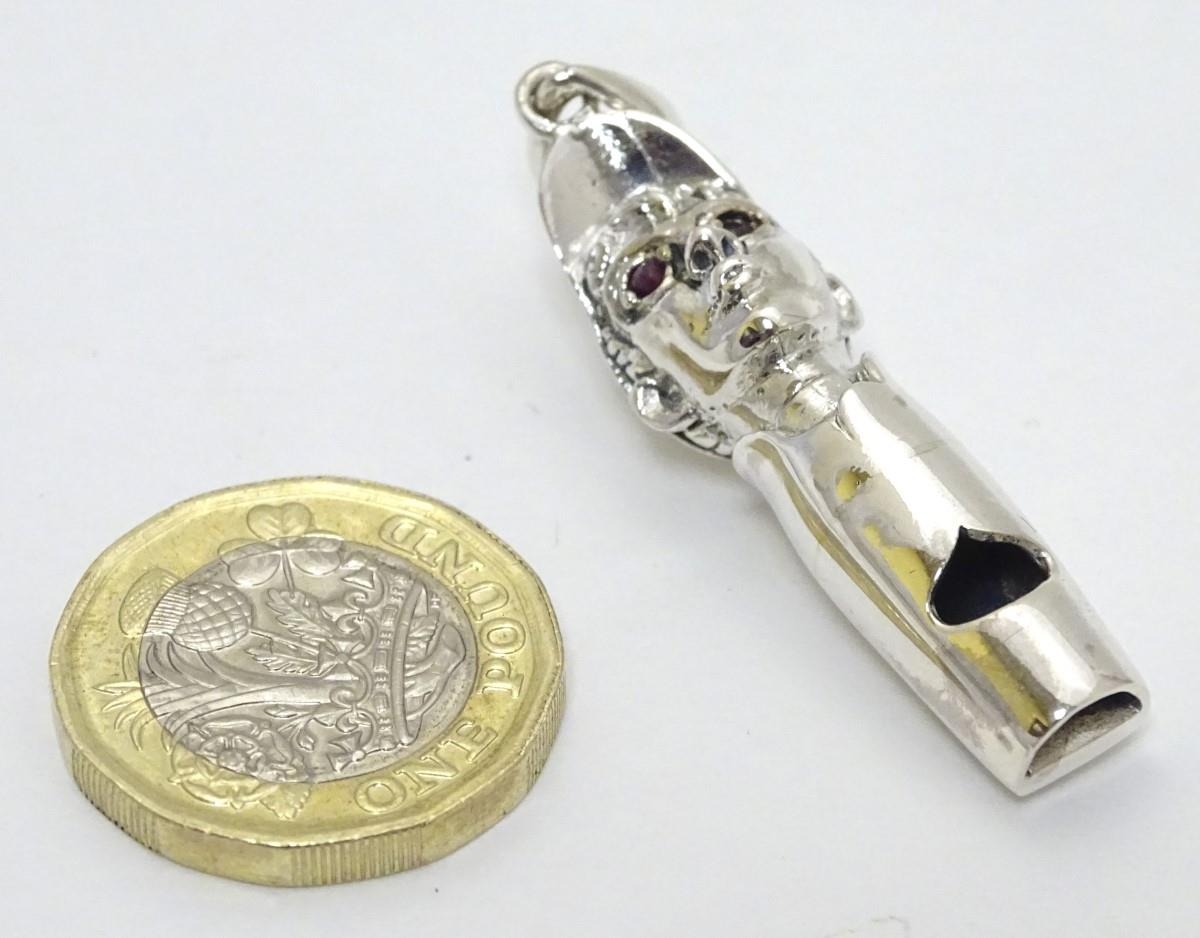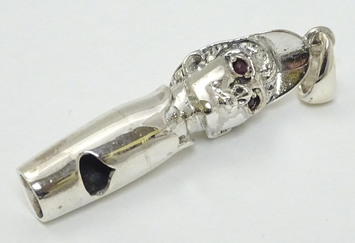 Horse Racing Interest: A novelty whistle formed as the head of a jockey with red stone eyes. Marked 'Sterling' 1 3/4'' long