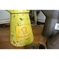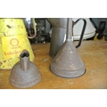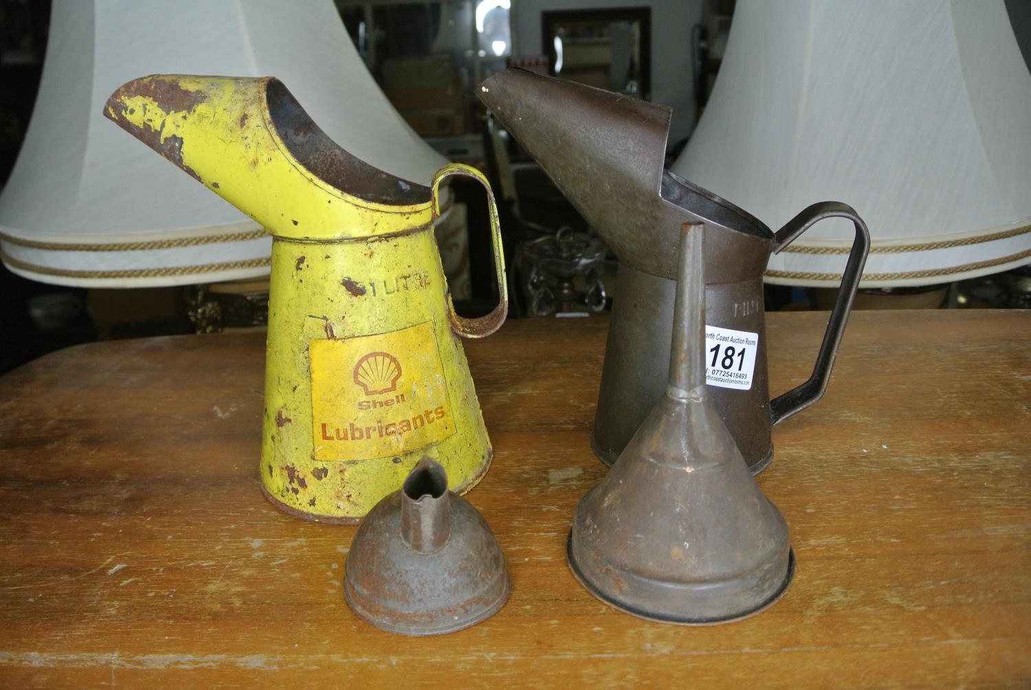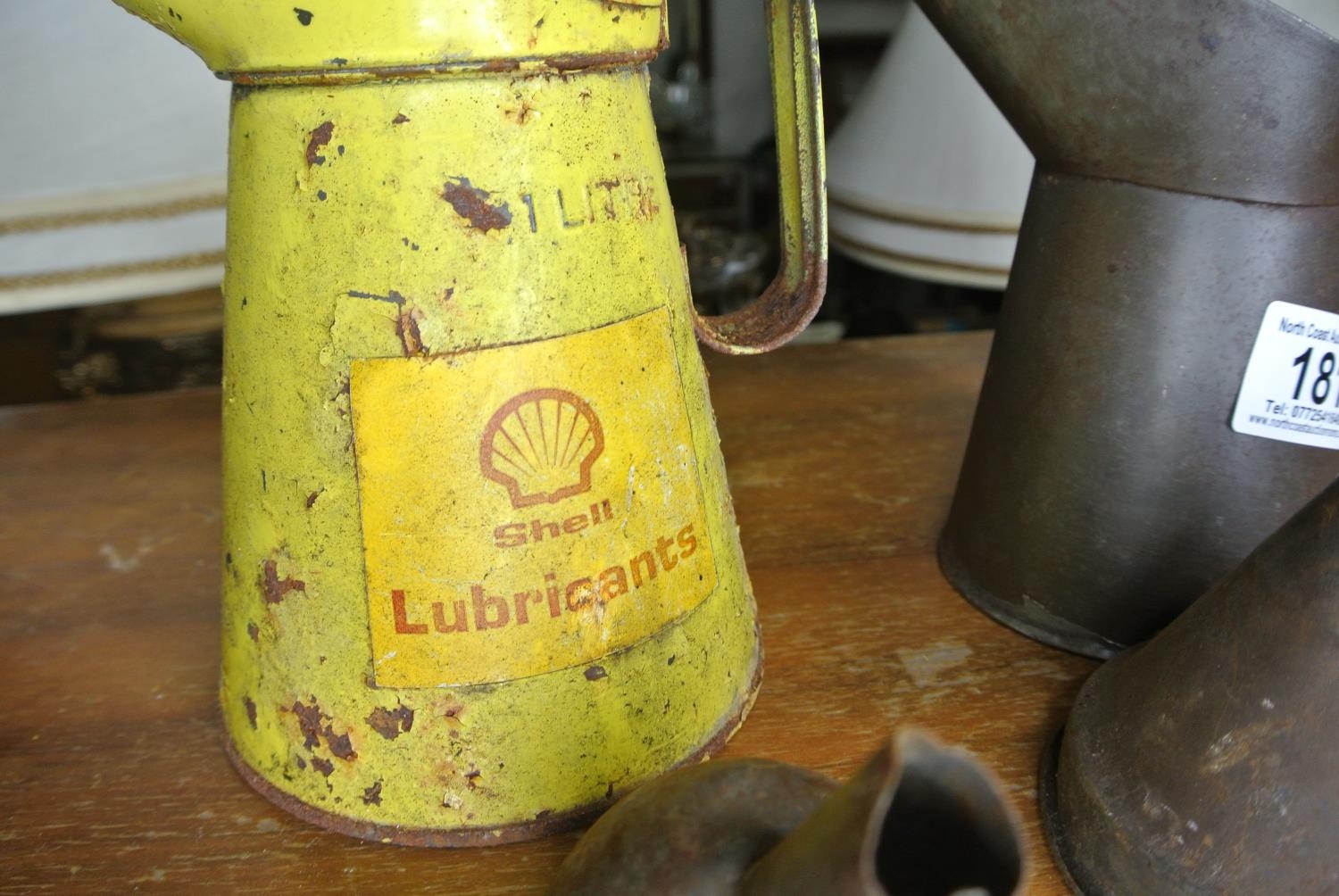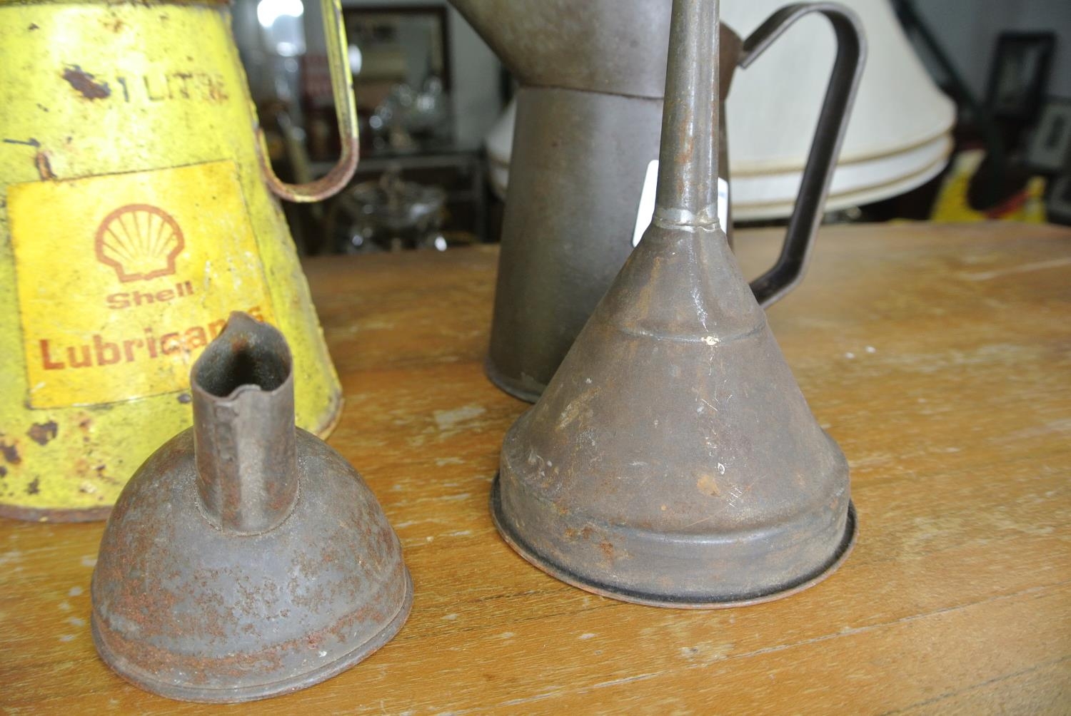 A Shell Lubricants oil can, another oil can and two funnels.