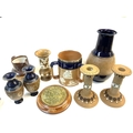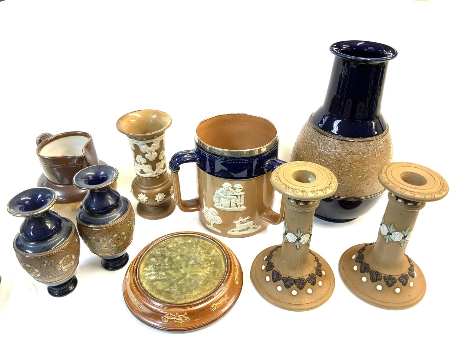 A collection of Royal Doulton Lambeth pottery to include a Silver rimmed Tyg, Harvest Jug.