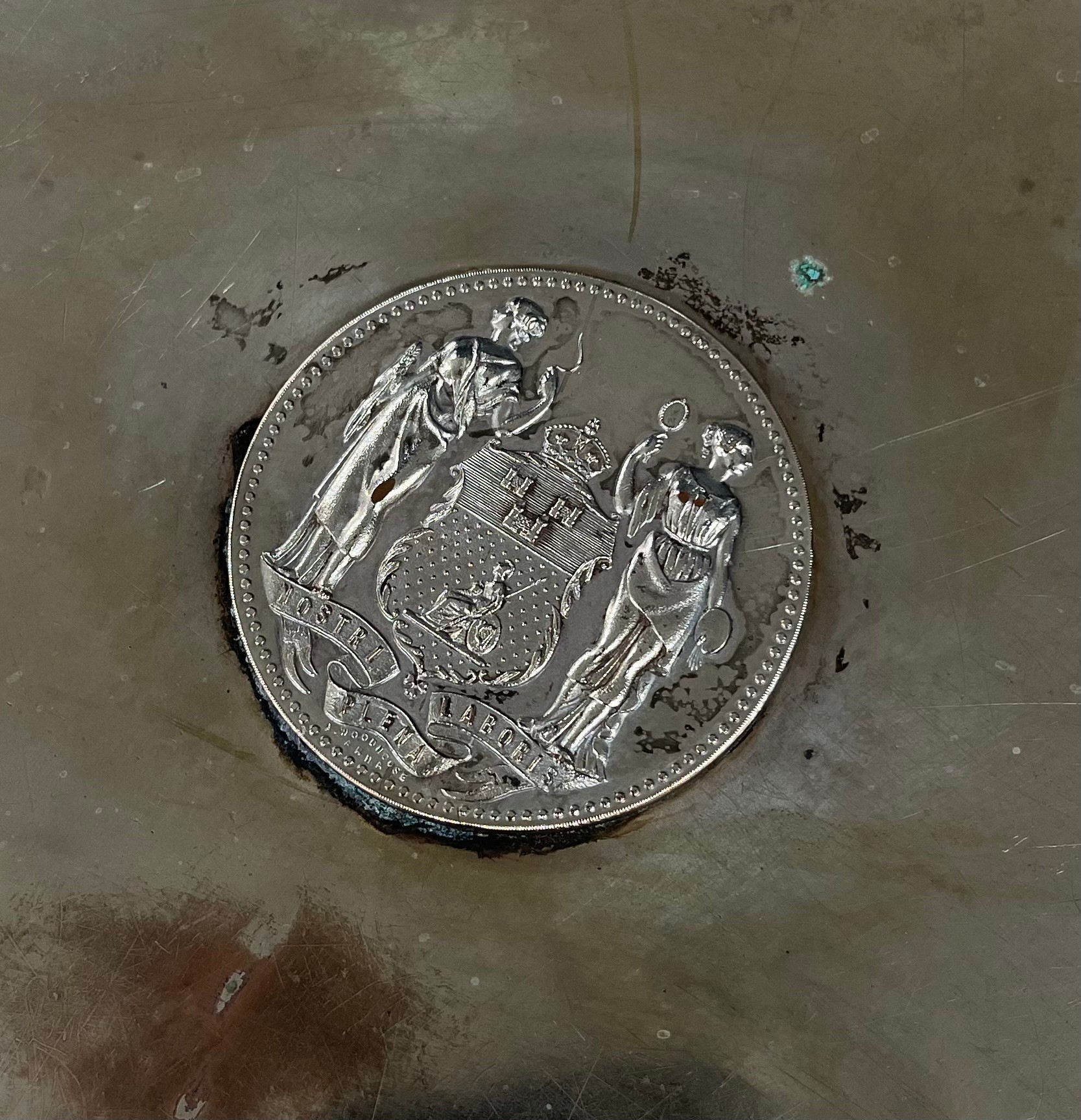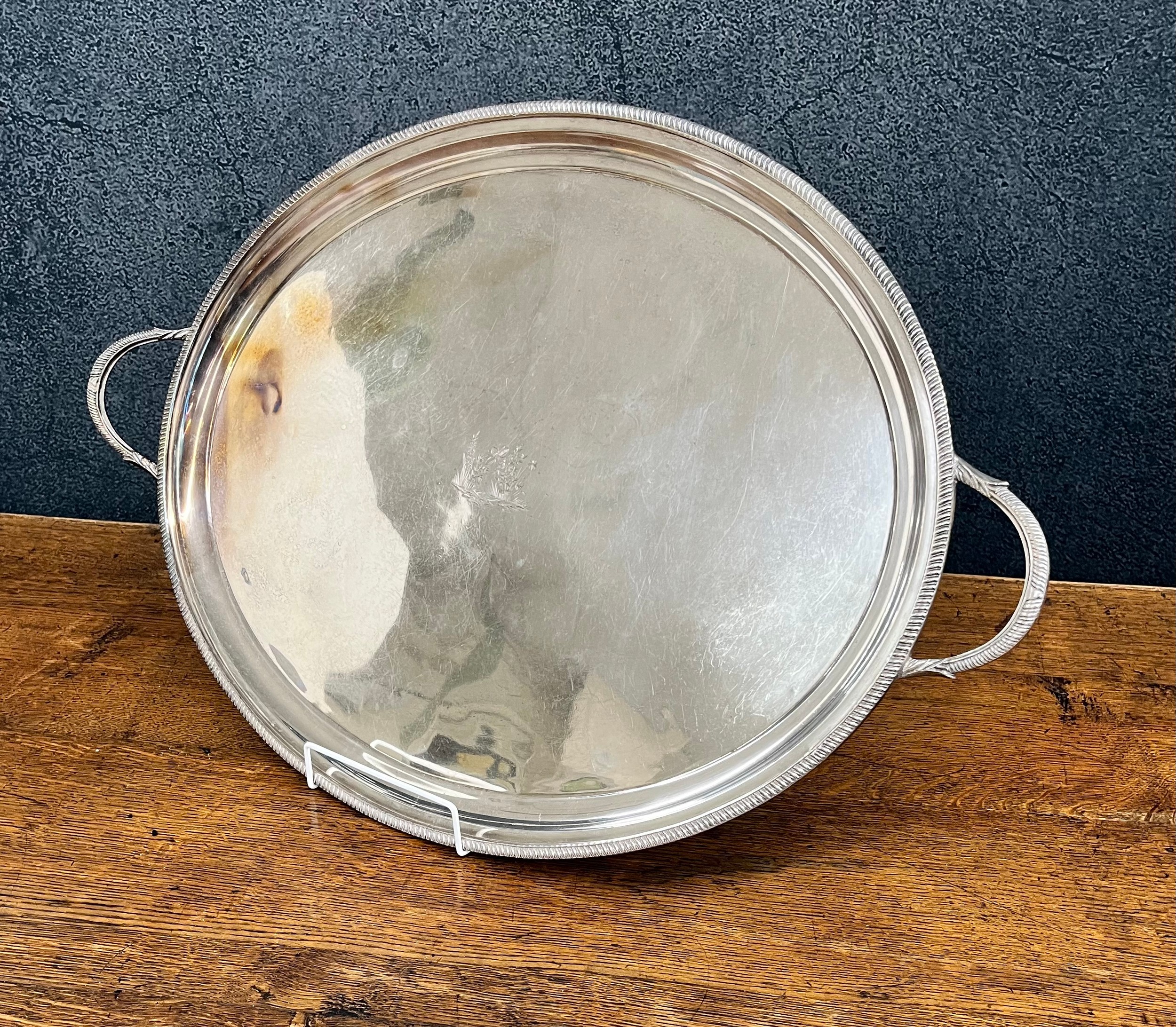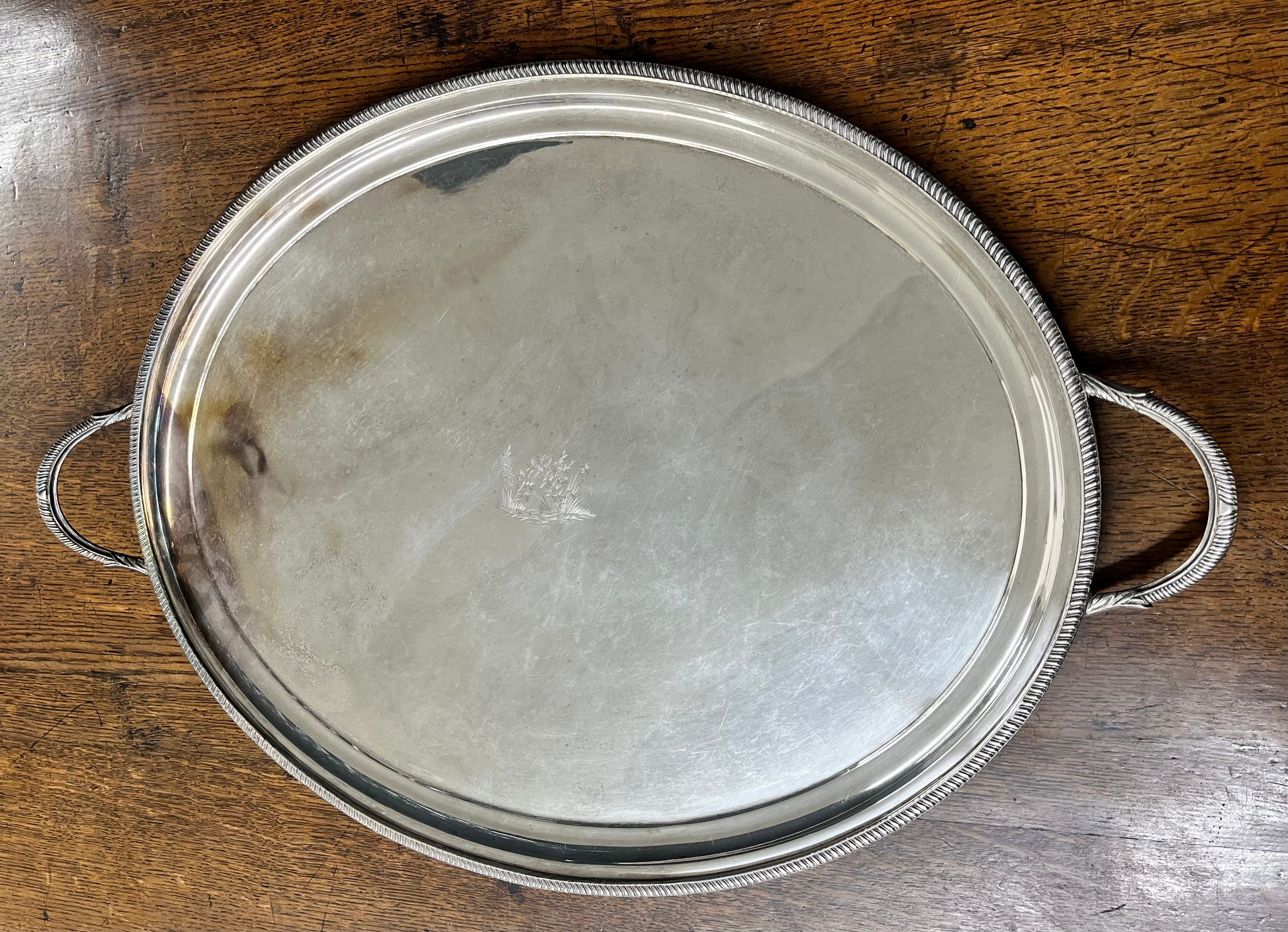 Silver plated oval twin handled tray, with gadroon border, engraved to the centre with a bee among flowers, 28.5" long