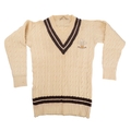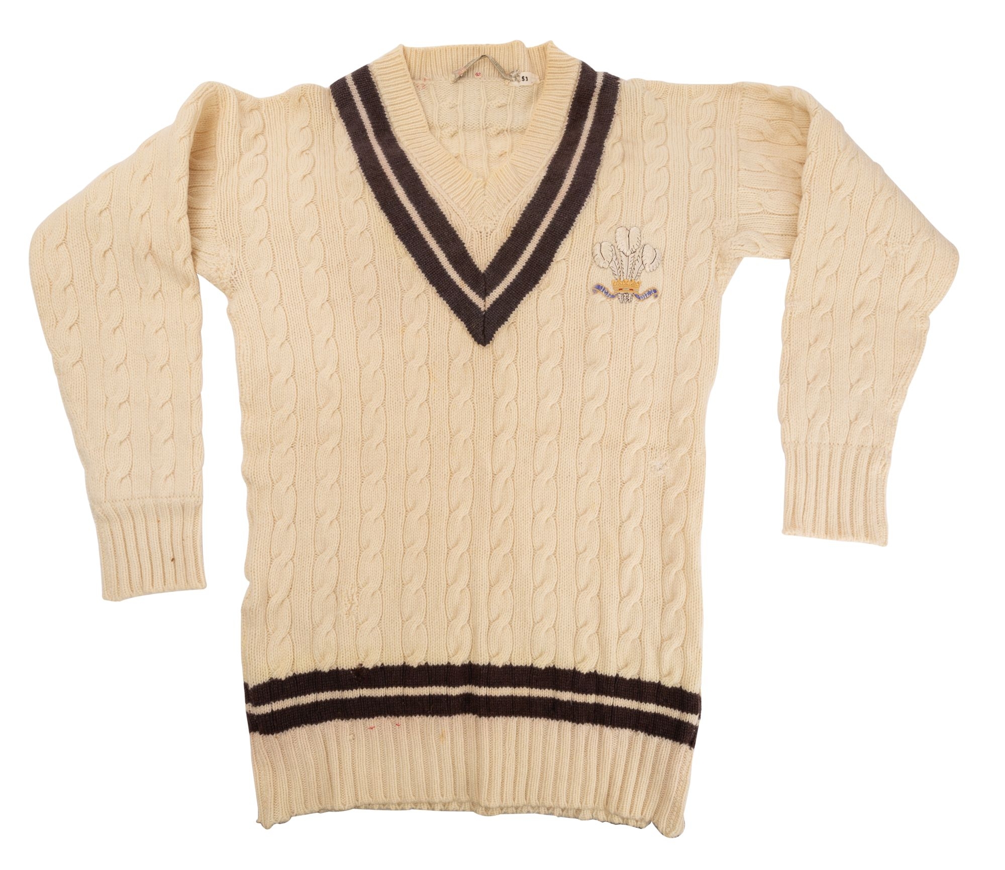 Percy G.H. Fender cricket archive: 1920's: A Surrey cricket sweater/ jumper, brown coloured bands, embroidered Prince of Wales Feathers, bearing a Jack Hobbs Ltd, Fleet Street, London, with a red label 42 and laundry ticket S3, long in the body.