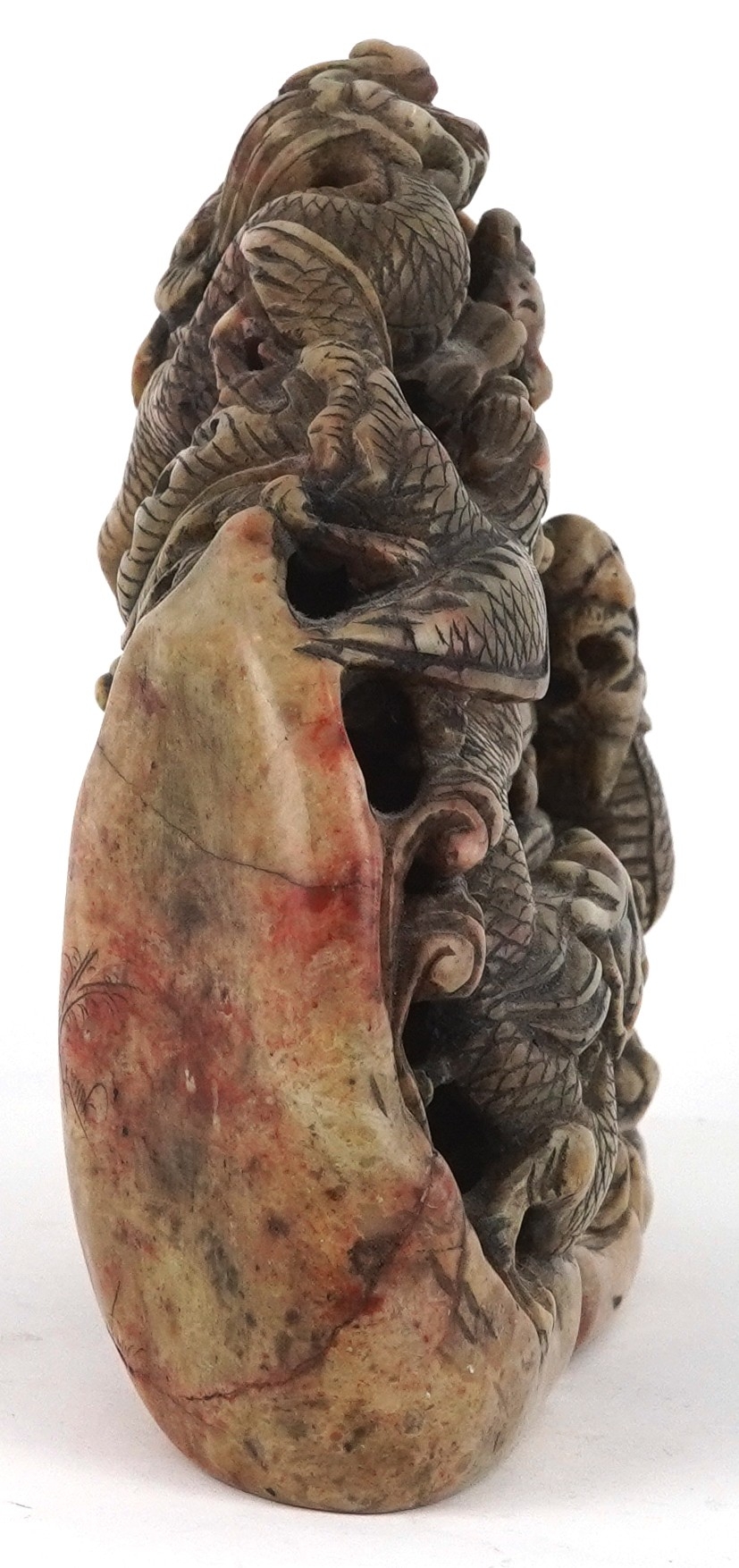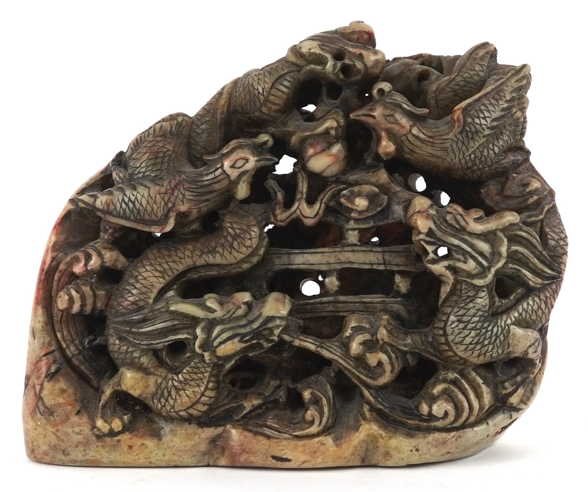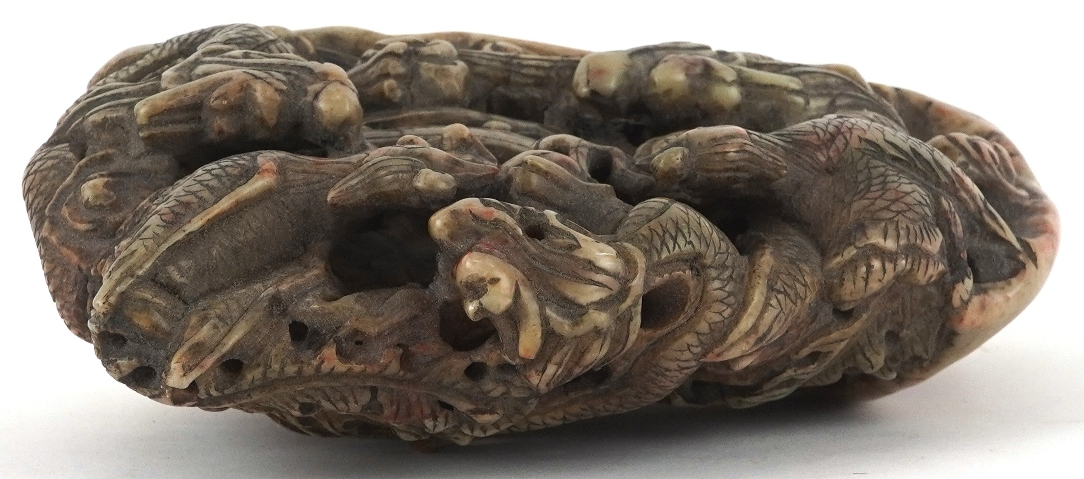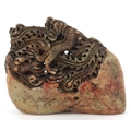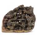 A Chinese soapstone carving of dragons and mythical creatures, character marks to the base, 13.5cm high.