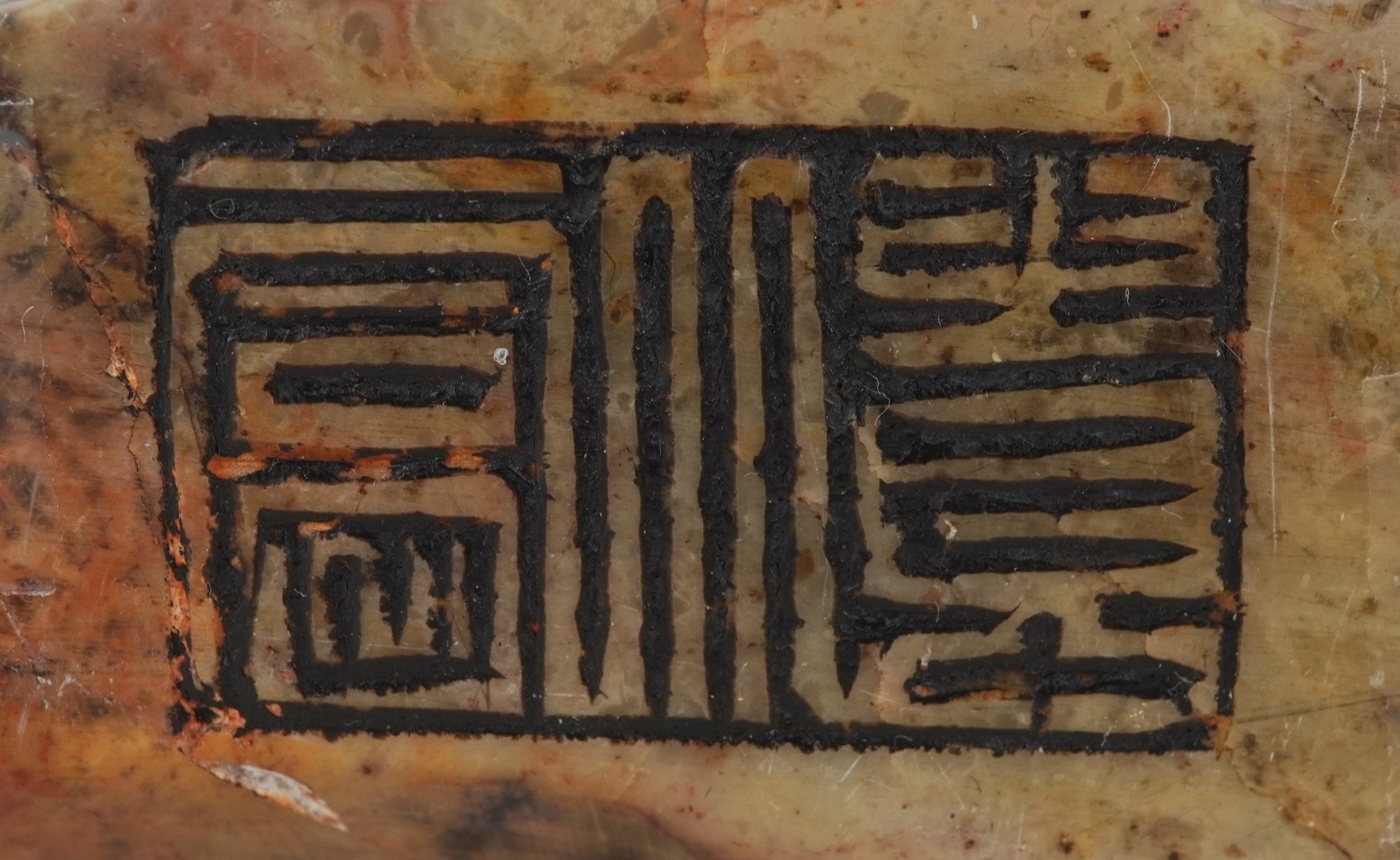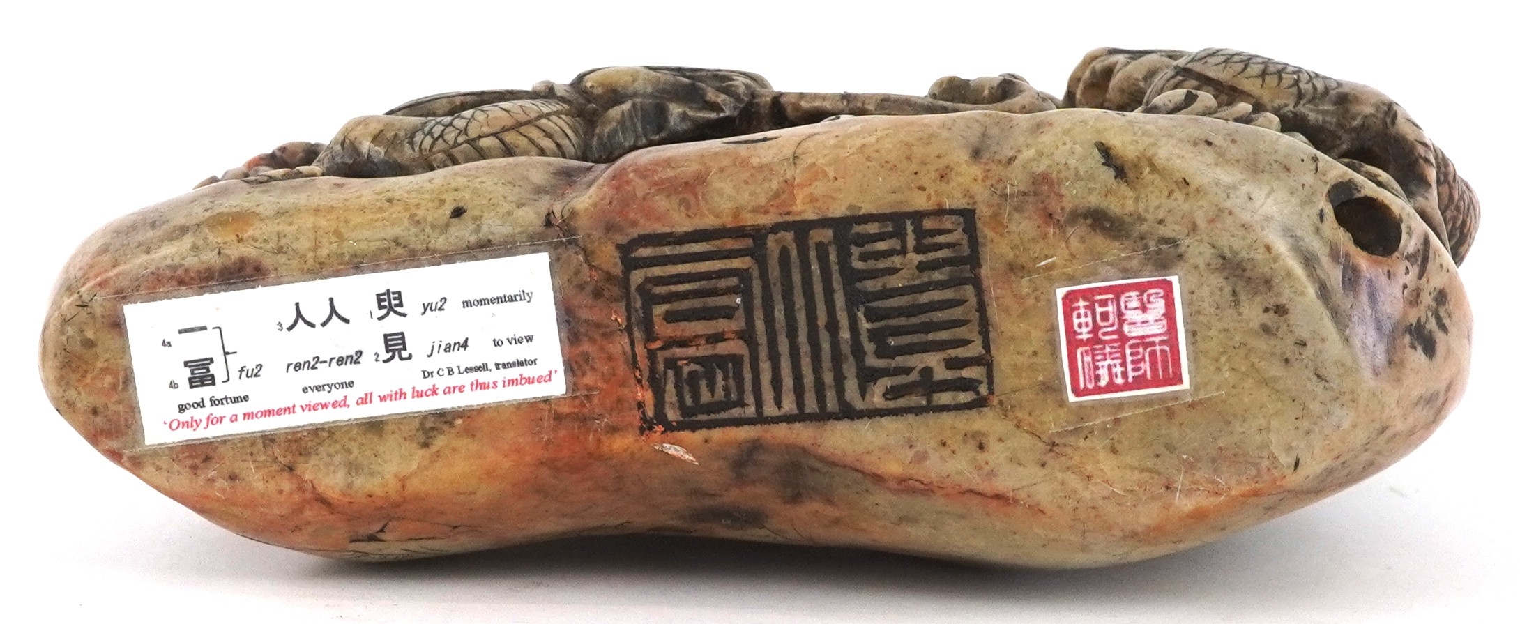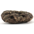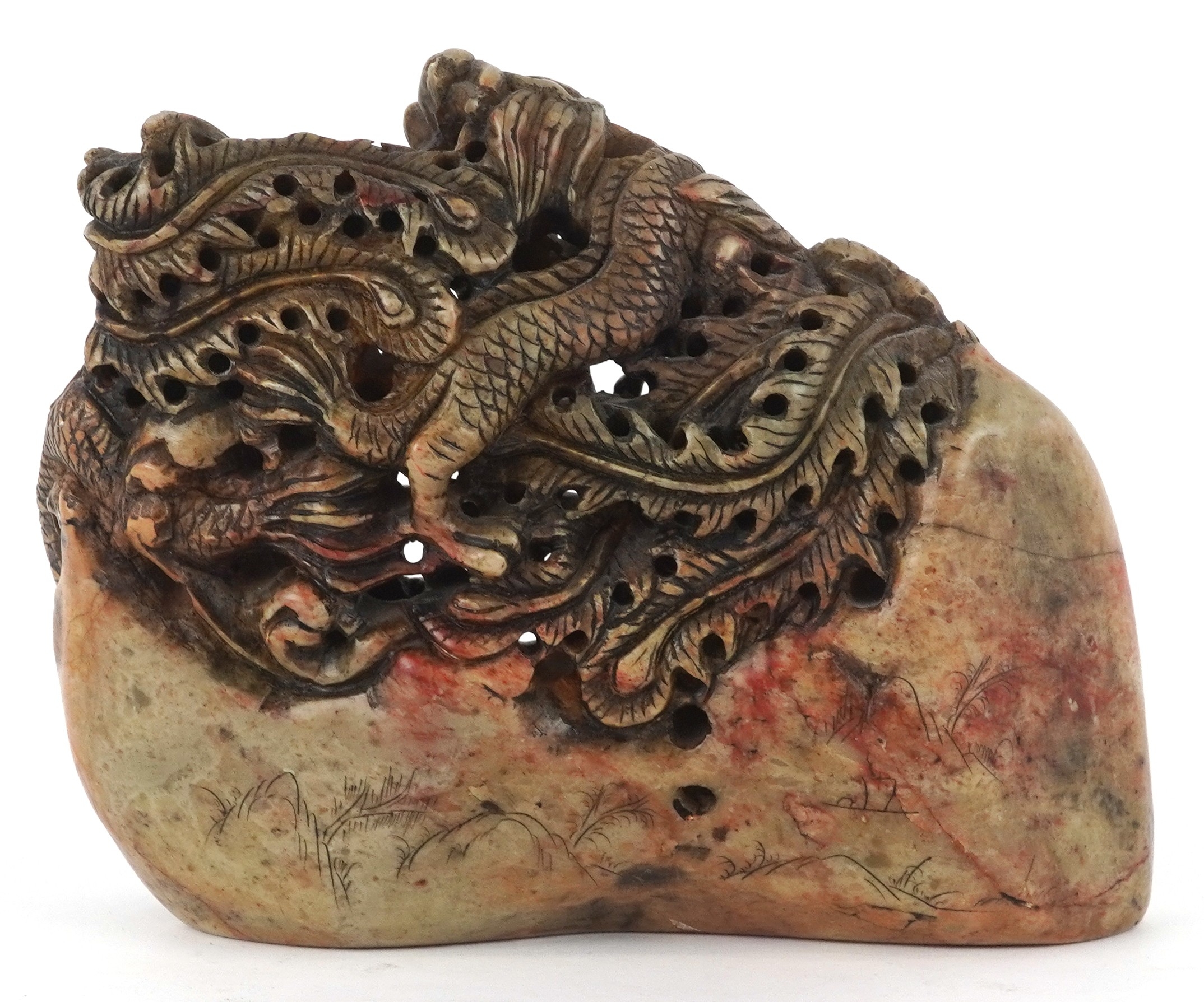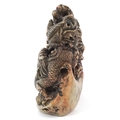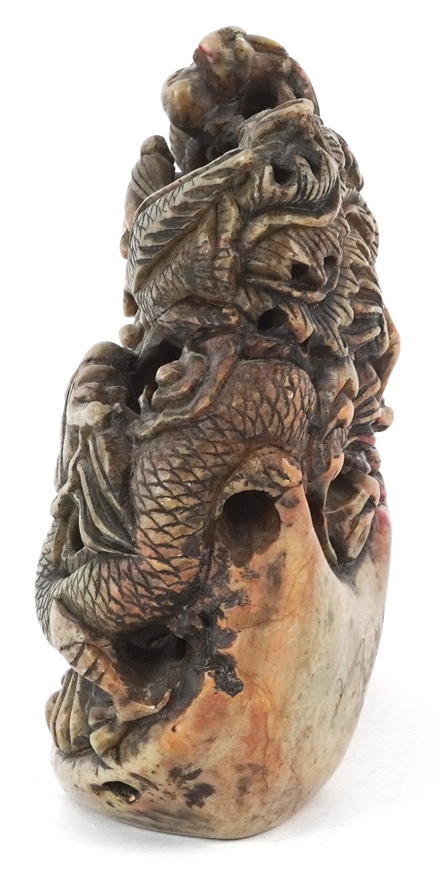 A Chinese soapstone carving of dragons and mythical creatures, character marks to the base, 13.5cm high.