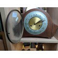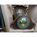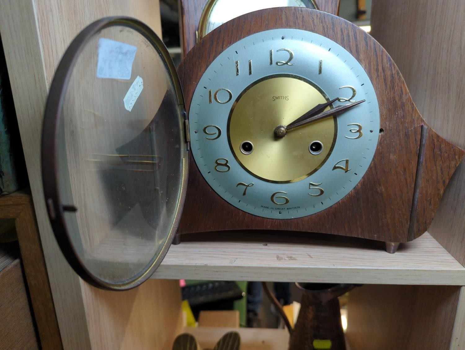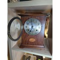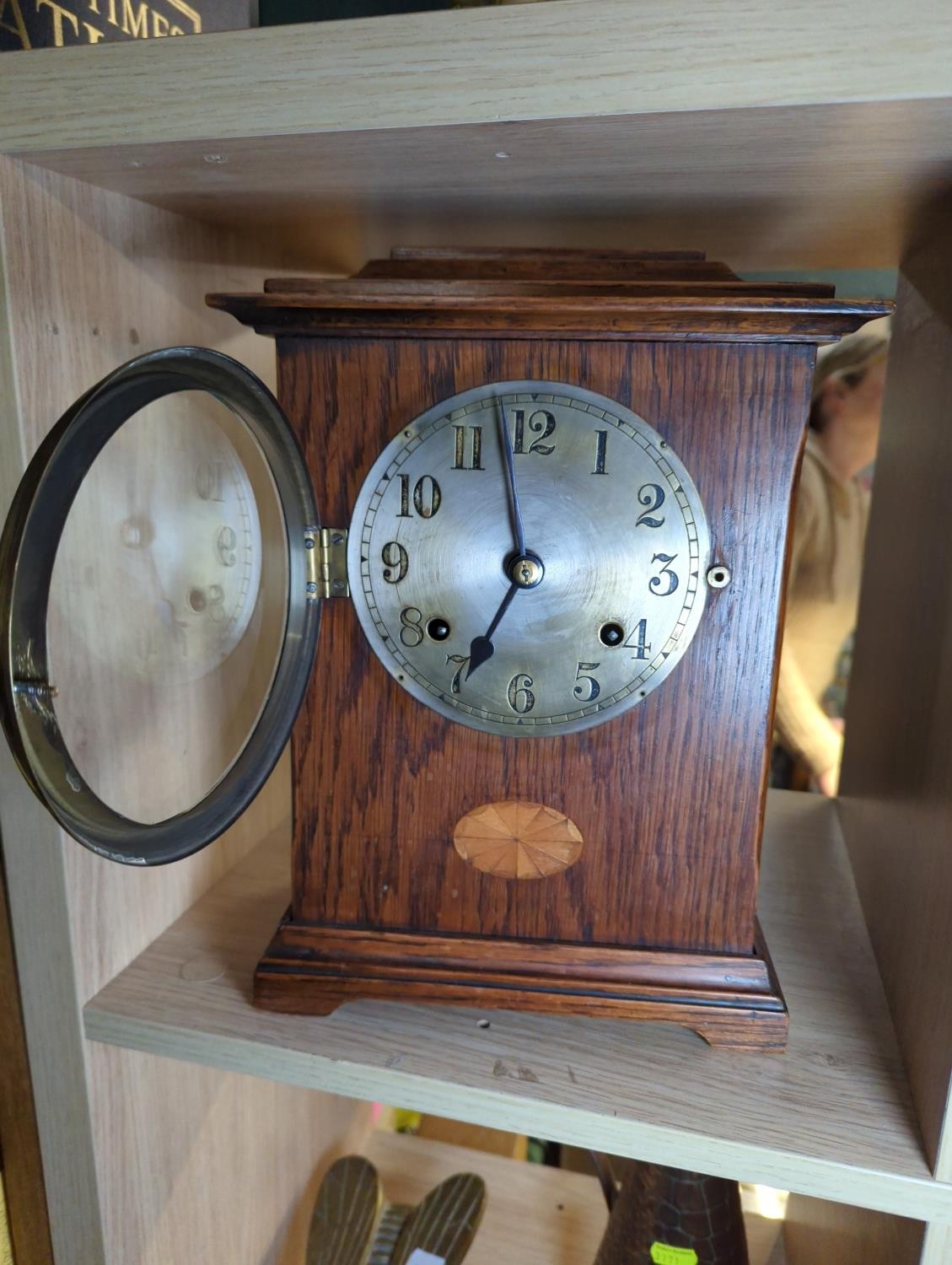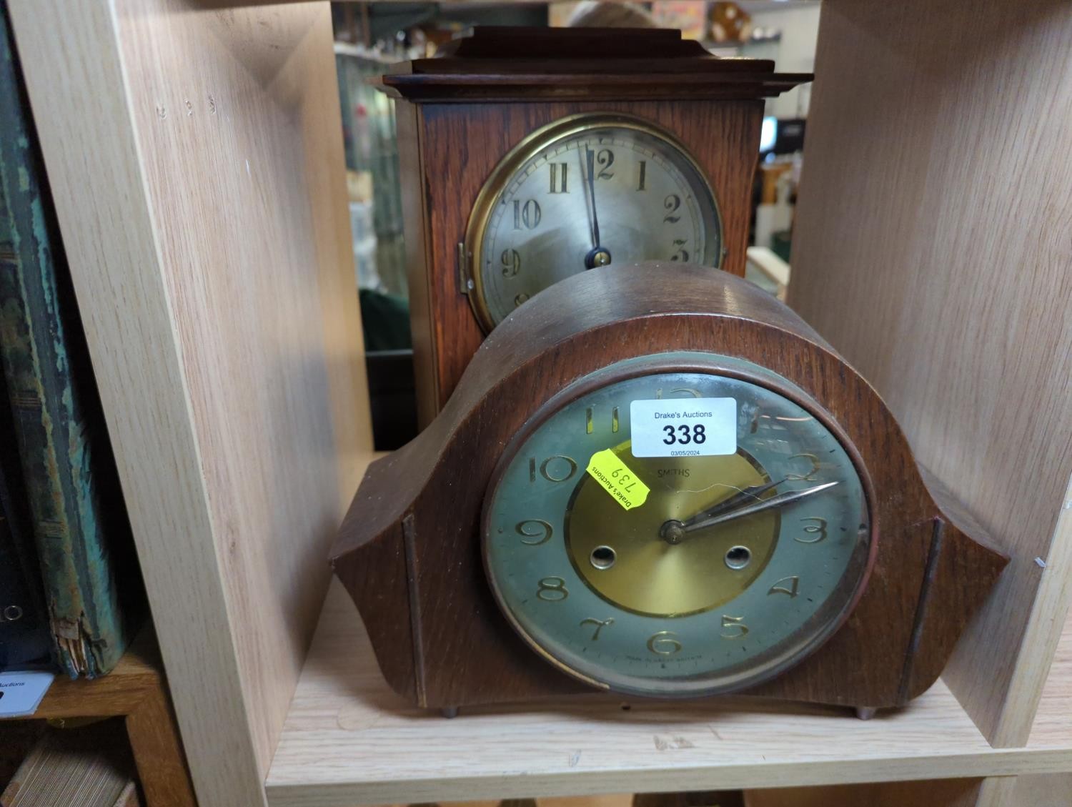 Smiths Art Deco mantle clock with key and pendulum, W29cm x H 21cm, together with an inlaid oak cased mantle clock, W 22cm x H 31cm
