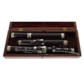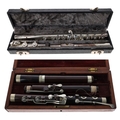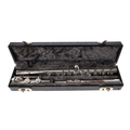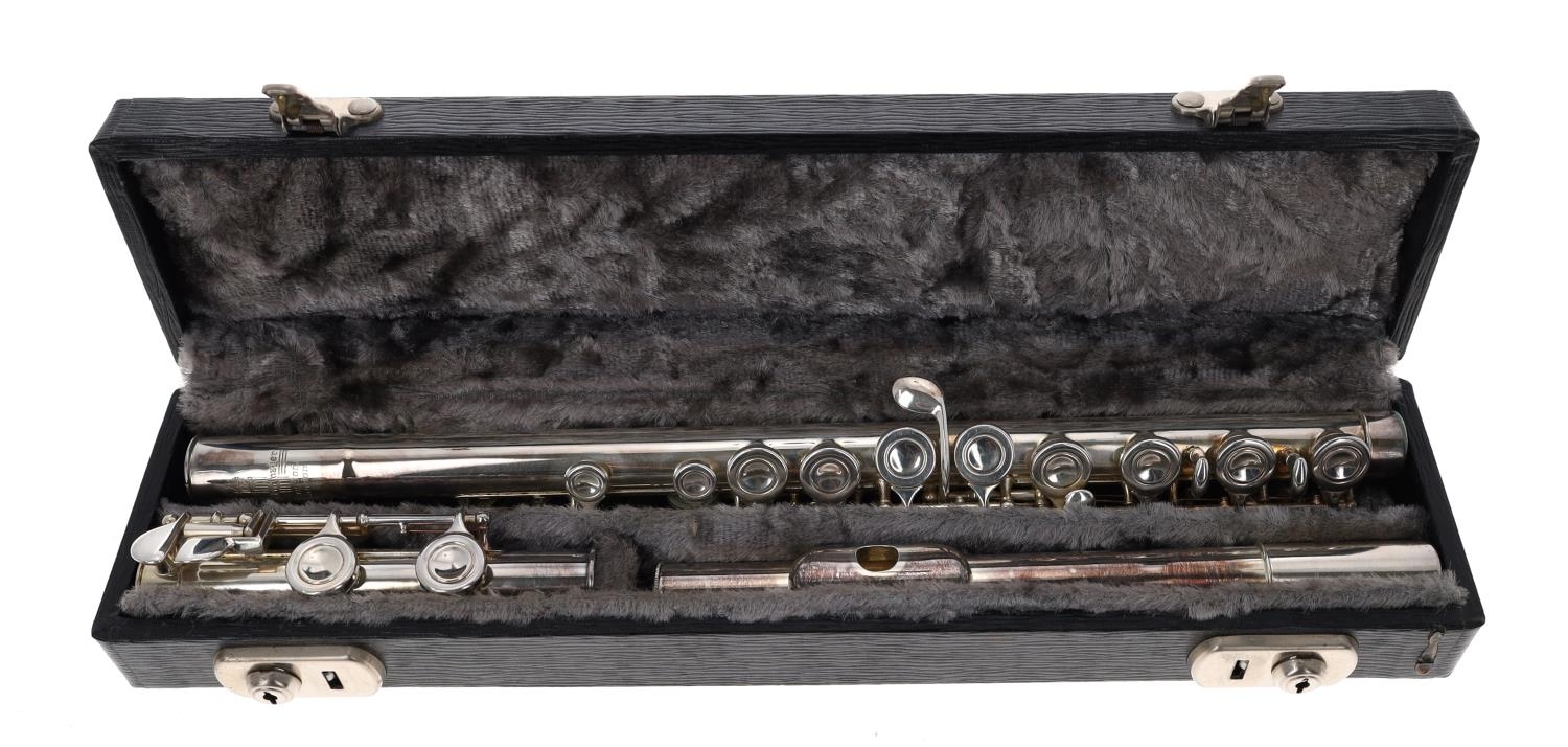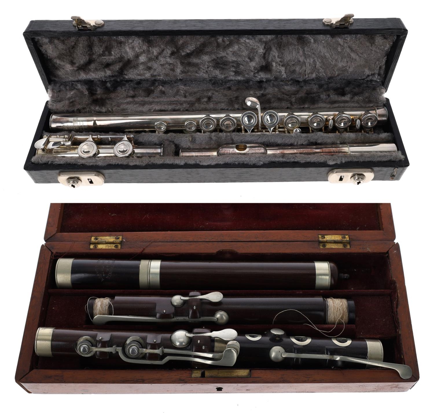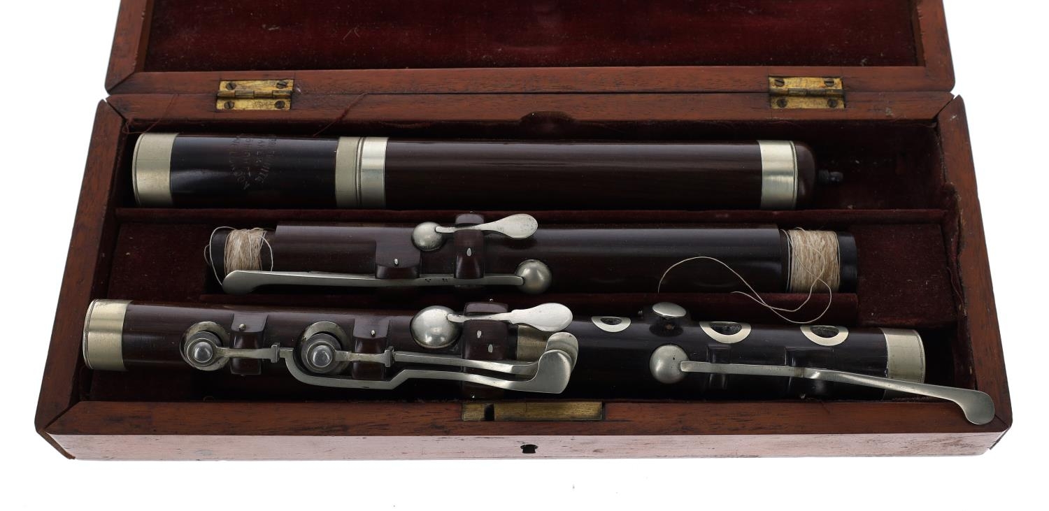 J.H. Ebblewhite rosewood flute with six salt spoon nickel keys on wooden blocks, stamped J.H. Ebblewhite Maker, 4 & 5 High Street, Aldgate, London, mahogany box; also a Westminster Besson of London silver plated flute, case (2)