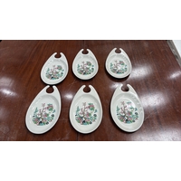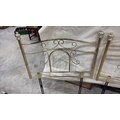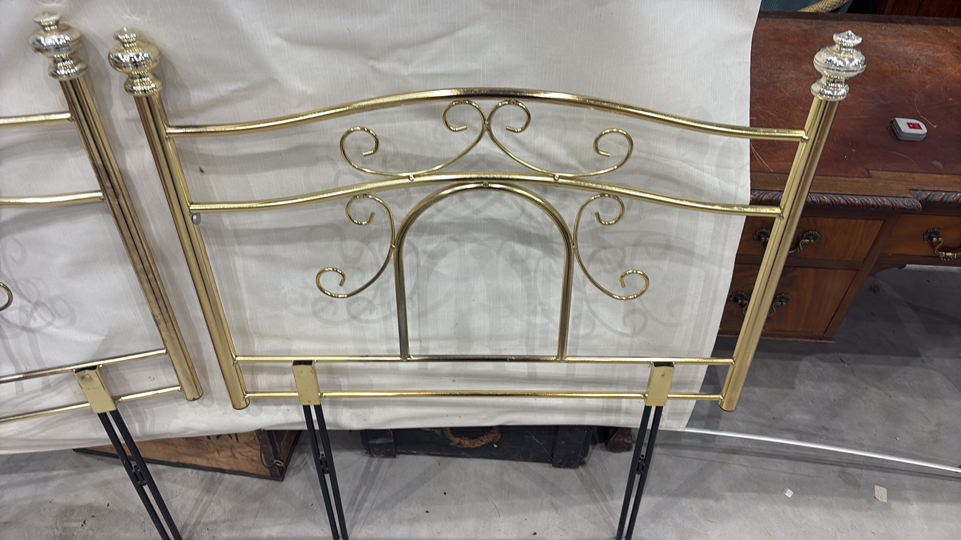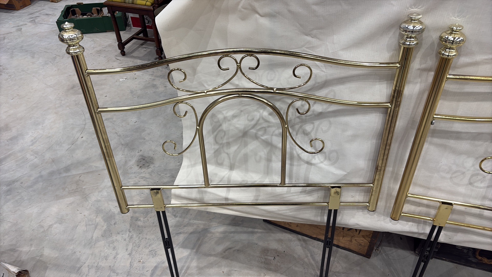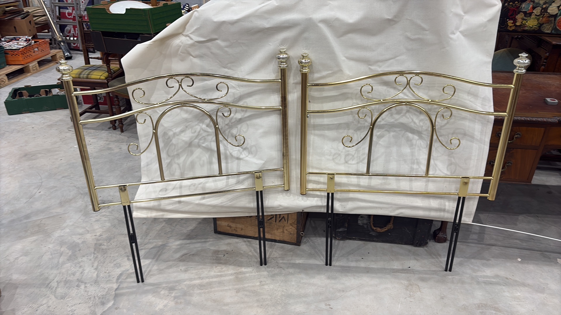 Pair of tubular brass-finish single bed headboards, each with scrolled openwork panels and urn finials, mounted on black metal side posts.