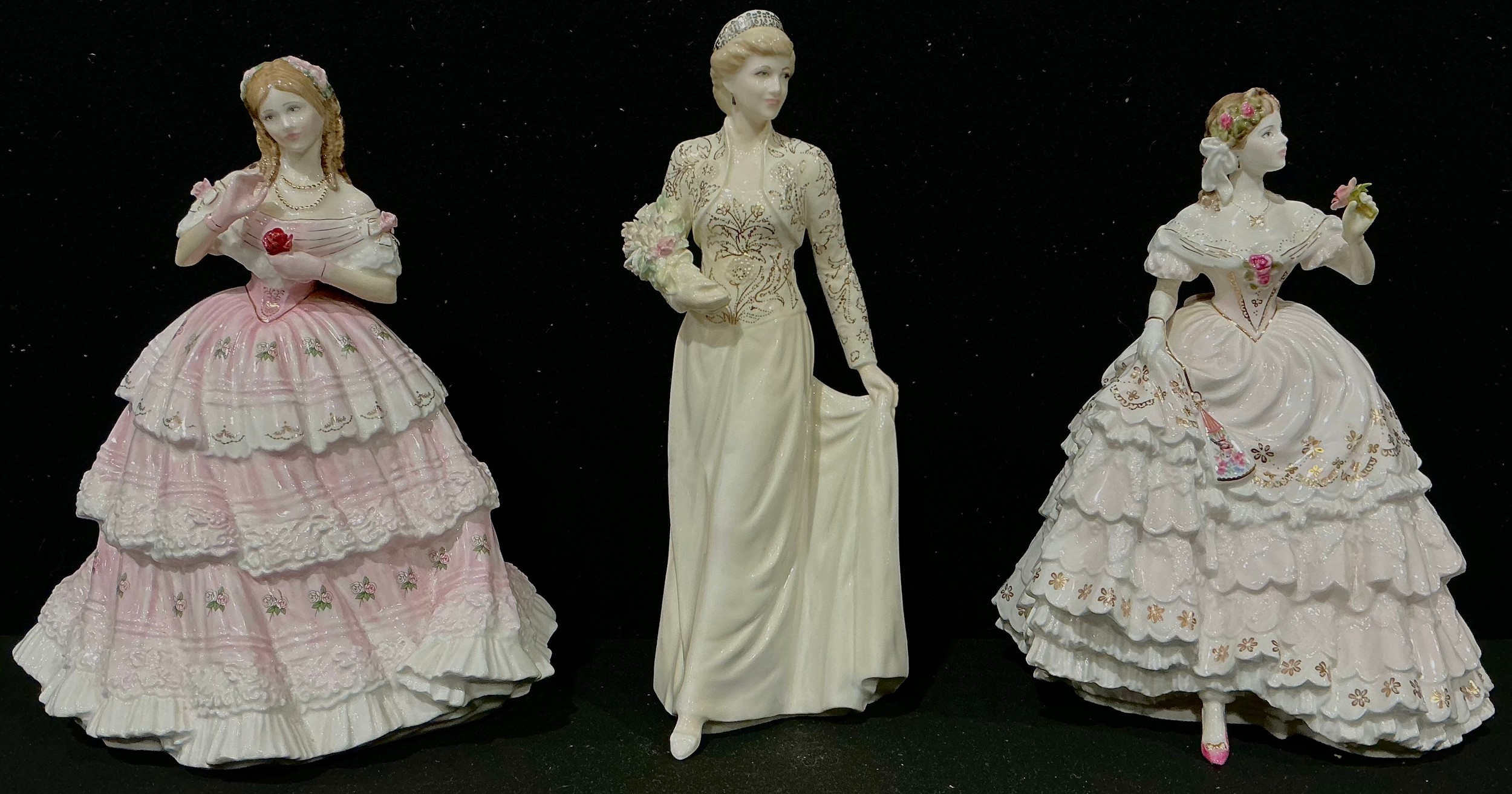 A Coalport figure, Diana Queen of the Crown, CW464, limited edition 5,436/9,500, 24cm high; a Royal Doulton figure, Red Red Rose, HN 3994, from the Language of Love collection, limited edition 4,491/12,500, 22.5cm high; a Royal Worcester figure, The Fairest Rose, limited edition 9,530/12,500, 22cm high (3)