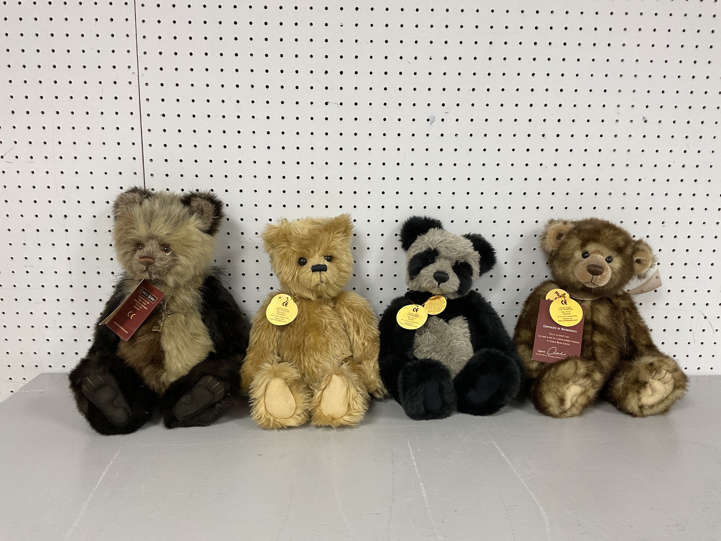 Four Charlie Bears Teddy Bears, With Name Tags. Comprising of "Shush" CB161685, "Ewan" CB183959, "Stevie" CB193905D, and "Andrew" CB173521B. Tallest Bear Approximately 14" Tall.