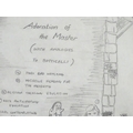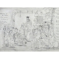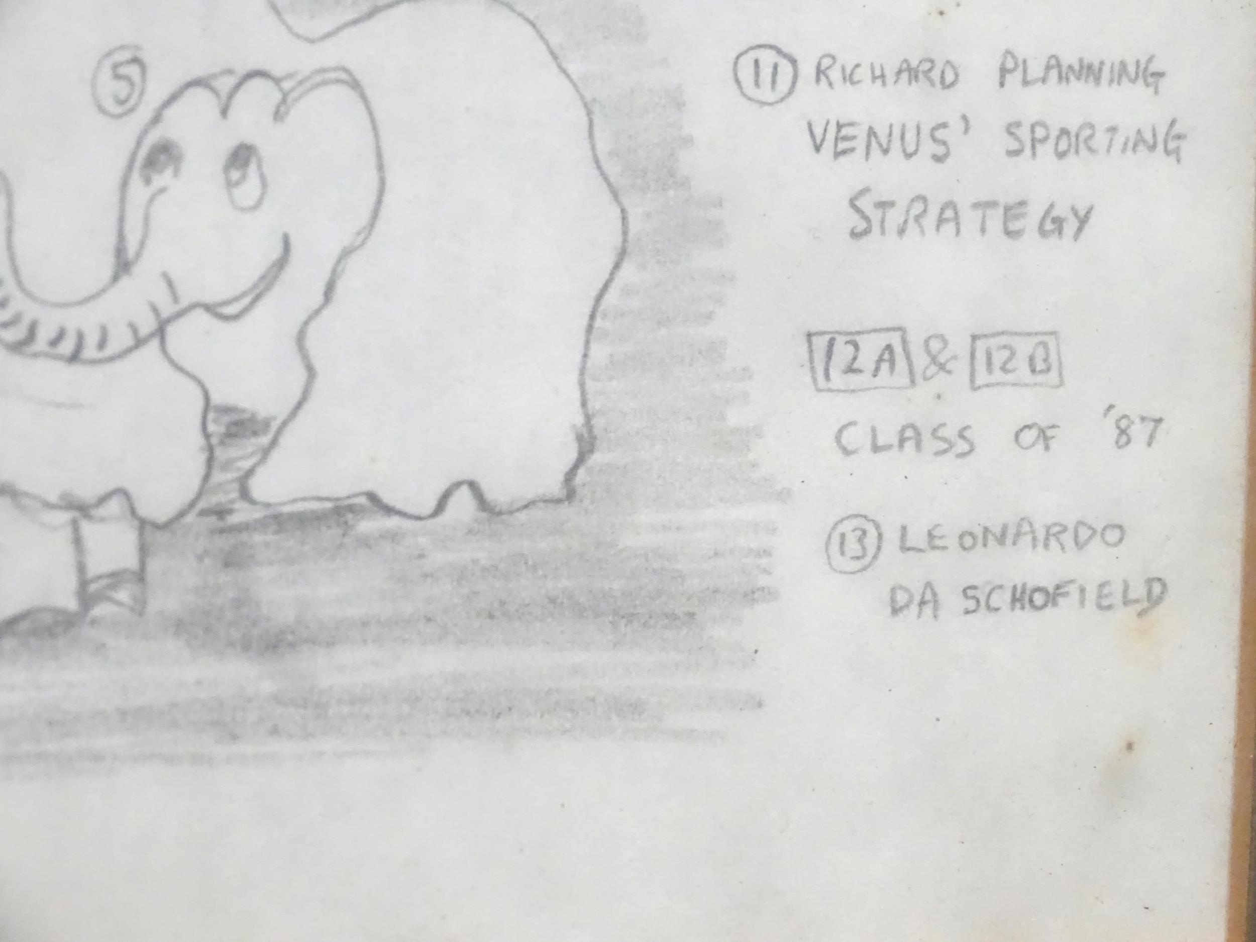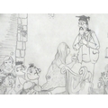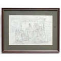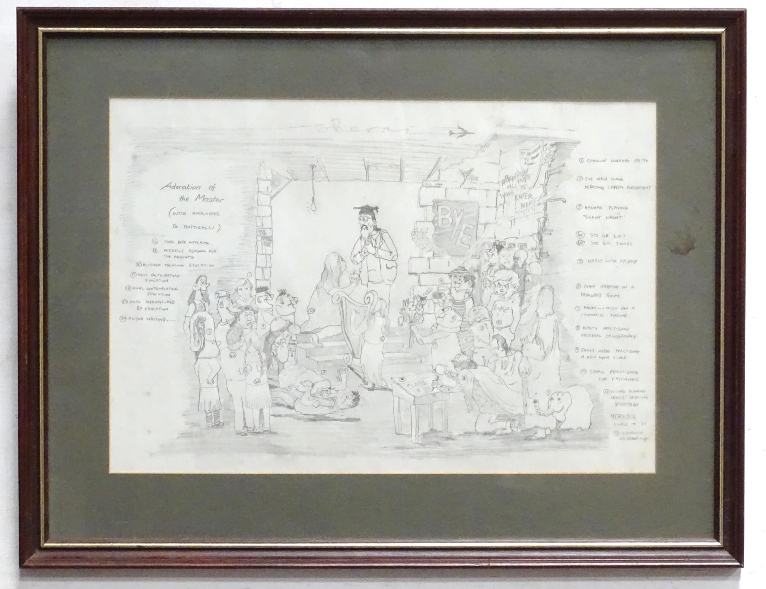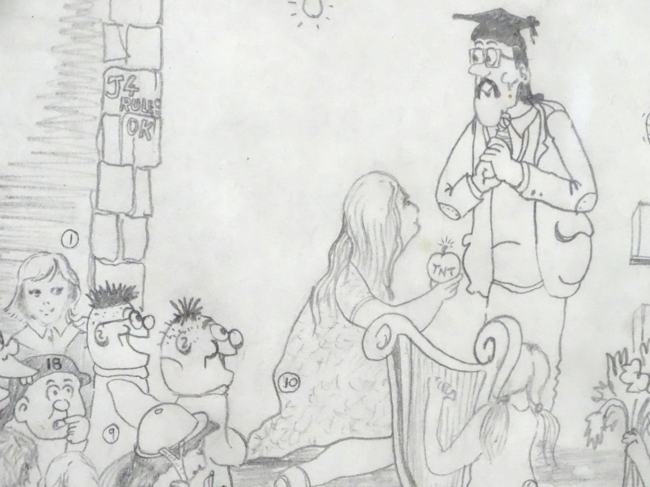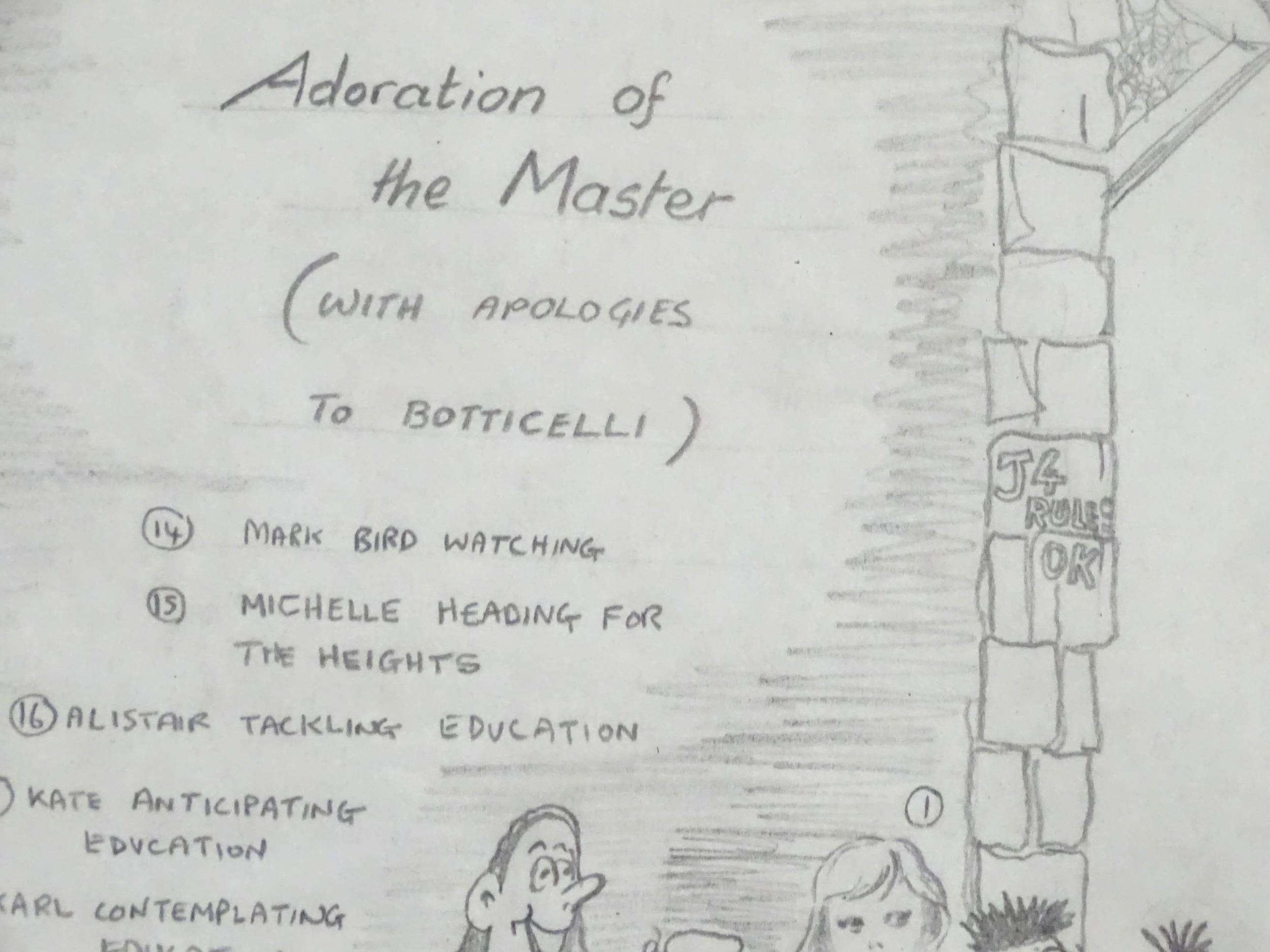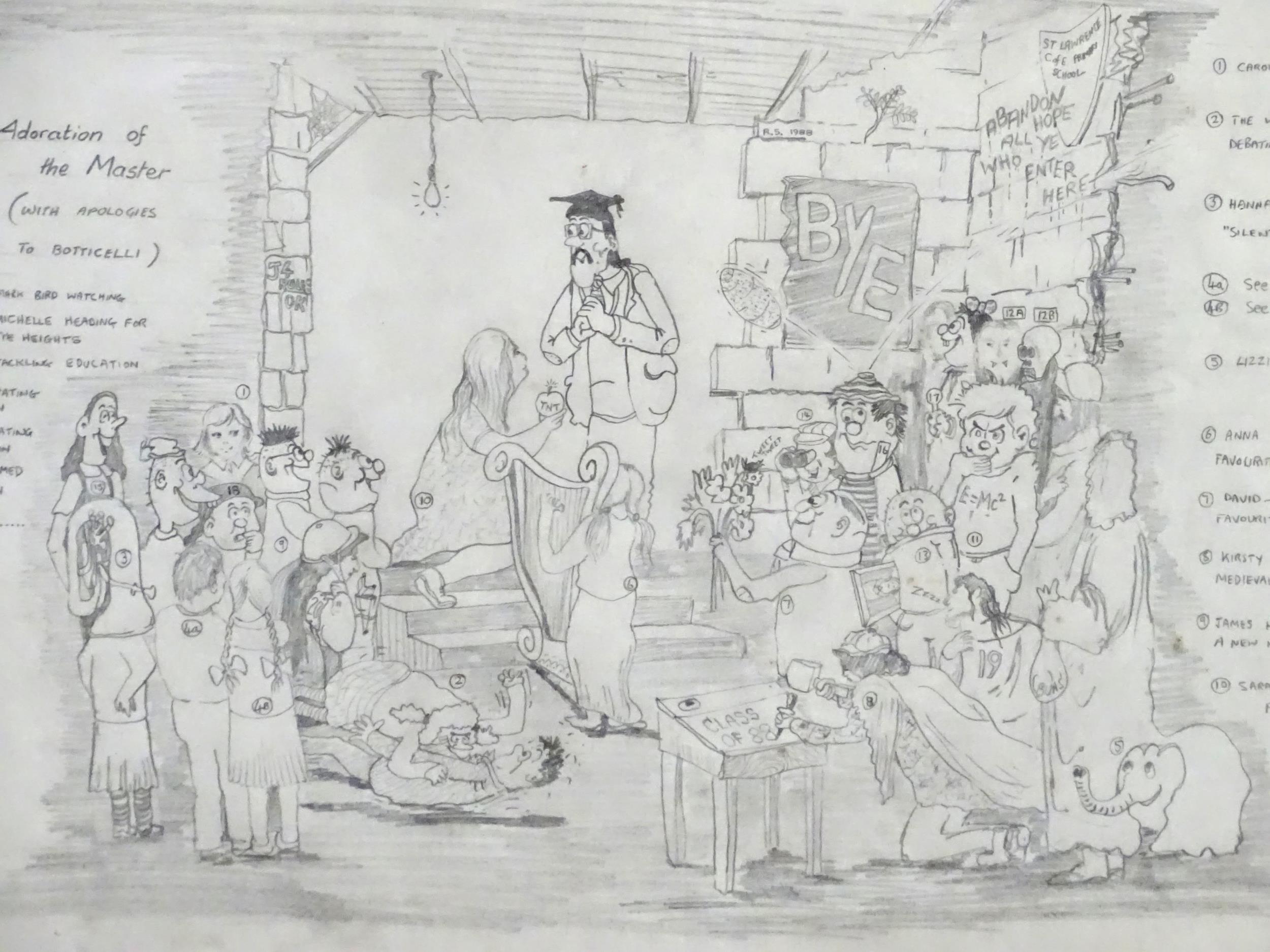 A late 20thC cartoon sketch of The Bash Street Kids titled Adorations of the Master. Signed with initials R. S. and dated 1988. Approx. 11" x 12 1/4"