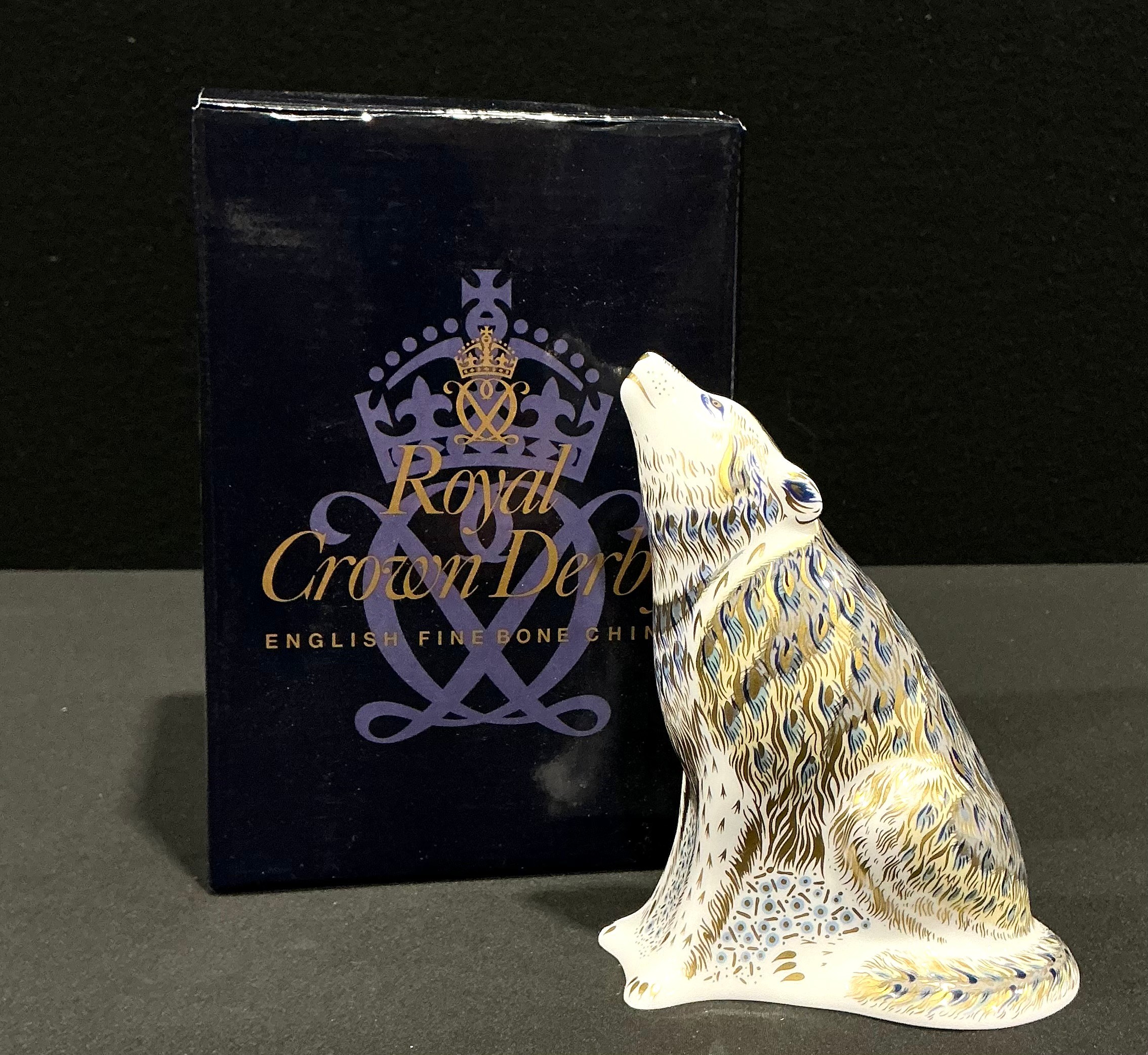 A Royal Crown Derby paperweight, Wolf, gold stopper, 14cm high, printed mark in red, boxed